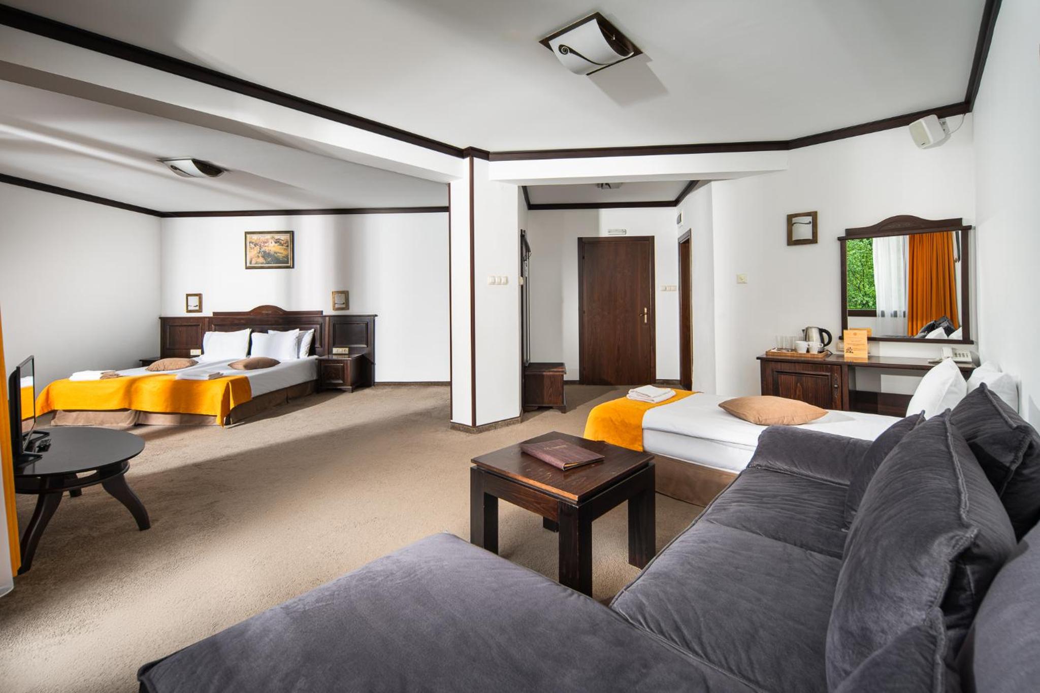 Хареса ни големината на стаите - 2 възръстни и 2 деца бяхме настанени в апартамент с хол и 2 спални, което надхвърли очакванията ни за запазеното пространство. Външният басейн е чист и с минерална вода, разделен е на няколко части с различна температура и може да се ползва дори през зимата. Хотелът е в гората и е доста тихо и спокойно в и около него.