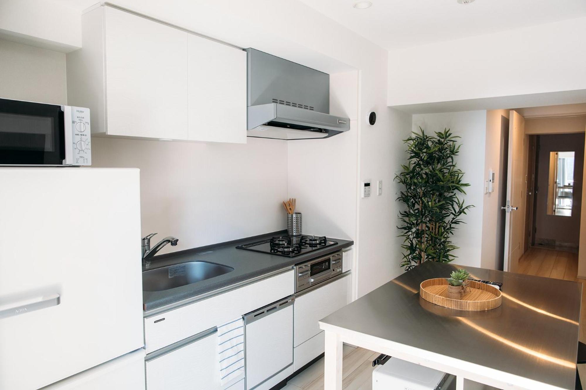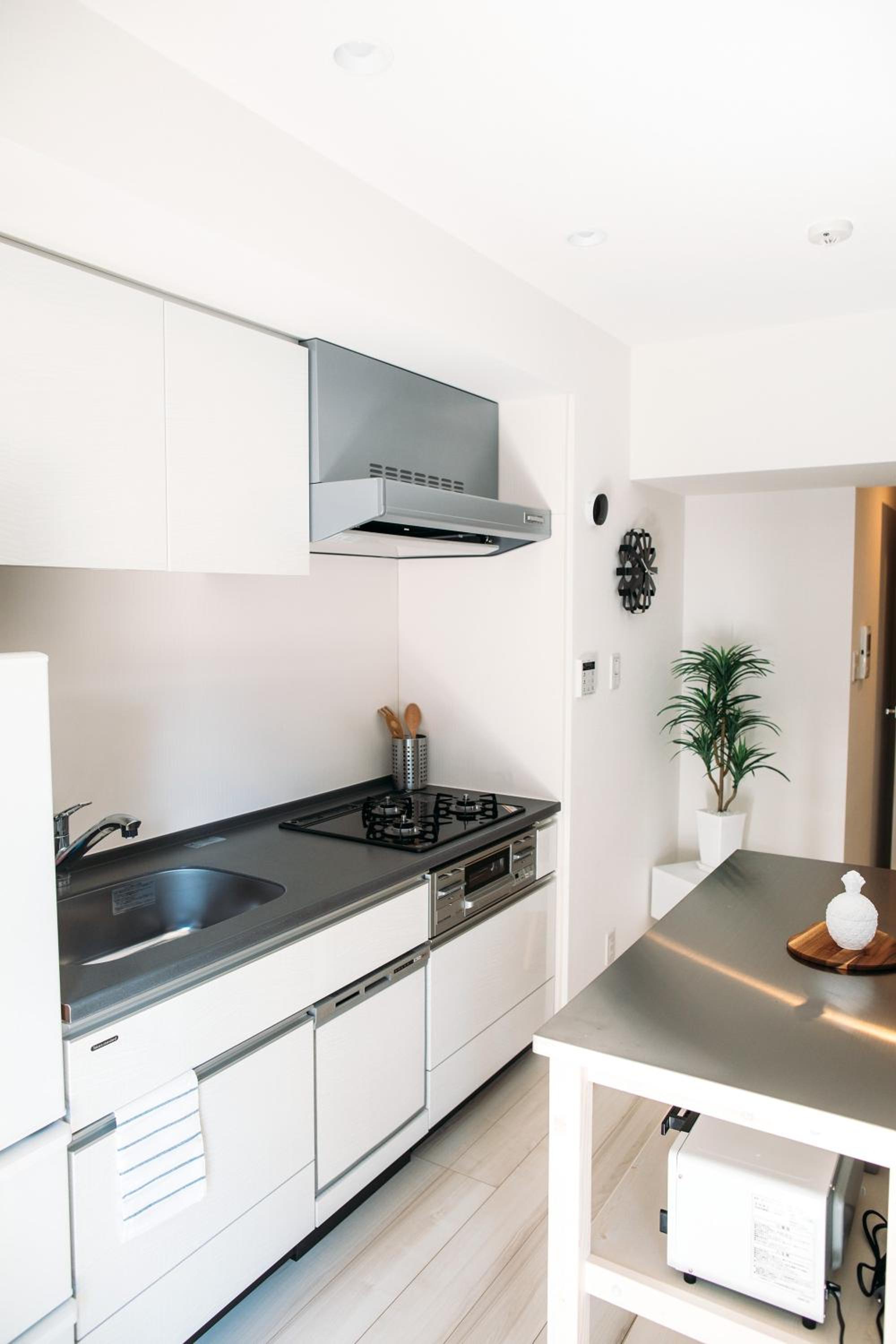 原來雙人床的房型只有一條羽絨被,入住前有溝通希望可以自費增加一床棉被,對方回覆會試看看能否準備,如果有提供需要自費2000日元,我們回覆沒有問題。但現場並沒有新增被子,我們立即溝通此事但對方並沒有回應...隔一天只好自己去無印良品買一條毯子,以免入住多天會嚴重影響睡眠品質。廚房有三個爐台,很好使用,但只有提供一個小的無蓋平底鍋(有明顯的刮痕)和一個有蓋小湯鍋...我們在附近的大創買了一些廚房用的抹布、小平底鍋、拖鞋、晾衣架、入浴椅、舀水瓢,這些對我們很需要的小物讓我們在入住七天期間比較方便,建議房源中應該要有準備。