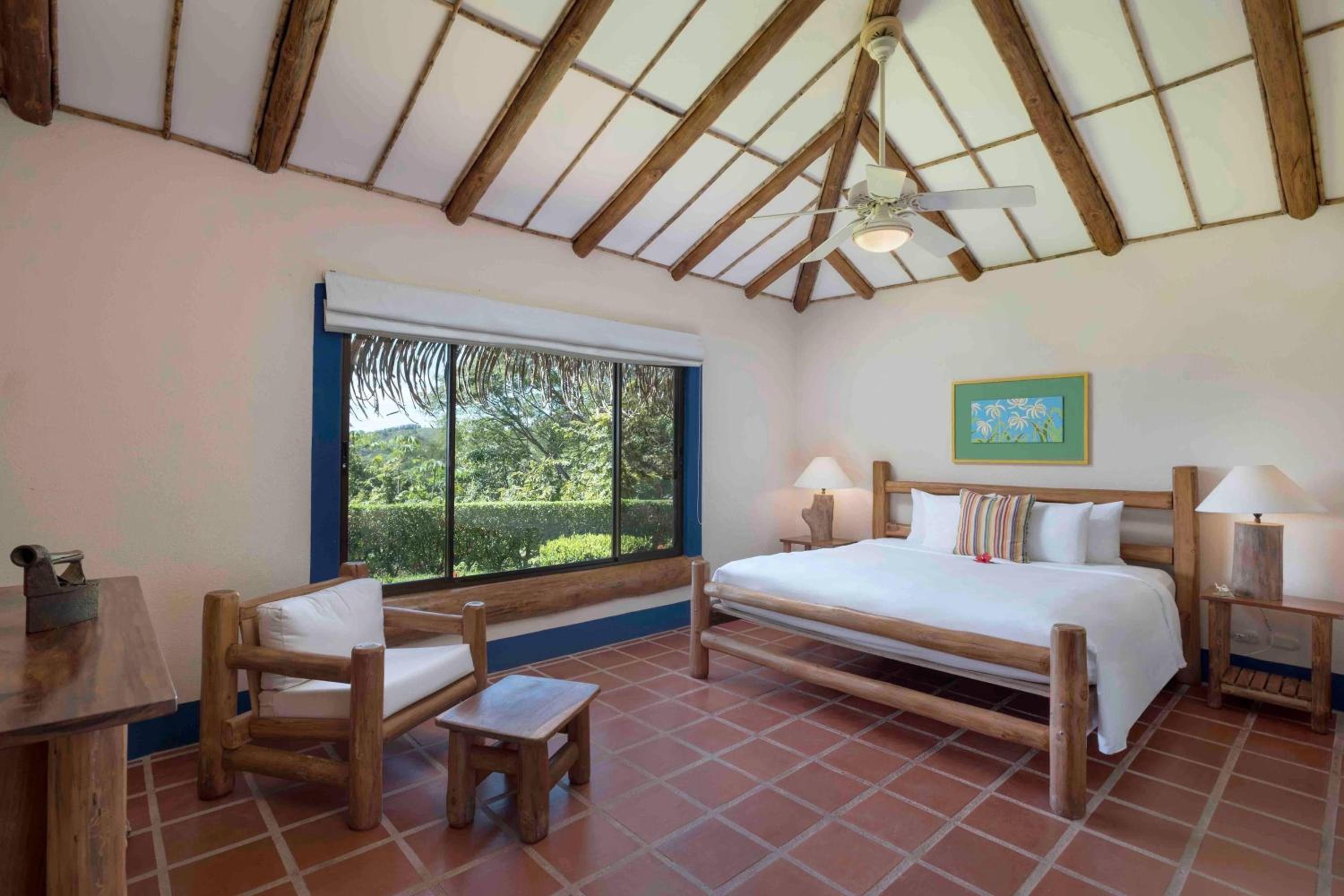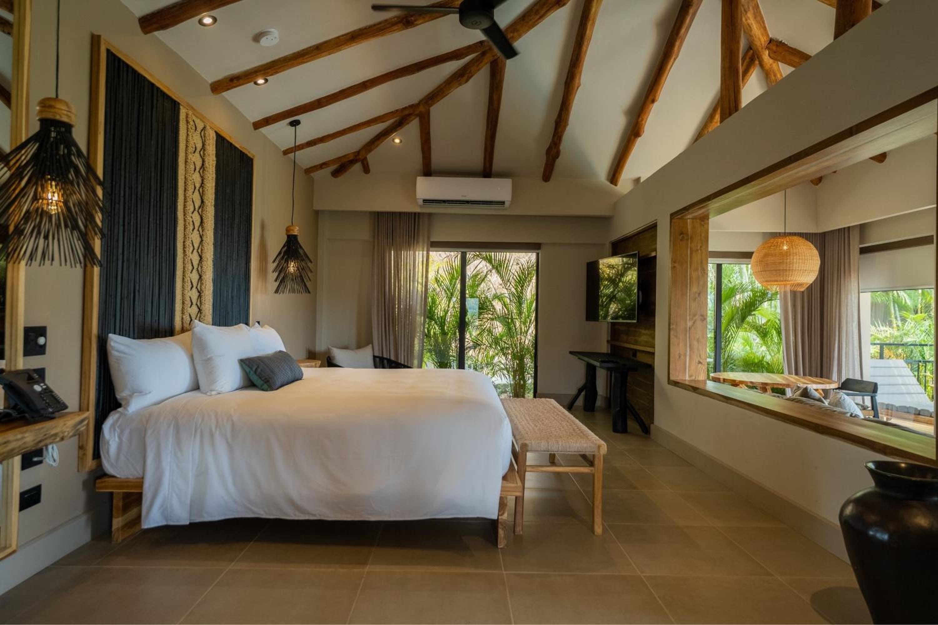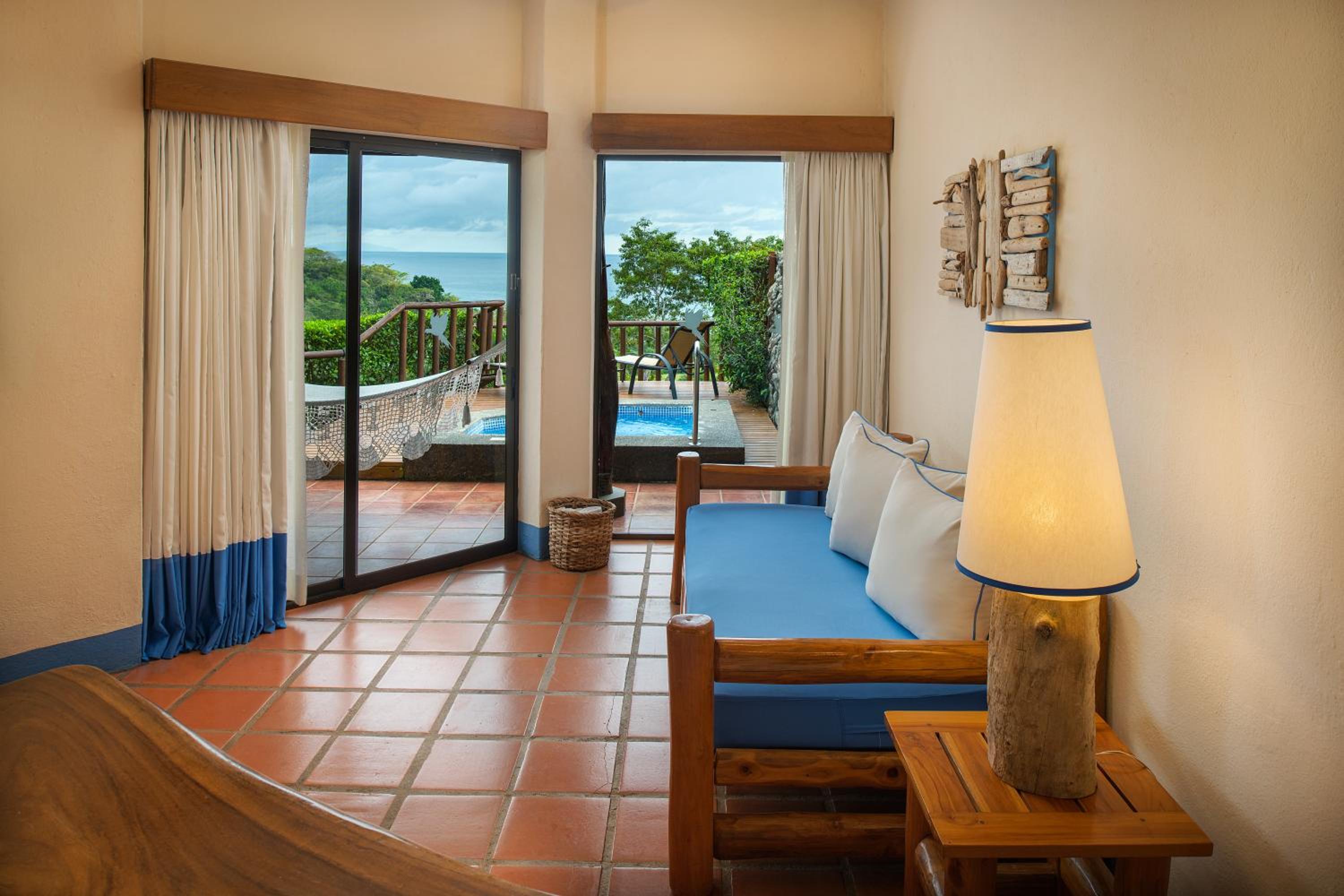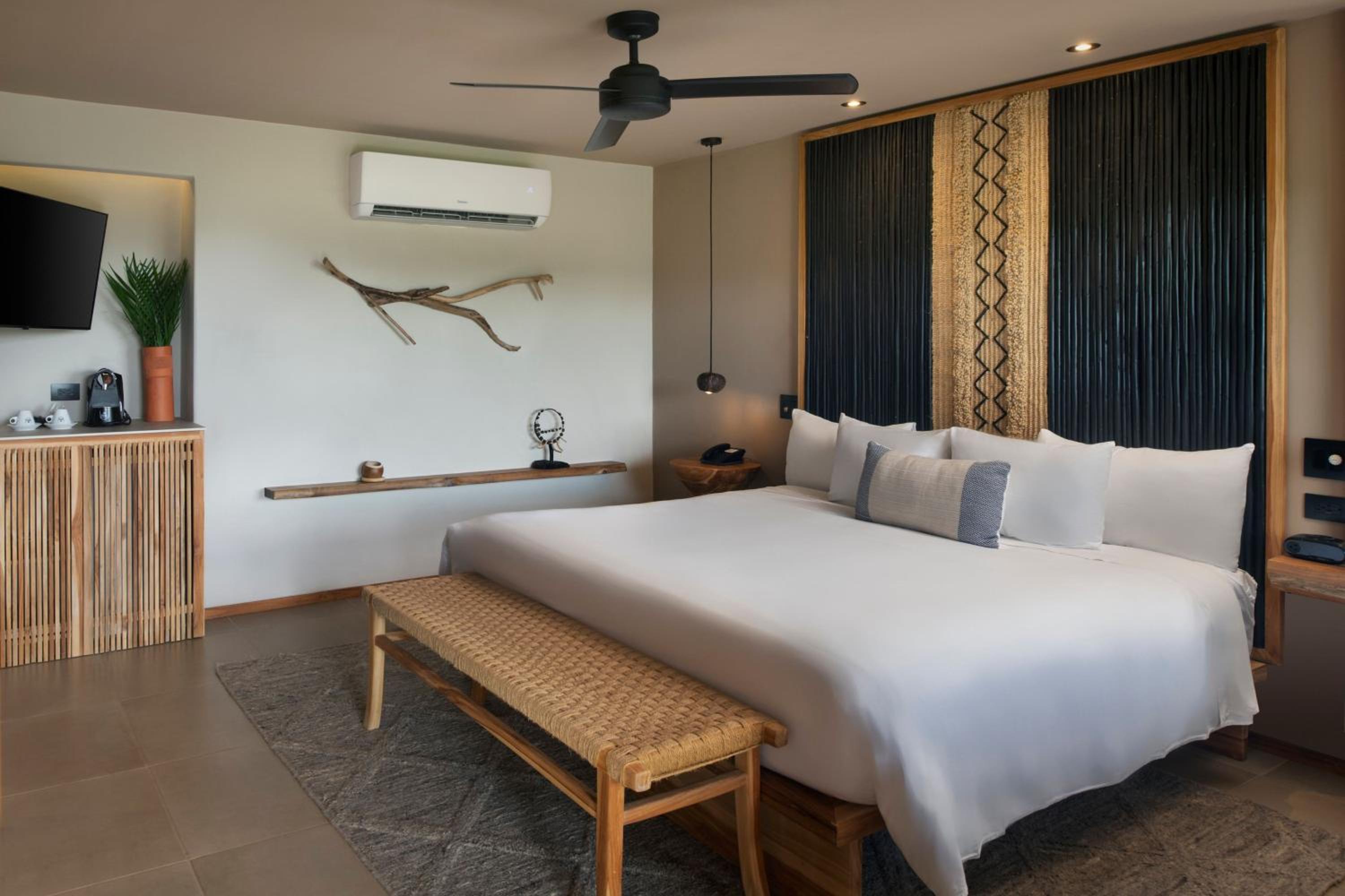 Hotel Punta Islita Autograph Collection offers elegantly decorated rooms and suites with modern amenities including satellite/cable TV, minibar, and coffee maker. The wooden décor and tiled floors create a warm and inviting atmosphere for guests to relax and unwind.