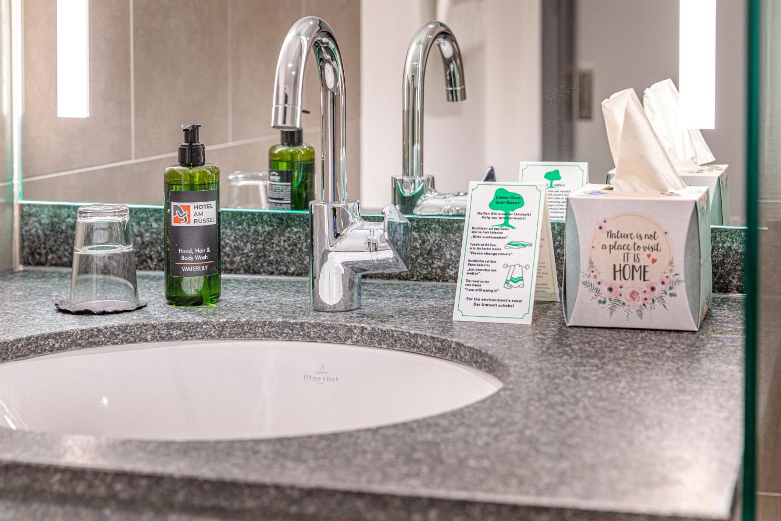 The Hotel am Rüssel offers air-conditioned rooms equipped with modern amenities such as a desk, safety deposit box, and a flat-screen TV. Guests can unwind in the private bathroom with a refreshing shower. The rooms are thoughtfully furnished with cozy bed linen and plush towels for a comfortable stay.