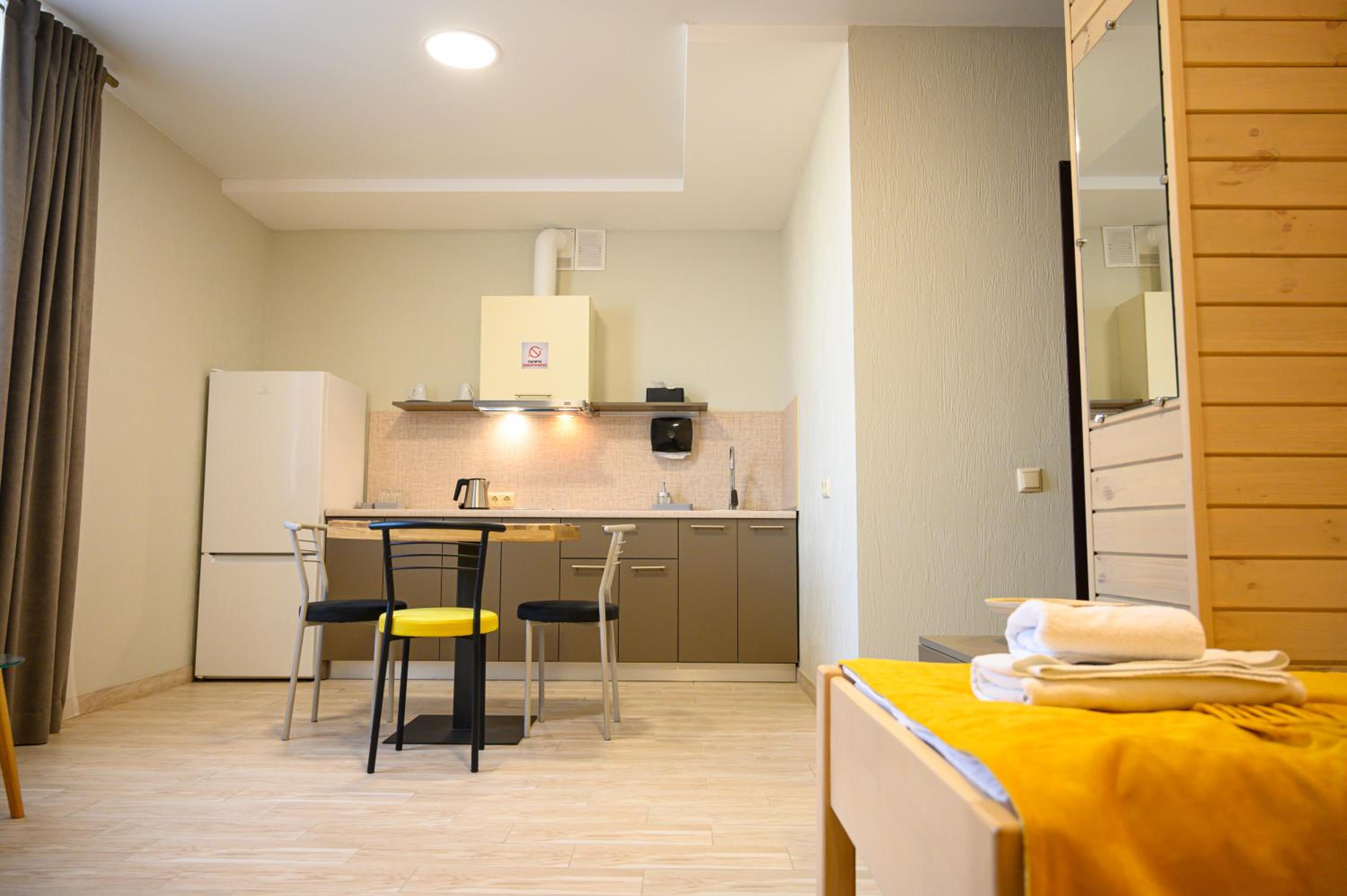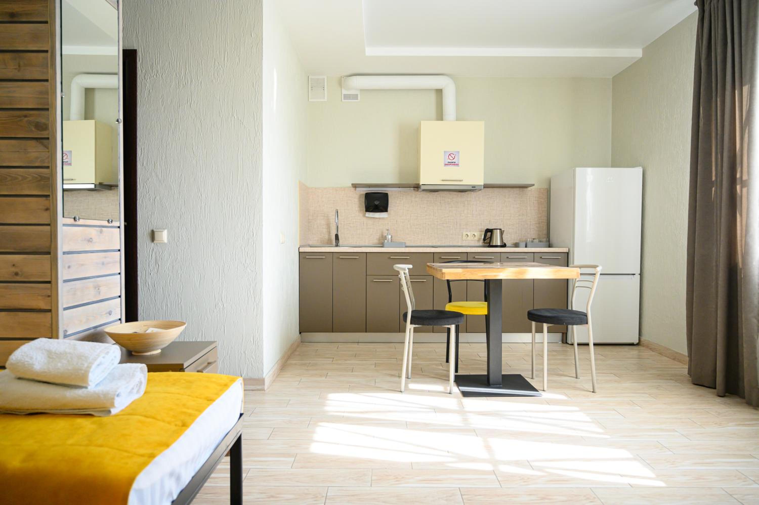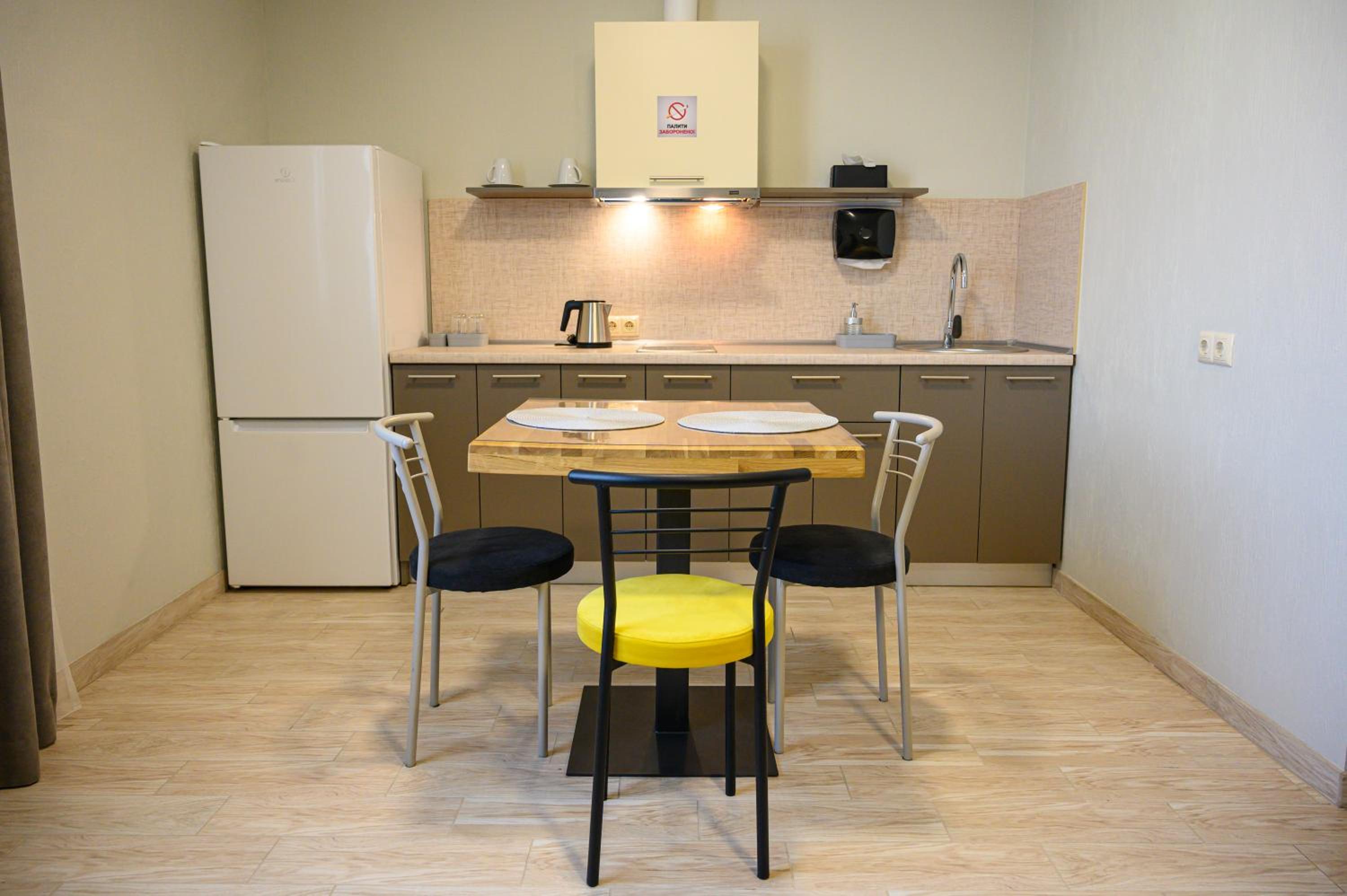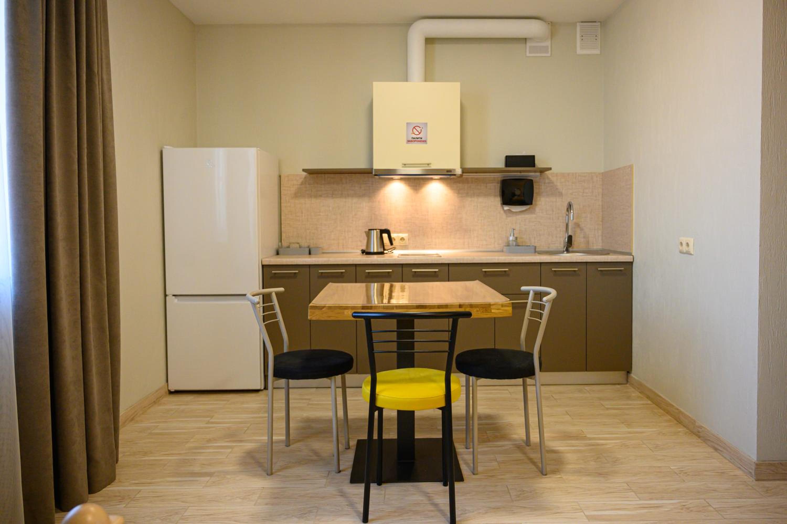Повноцінна кухонна поверхня, з електроплитою, сковорідкою, каструлею,набором посуду, місткий холодильник з морозилкою (не мінібар, як зазвичай у готелях), обідній стіл+ 3 шт.стільці, два журнальних столики і тумба! - місць для зберігання вдосталь! І великий платний шкаф для одягу+ по 3 вішачки на особу. Це стандартний двомісний номер! Електрочайник теж був, праску за моїм проханням нам віддали у номер. Загалом все супер! Тихо, чисто, добре пахне, для гостей працює спортзала; прекрасні дуже ситні сніданки👍рівня ресторану.