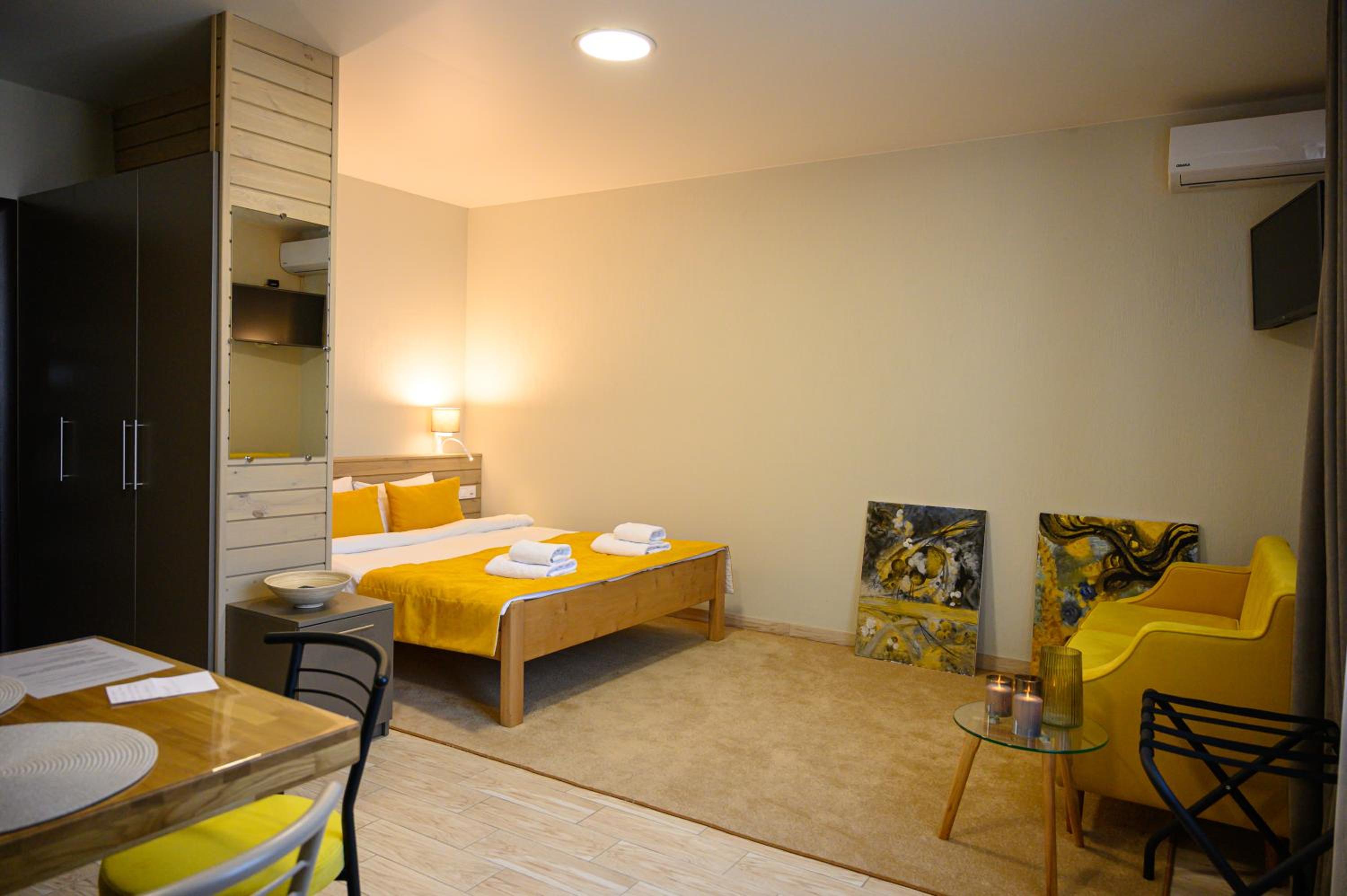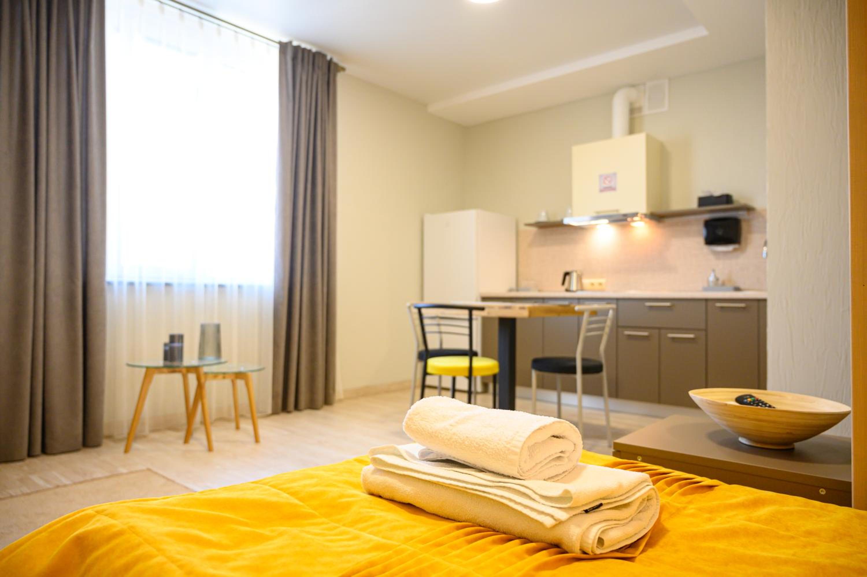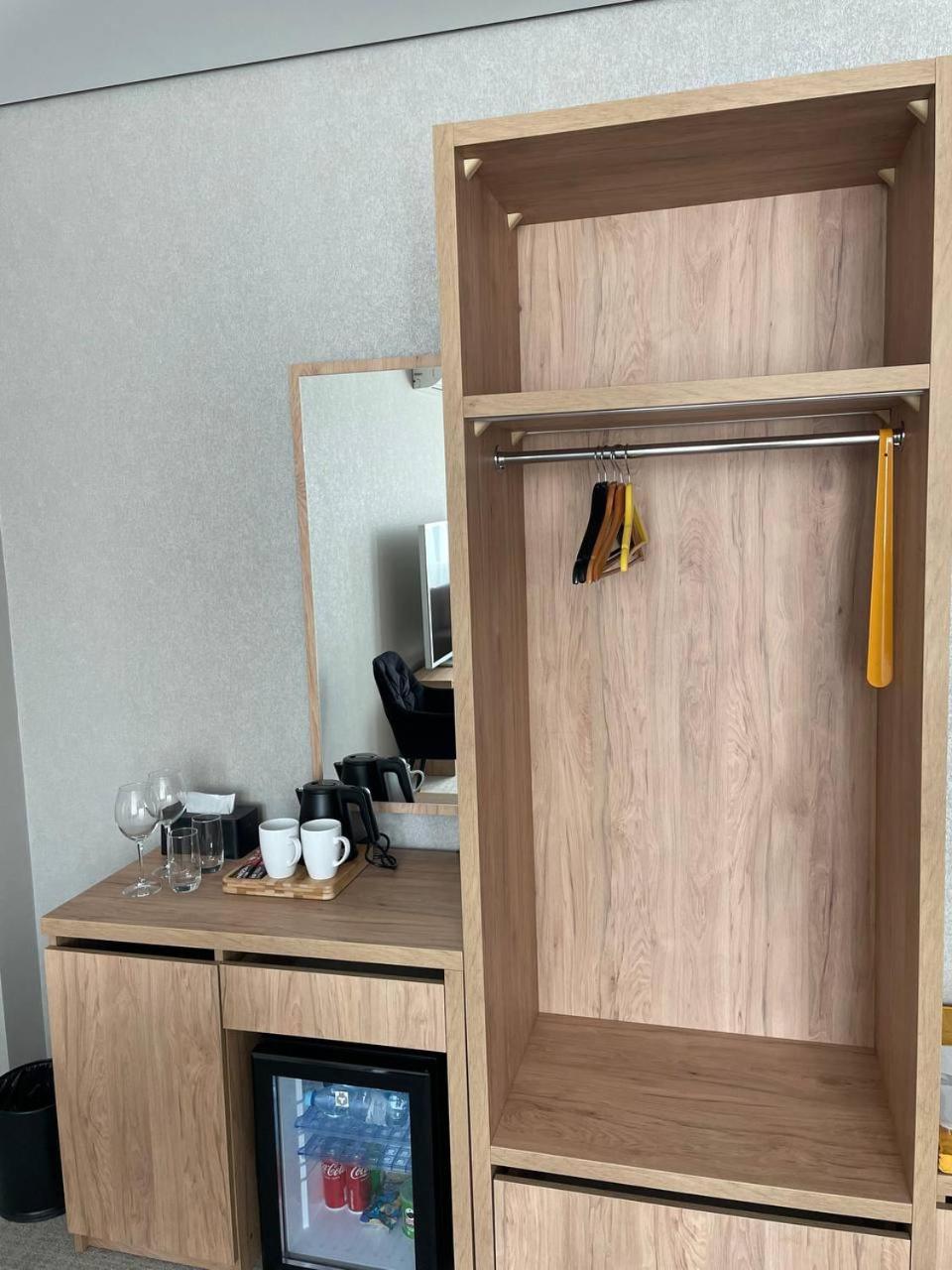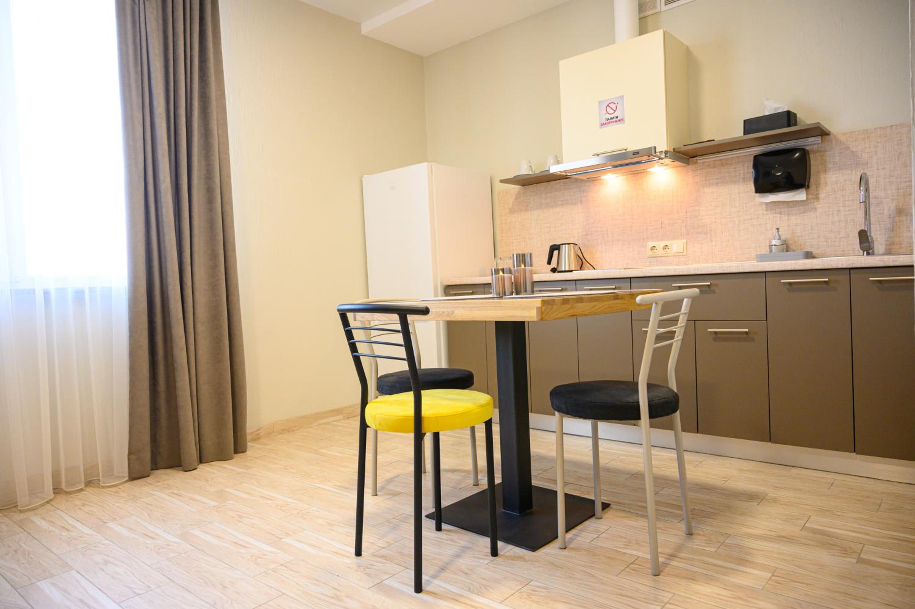 Повноцінна кухонна поверхня, з електроплитою, сковорідкою, каструлею,набором посуду, місткий холодильник з морозилкою (не мінібар, як зазвичай у готелях), обідній стіл+ 3 шт.стільці, два журнальних столики і тумба! - місць для зберігання вдосталь! І великий платний шкаф для одягу+ по 3 вішачки на особу. Це стандартний двомісний номер! Електрочайник теж був, праску за моїм проханням нам віддали у номер. Загалом все супер! Тихо, чисто, добре пахне, для гостей працює спортзала; прекрасні дуже ситні сніданки👍рівня ресторану.
