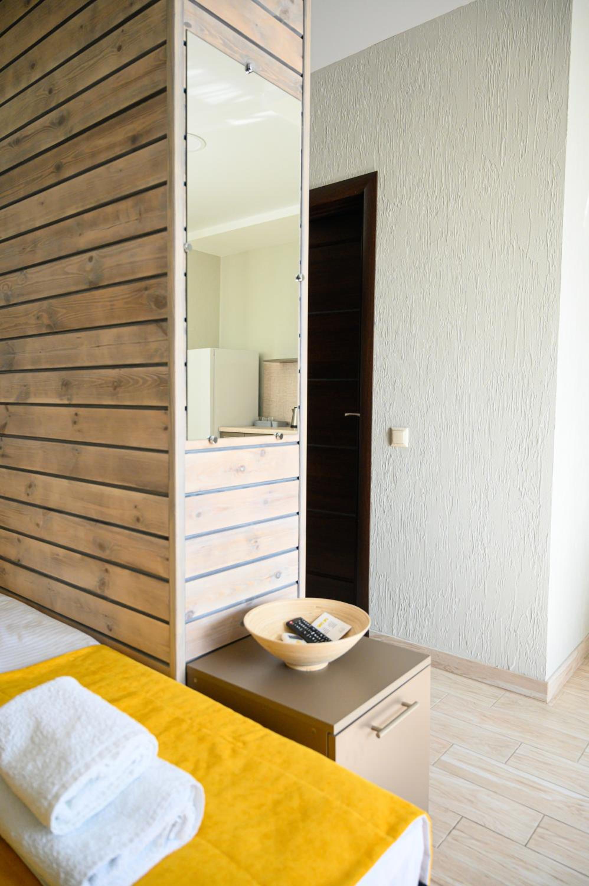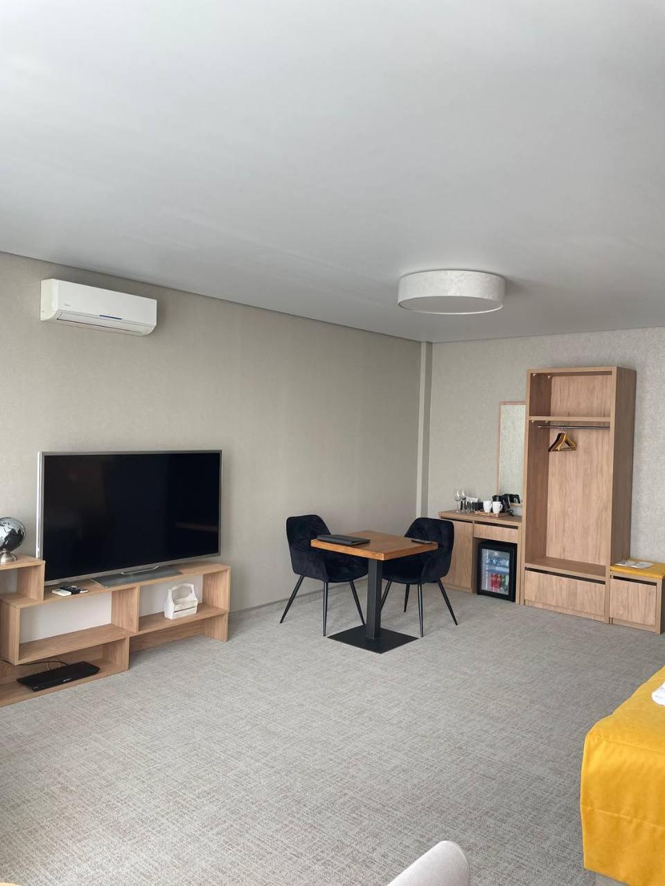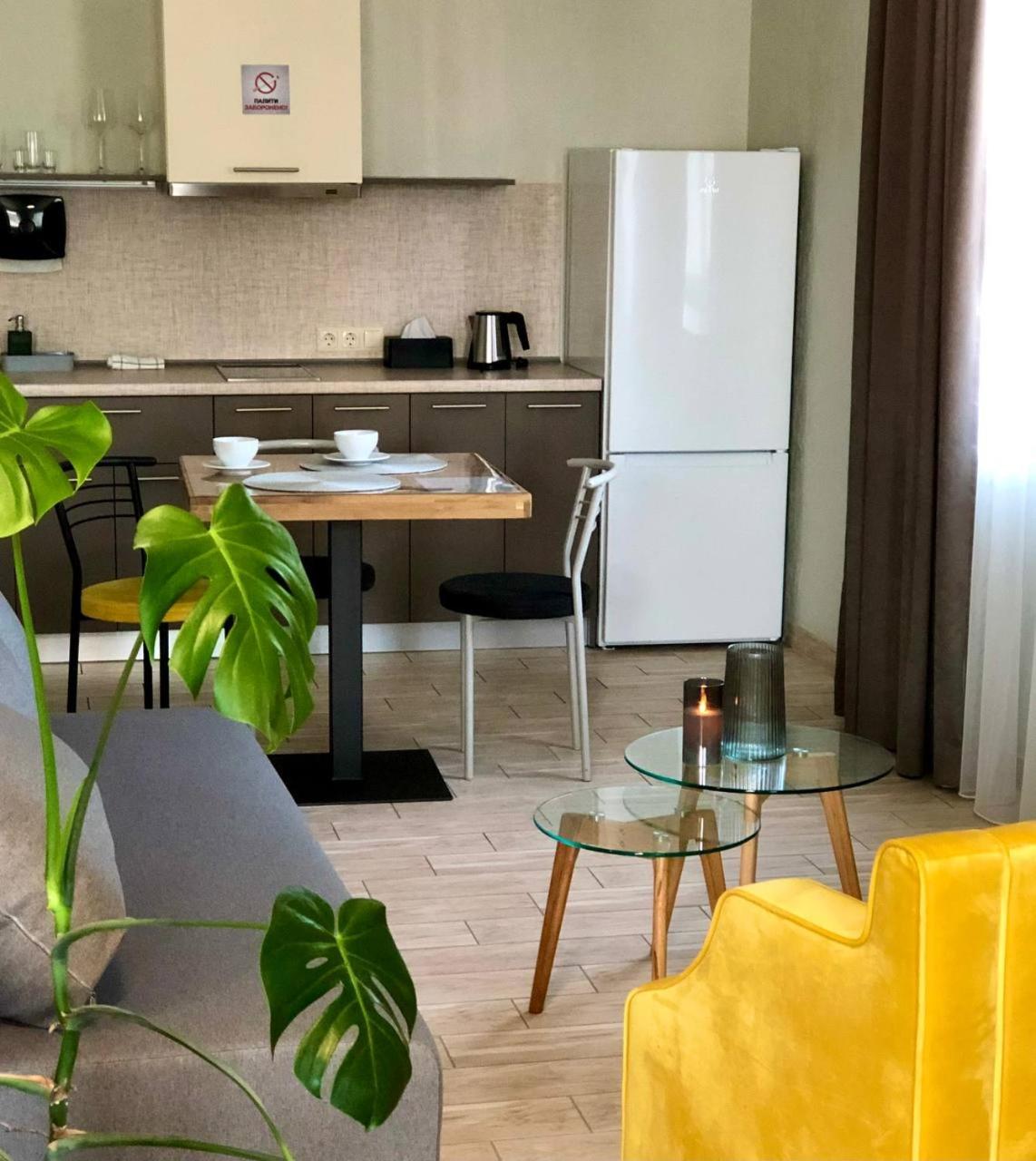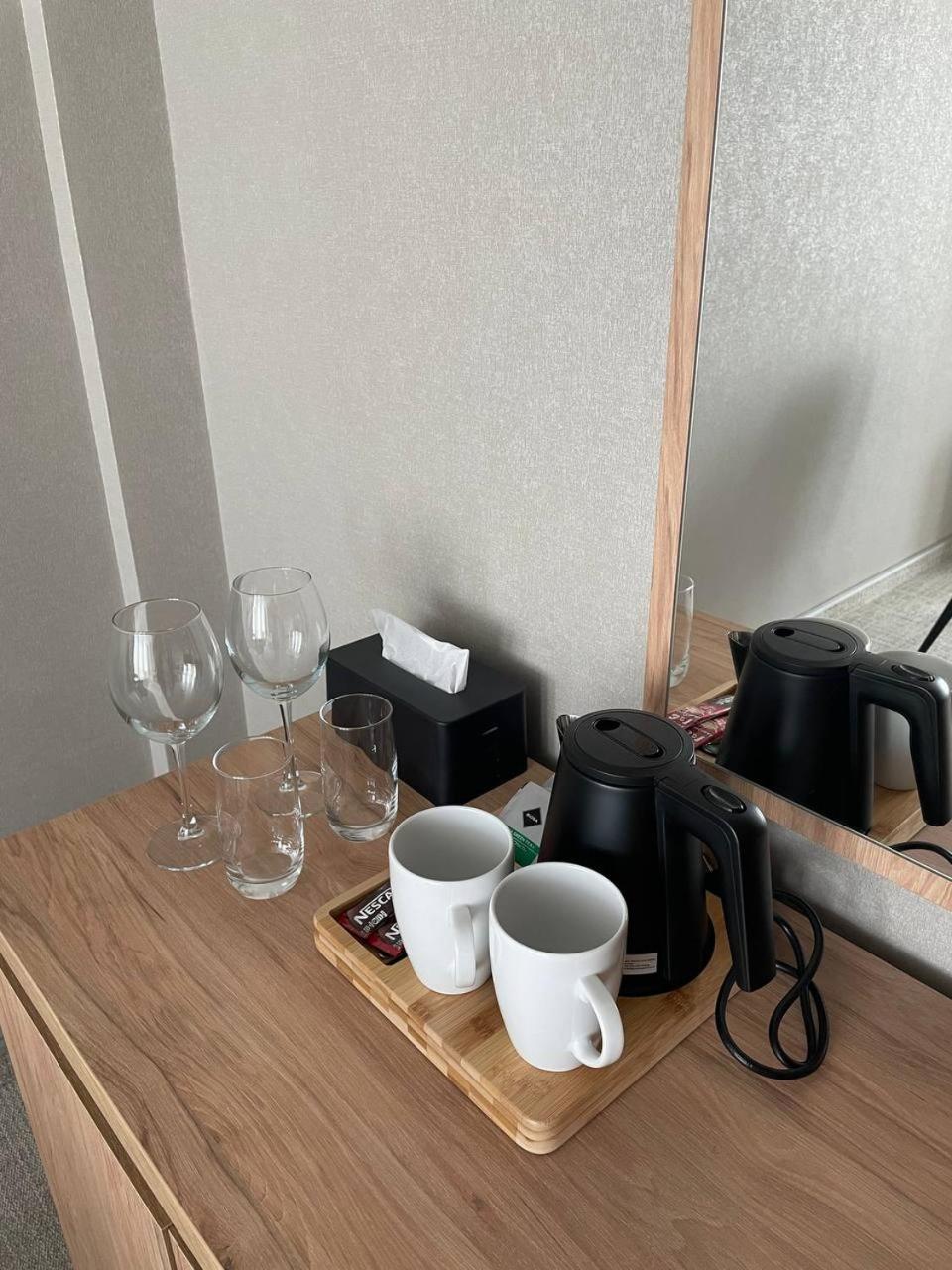 Повноцінна кухонна поверхня, з електроплитою, сковорідкою, каструлею,набором посуду, місткий холодильник з морозилкою (не мінібар, як зазвичай у готелях), обідній стіл+ 3 шт.стільці, два журнальних столики і тумба! - місць для зберігання вдосталь! І великий платний шкаф для одягу+ по 3 вішачки на особу. Це стандартний двомісний номер! Електрочайник теж був, праску за моїм проханням нам віддали у номер. Загалом все супер! Тихо, чисто, добре пахне, для гостей працює спортзала; прекрасні дуже ситні сніданки👍рівня ресторану.