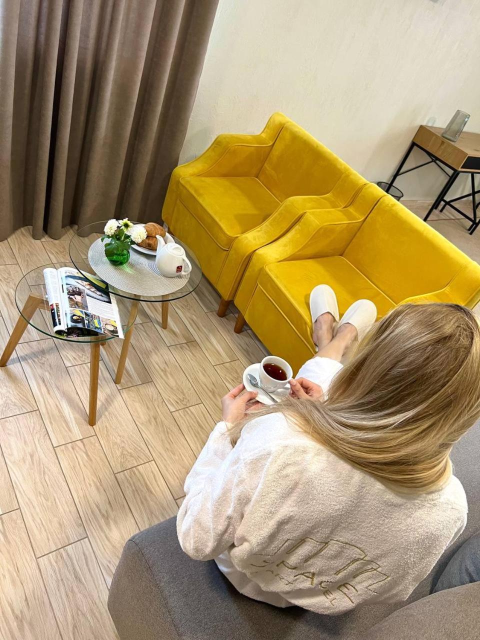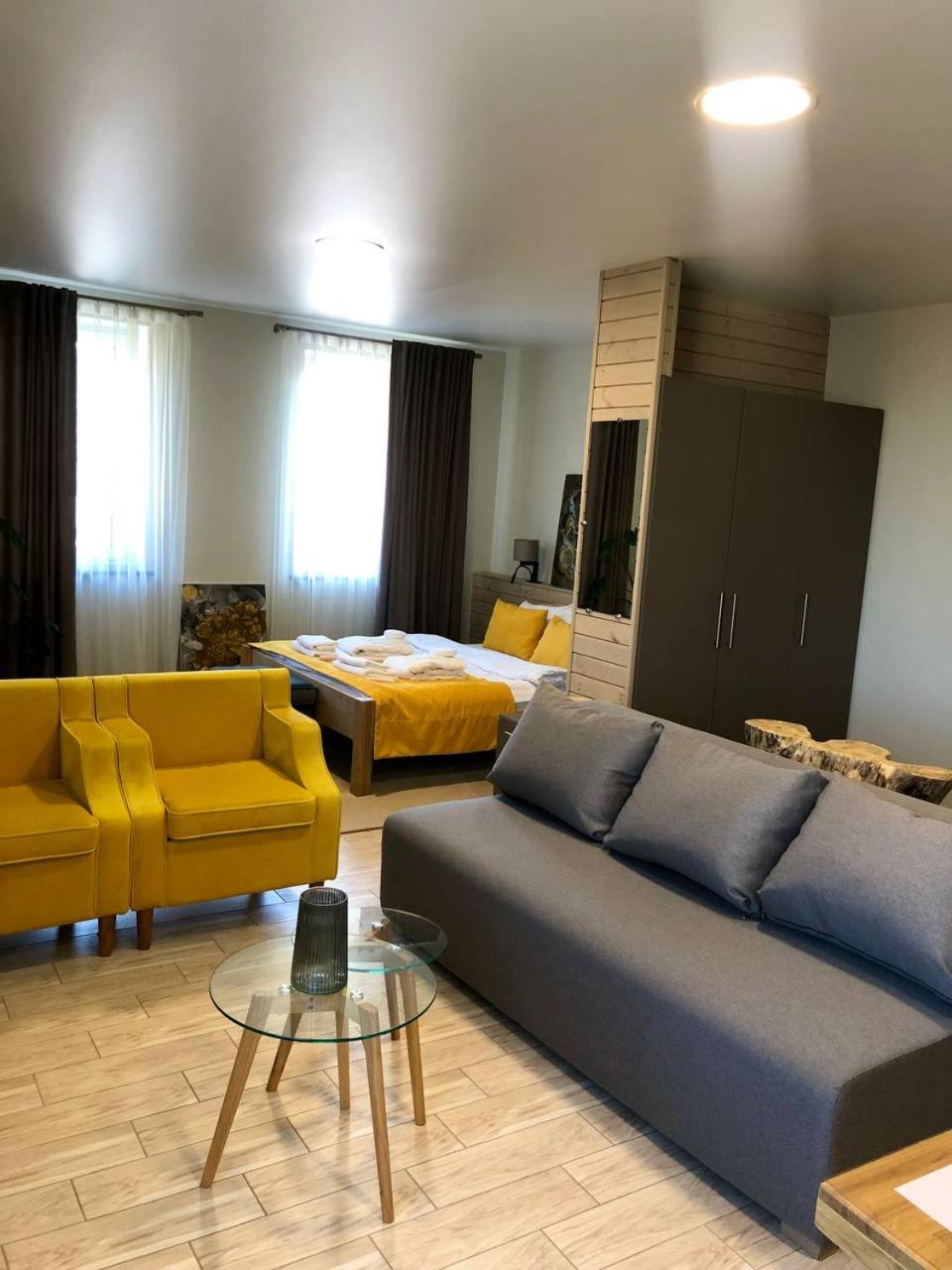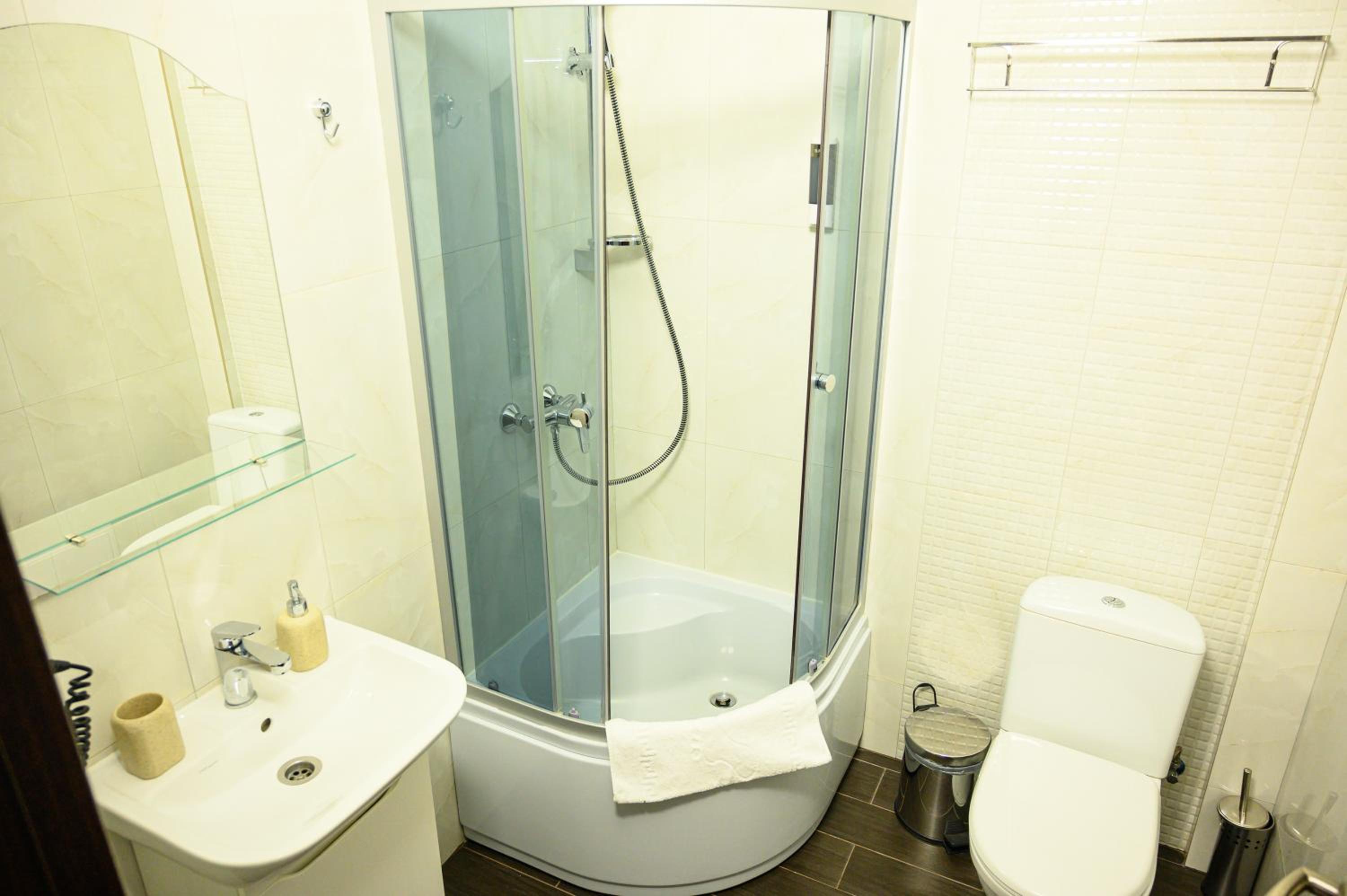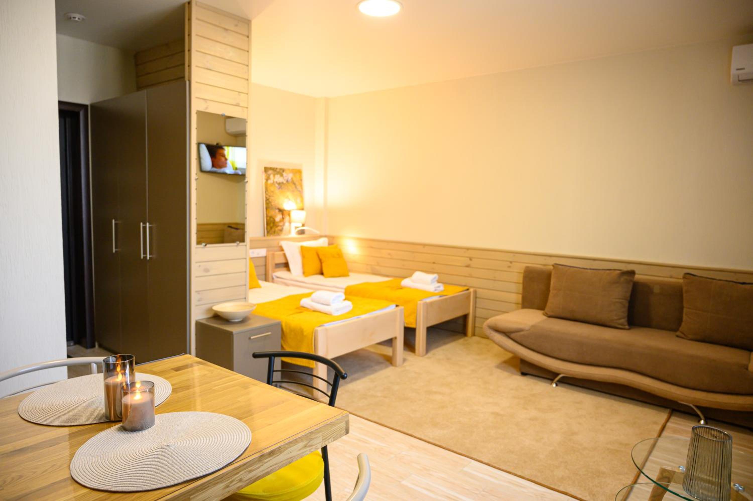 Повноцінна кухонна поверхня, з електроплитою, сковорідкою, каструлею,набором посуду, місткий холодильник з морозилкою (не мінібар, як зазвичай у готелях), обідній стіл+ 3 шт.стільці, два журнальних столики і тумба! - місць для зберігання вдосталь! І великий платний шкаф для одягу+ по 3 вішачки на особу. Це стандартний двомісний номер! Електрочайник теж був, праску за моїм проханням нам віддали у номер. Загалом все супер! Тихо, чисто, добре пахне, для гостей працює спортзала; прекрасні дуже ситні сніданки👍рівня ресторану.