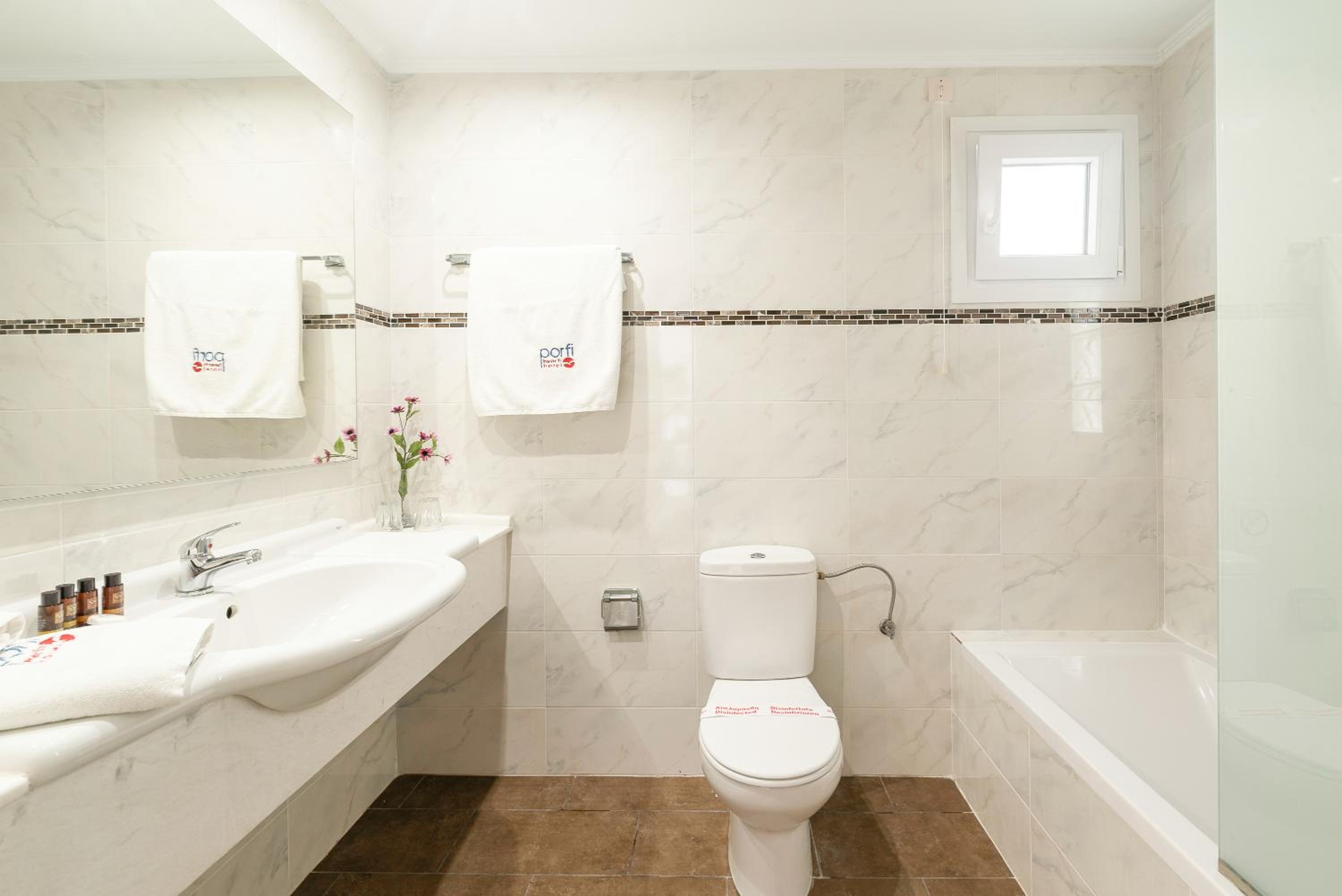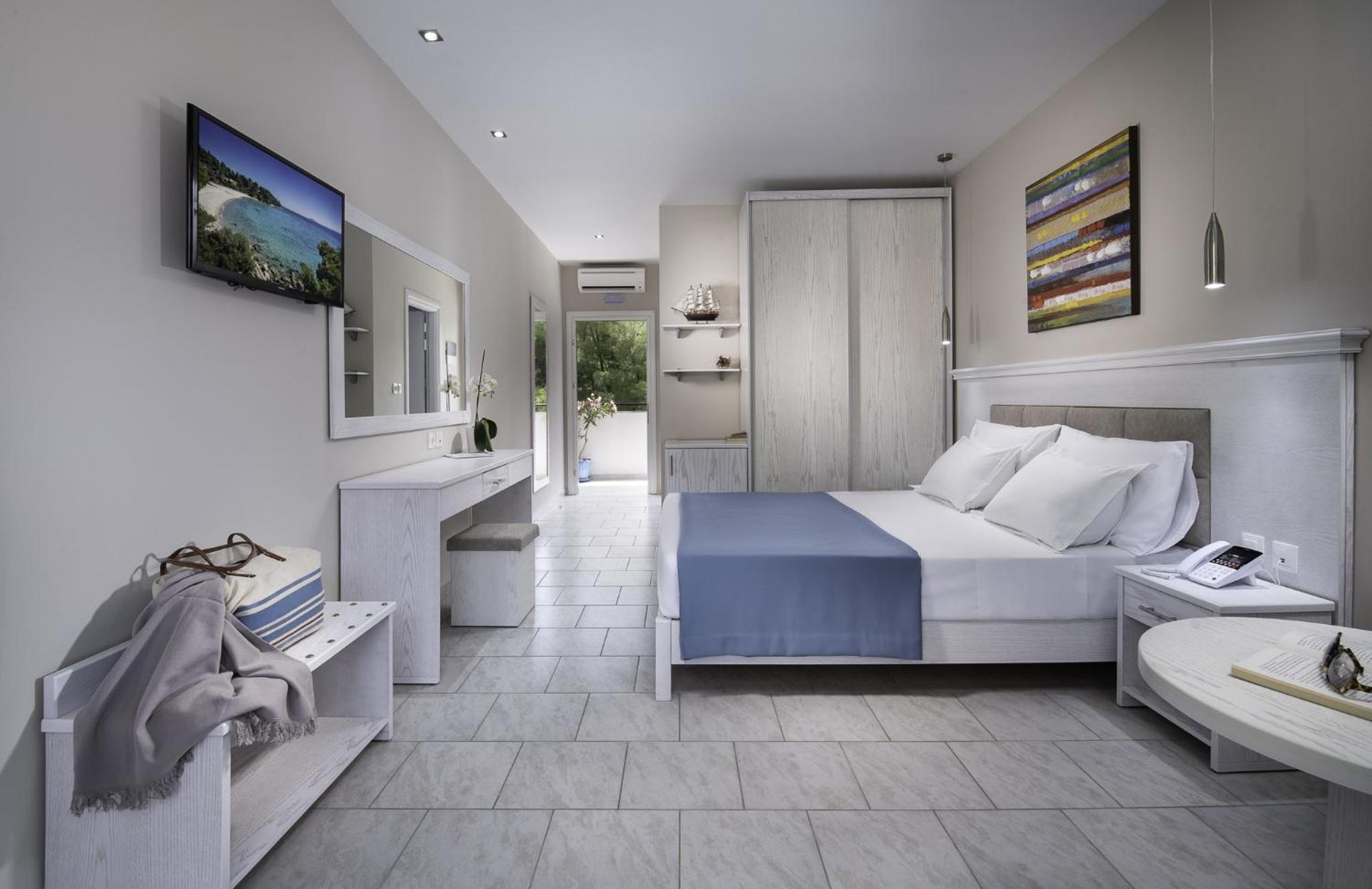 Experience the ultimate relaxation at Porfi Hotel with air-conditioned rooms offering balconies overlooking the sea or lush gardens. Enjoy the comfort of anatomical mattresses and unwind in the seating area while watching your favorite shows on the LED TV.