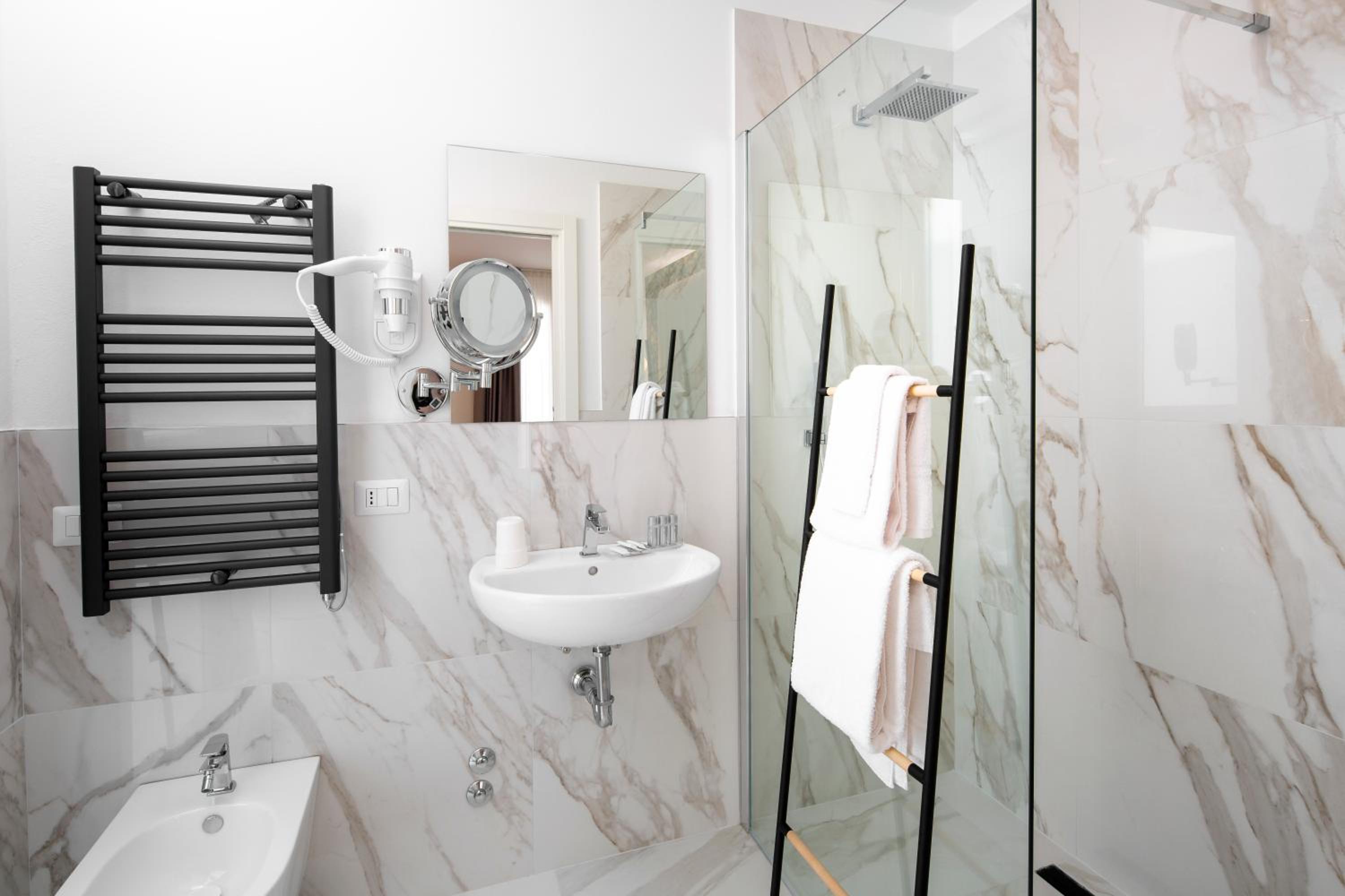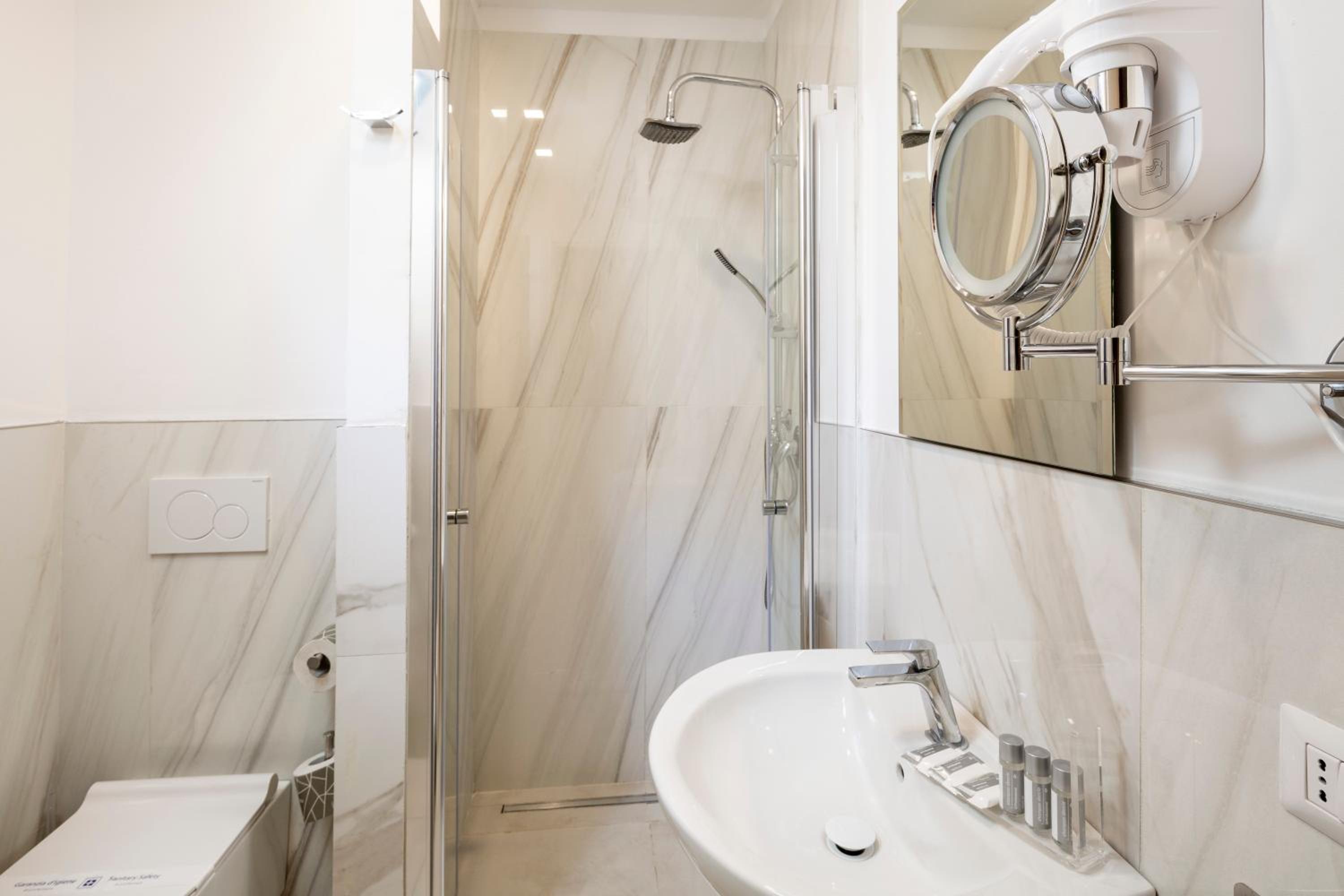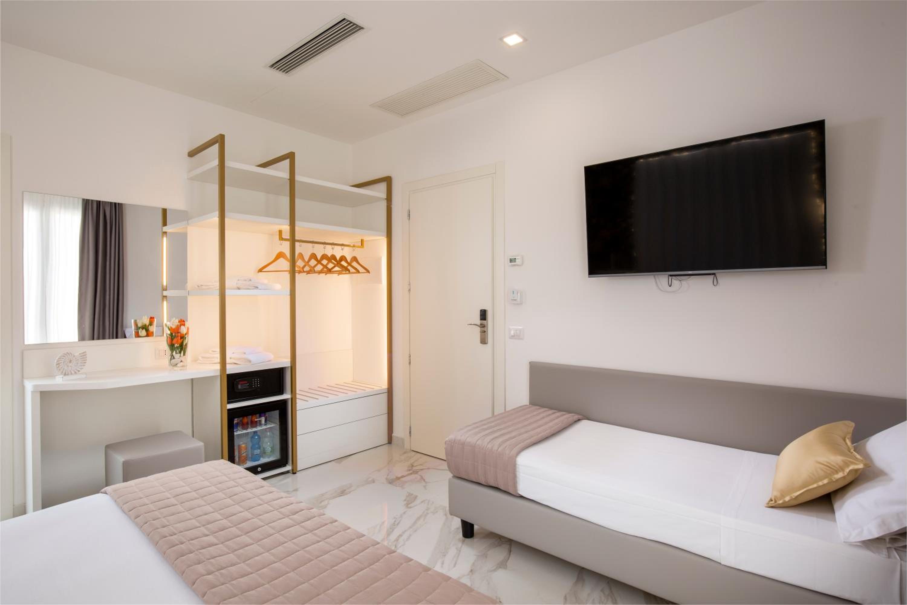 Hotel molto pulito. Essenziale, camere non grandissime ma ben organizzate. Scaffalature per vestiti, cassetti, frigo bar e letto comodo. Bagno completo e pulito.