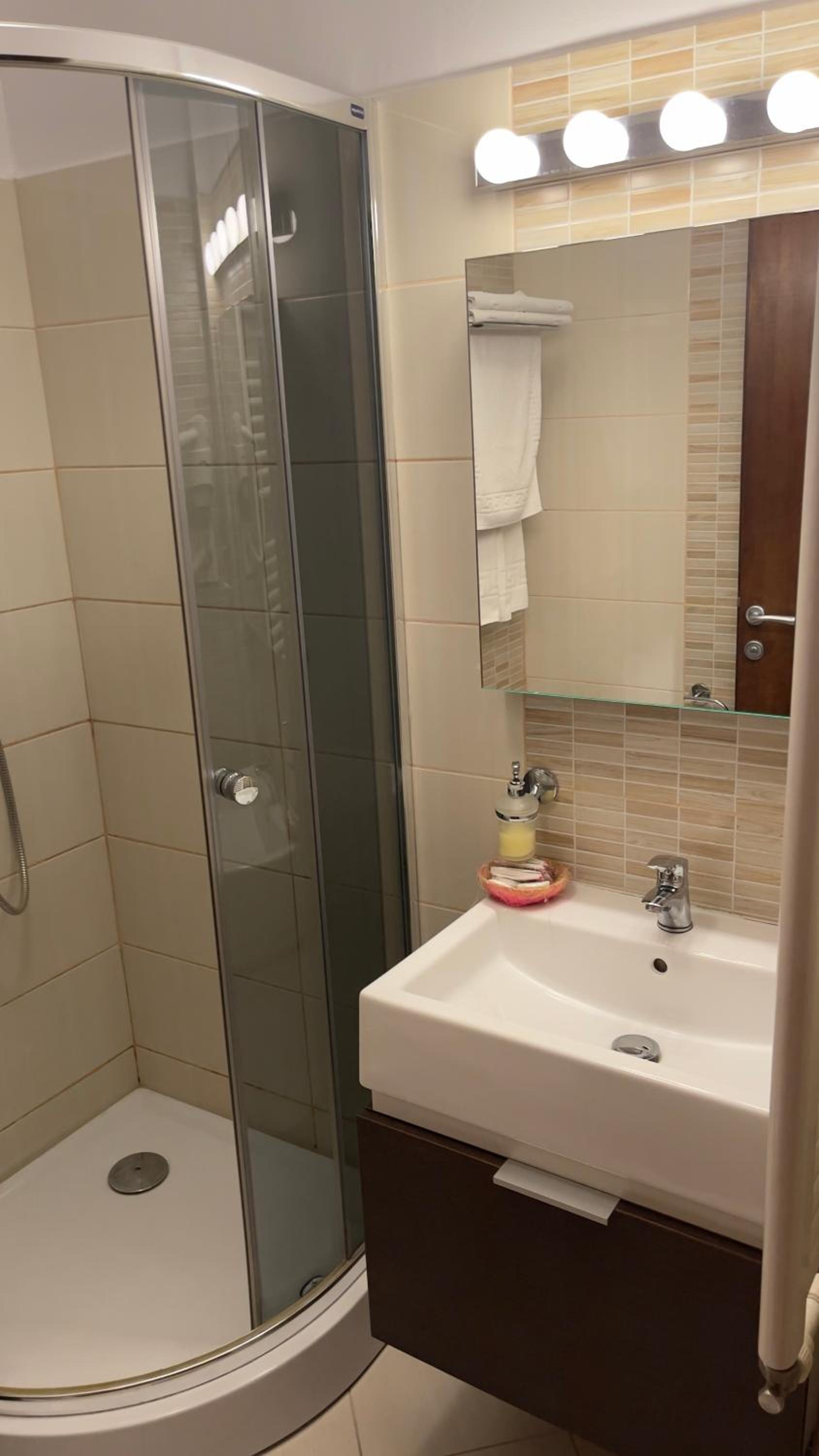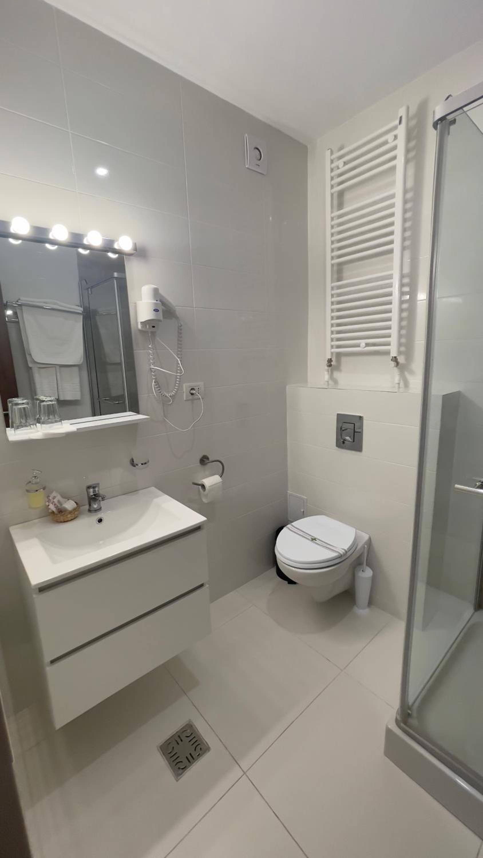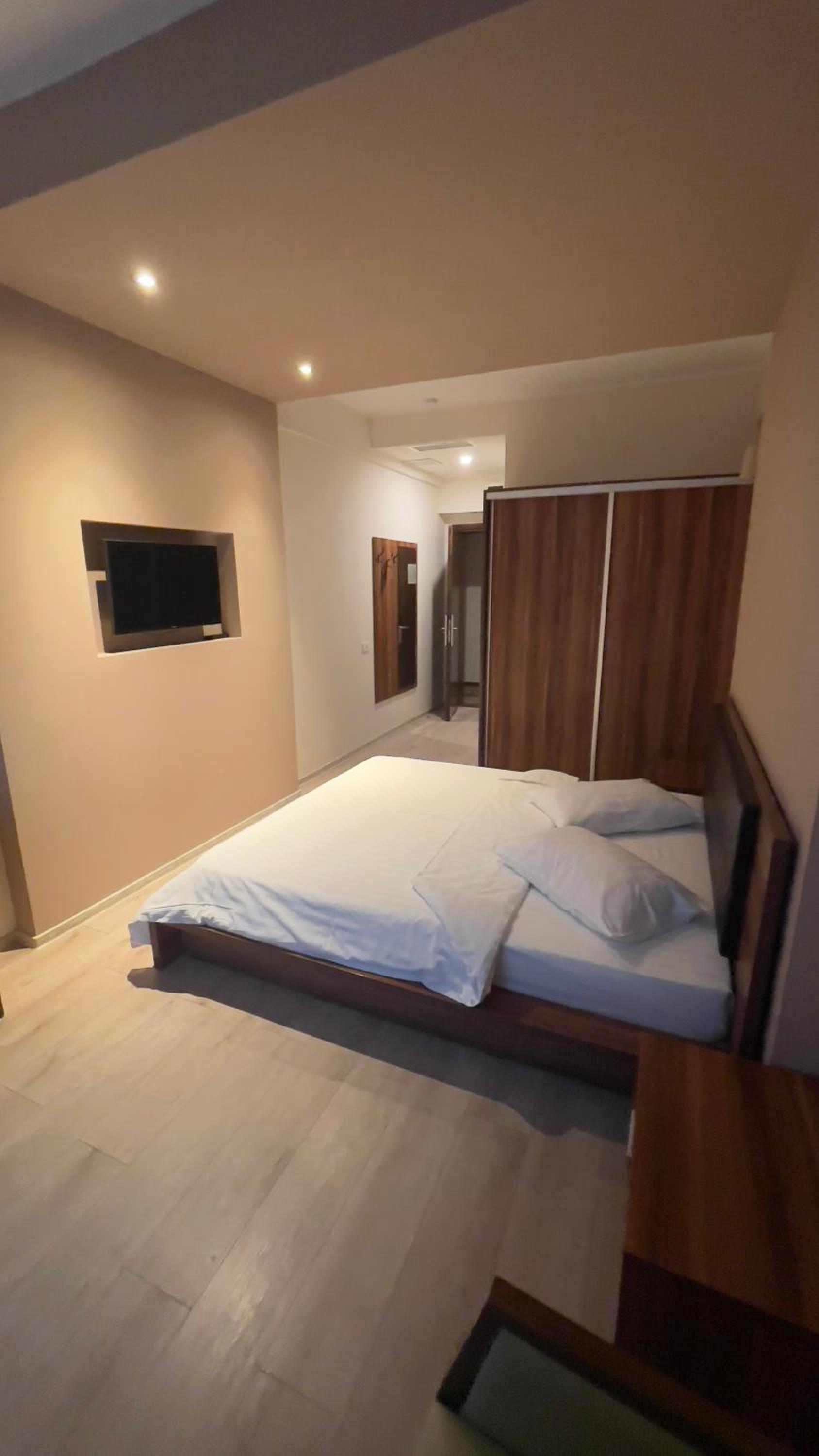Camera pulita e spaziosa.Leggermente fuori dal centro città,circa 3 km.Parcheggio in sede.