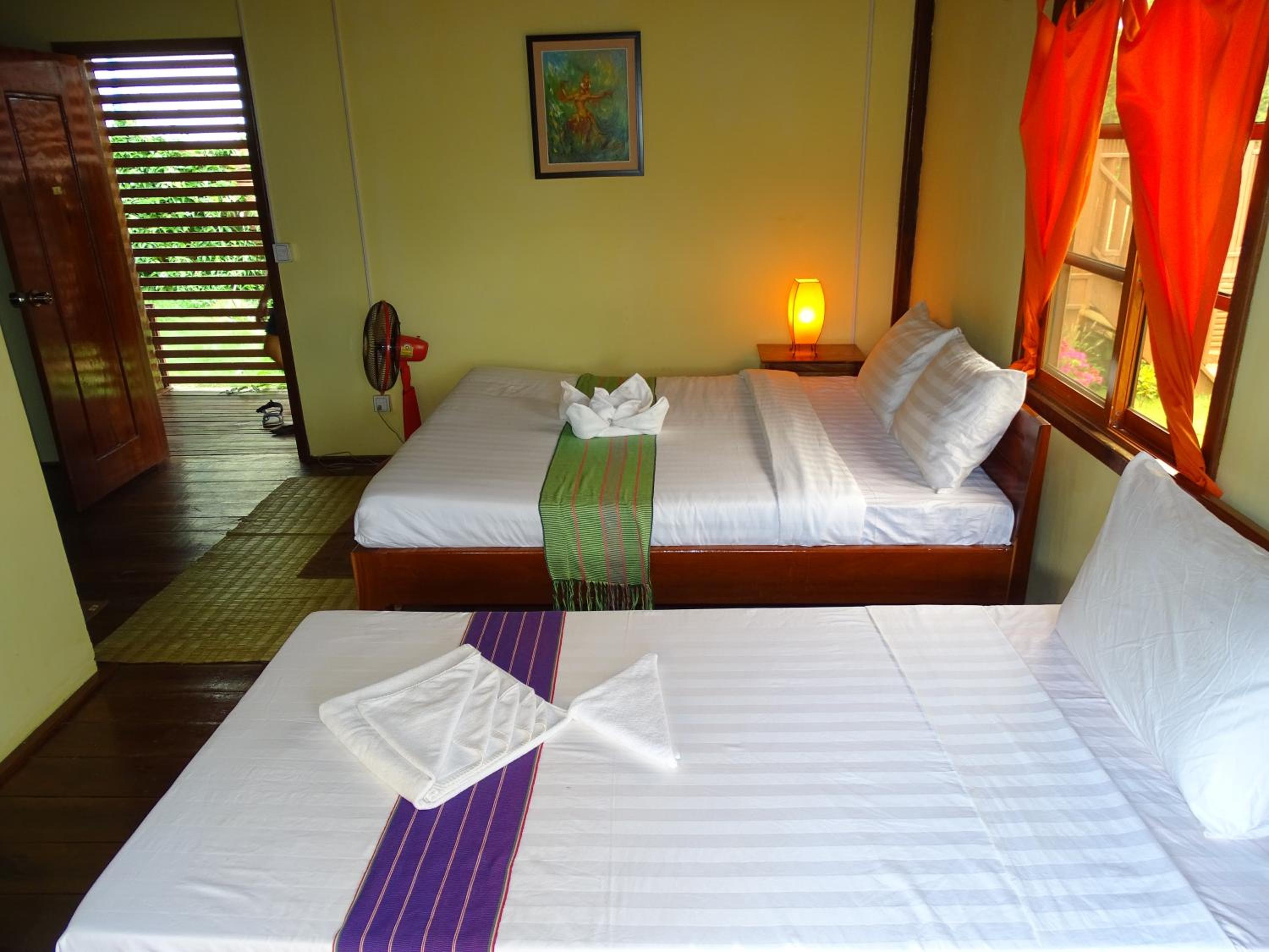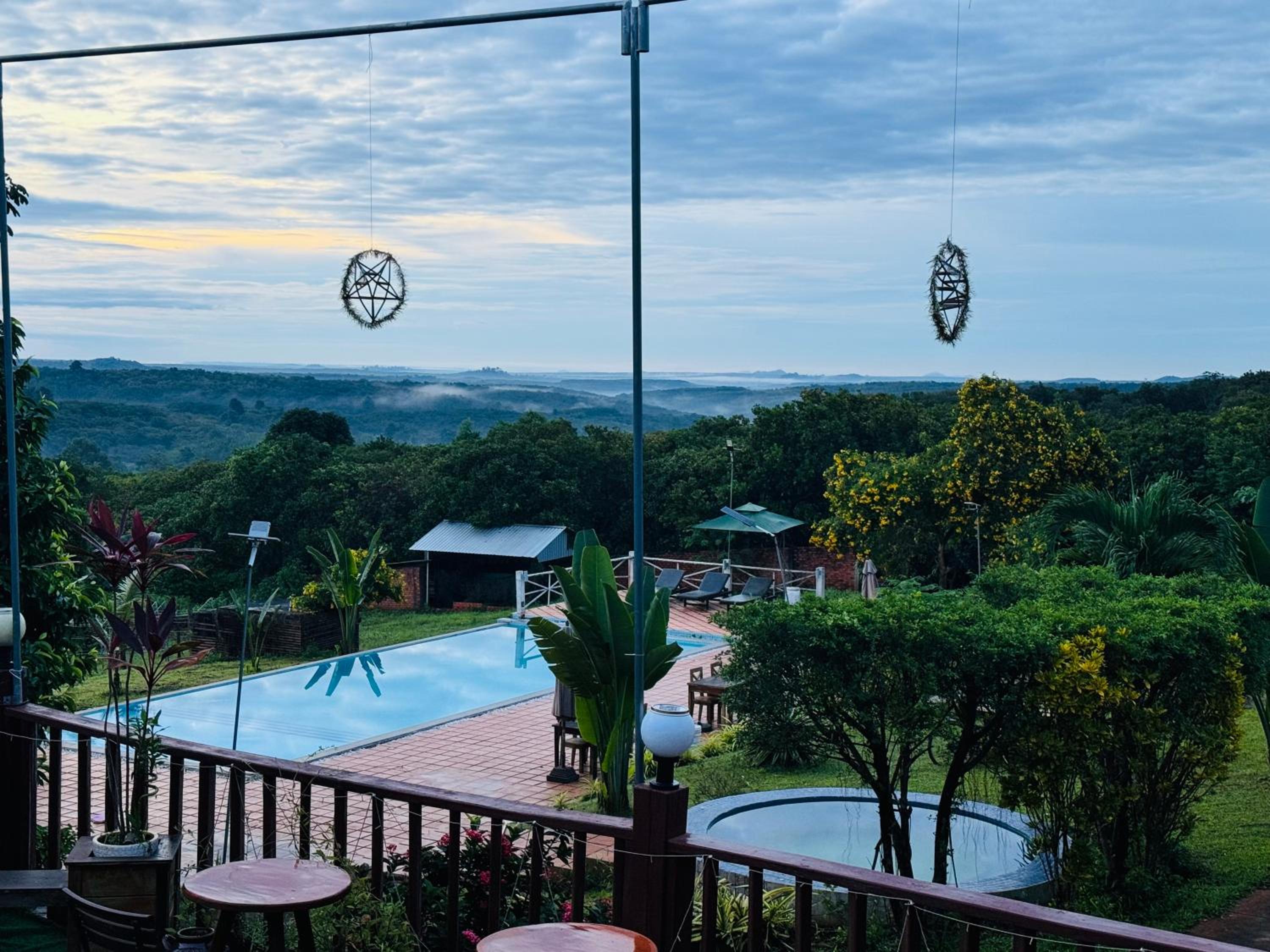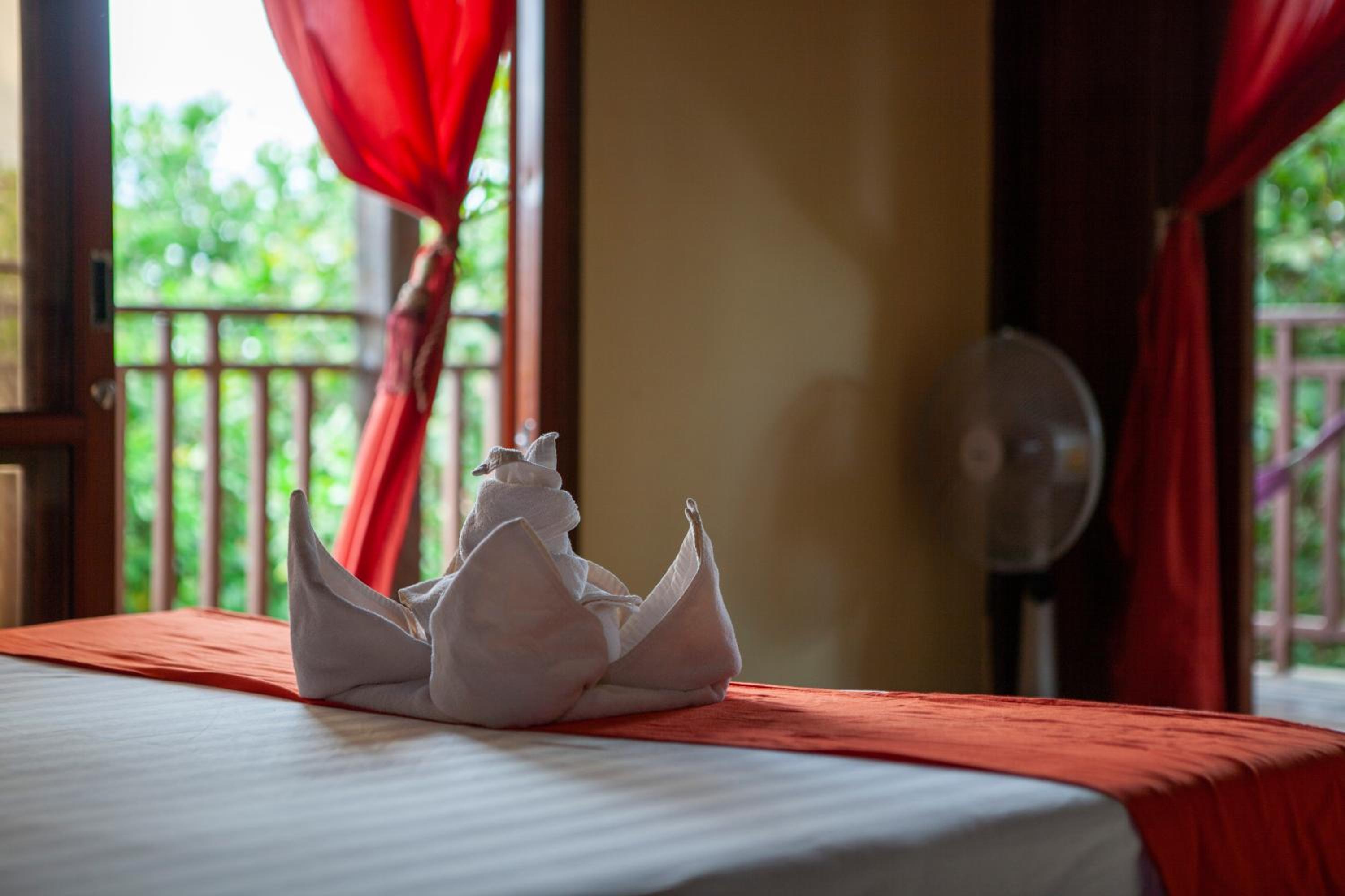 Owners were really caring, they made a piece of art with some towels and flowers for our wedding anniversary. We came with the flu and they gave us some ginger, lemon and honey tea which were just perfect for our sore throats. View was wonderful, you could see the hills of forest around on the terrace, was beautiful especially during sunset time. Easy to rent a motorbike and they can order a TukTuk for you and arrange tours and other activities. Nice swimming pool. There’s is a pool table at the restaurant and you can ask to eat in your room and it was good meals very convenient! Finally, the place is remote around 8 min from the city so it is very quiet and relaxing away feels like hidden from the world kind of feeling ;)