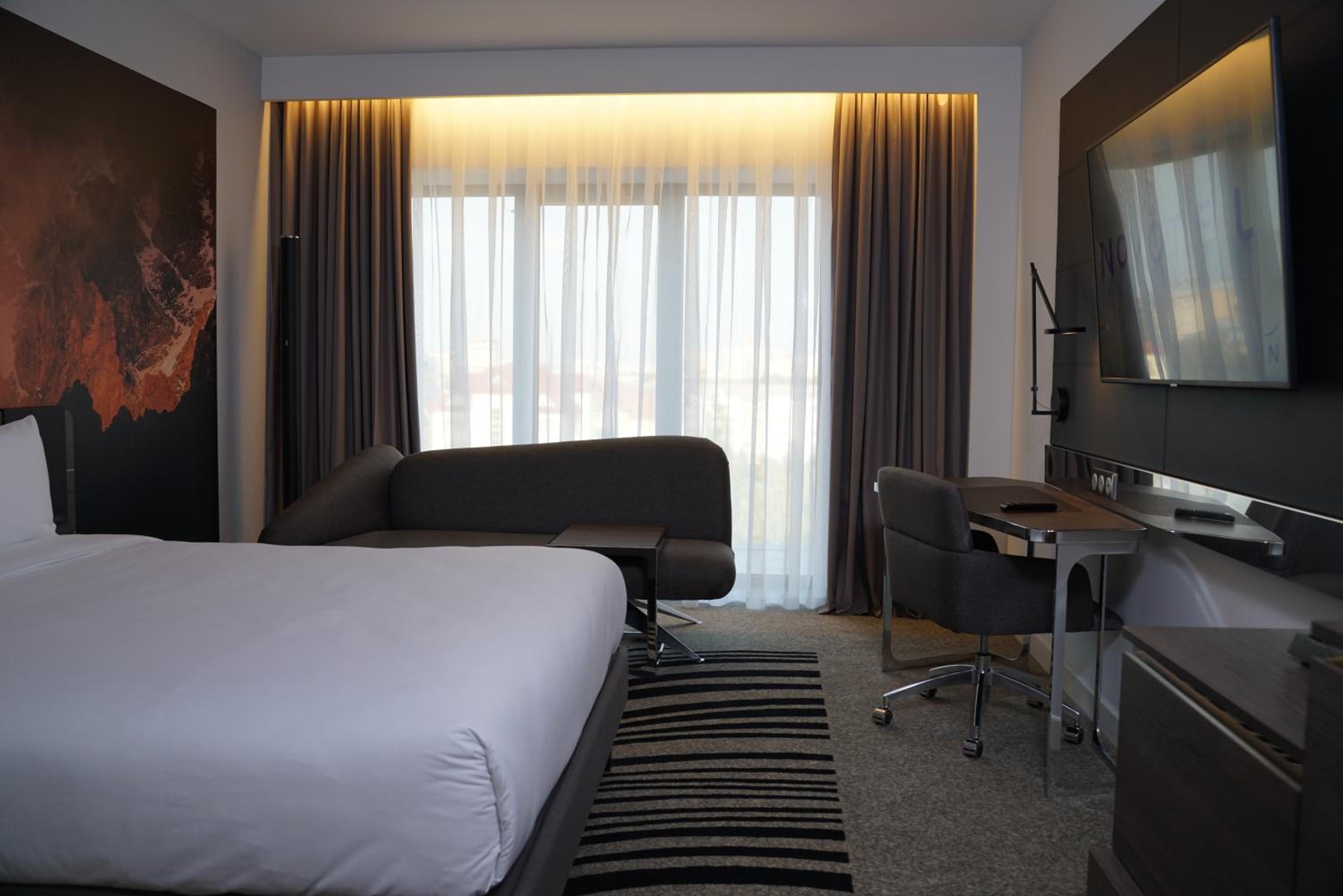 Luxurious Accommodation: Novotel Bishkek City Center offers 5-star accommodation with room service, free WiFi, and stunning city views. The rooms are elegantly furnished with modern amenities including a flat-screen TV, safety deposit box, and luxurious bathroom essentials.