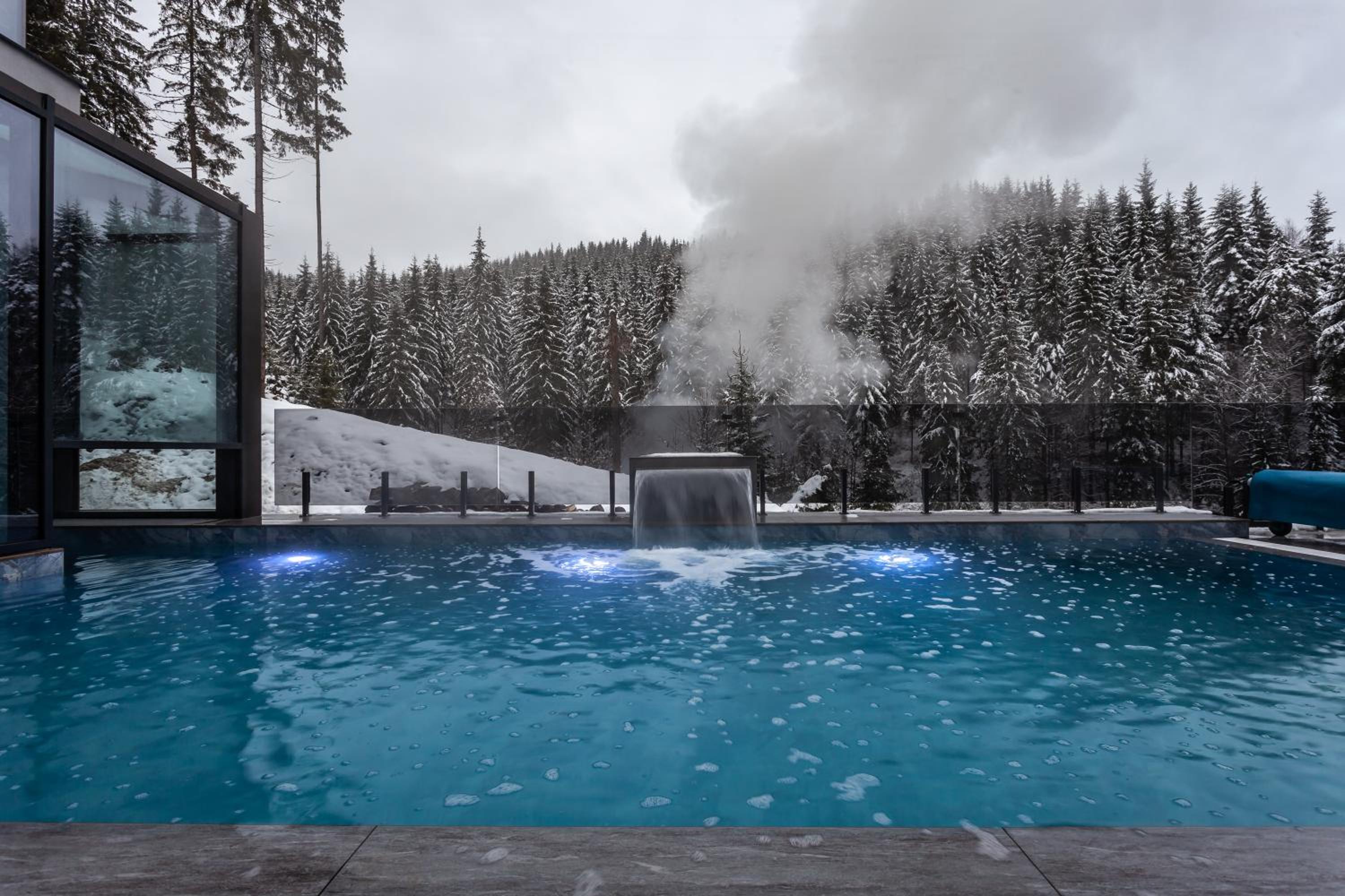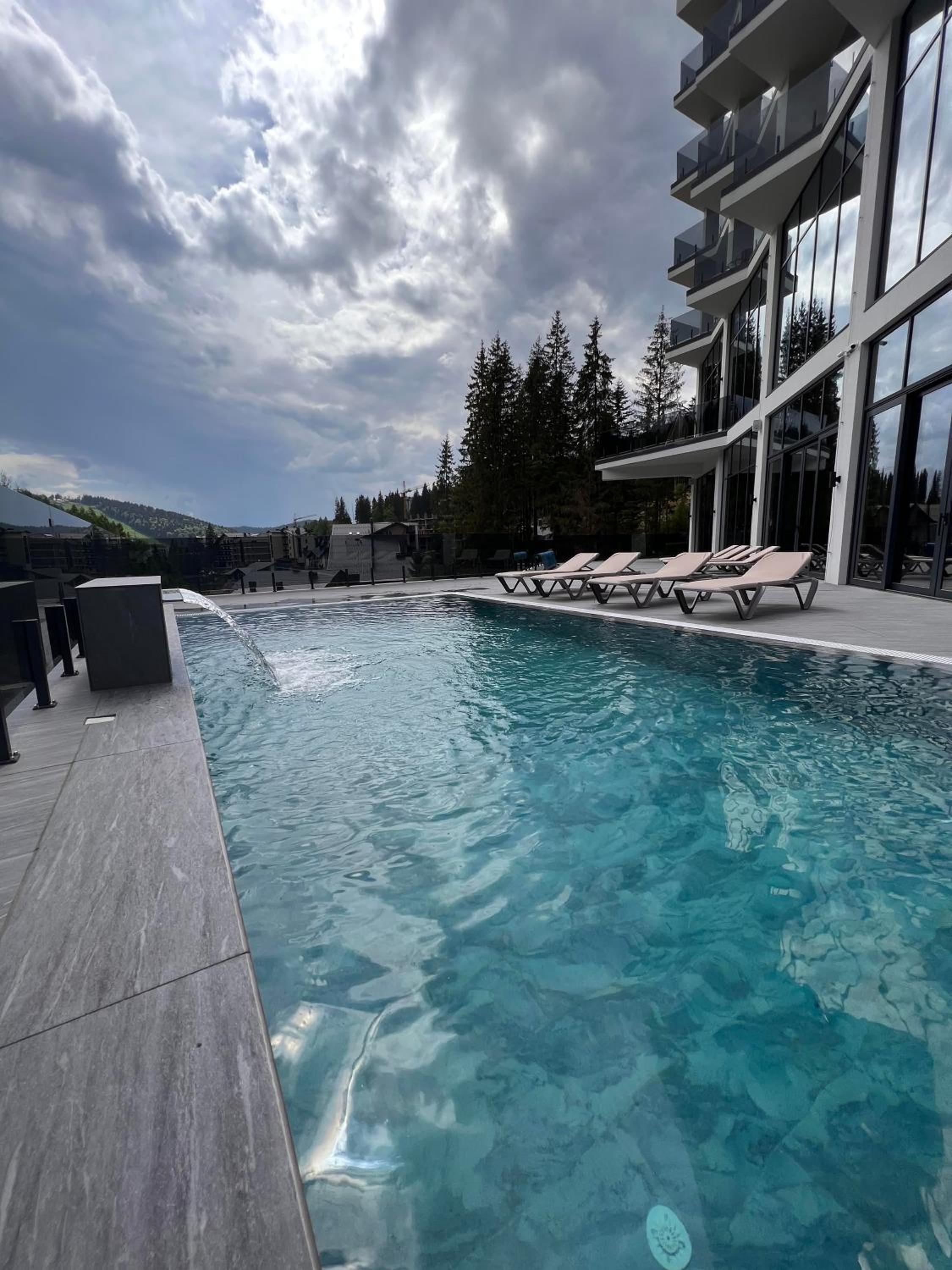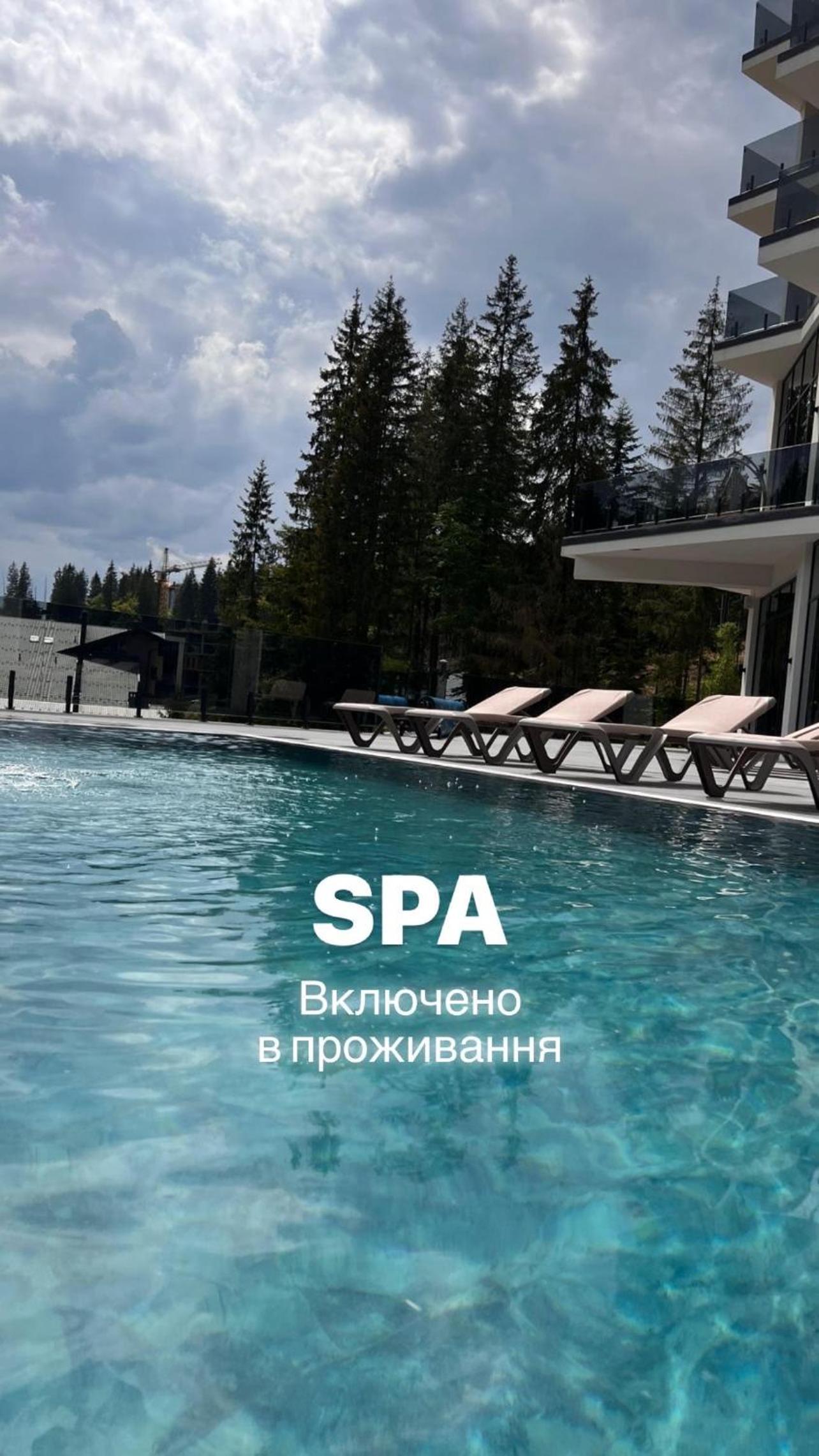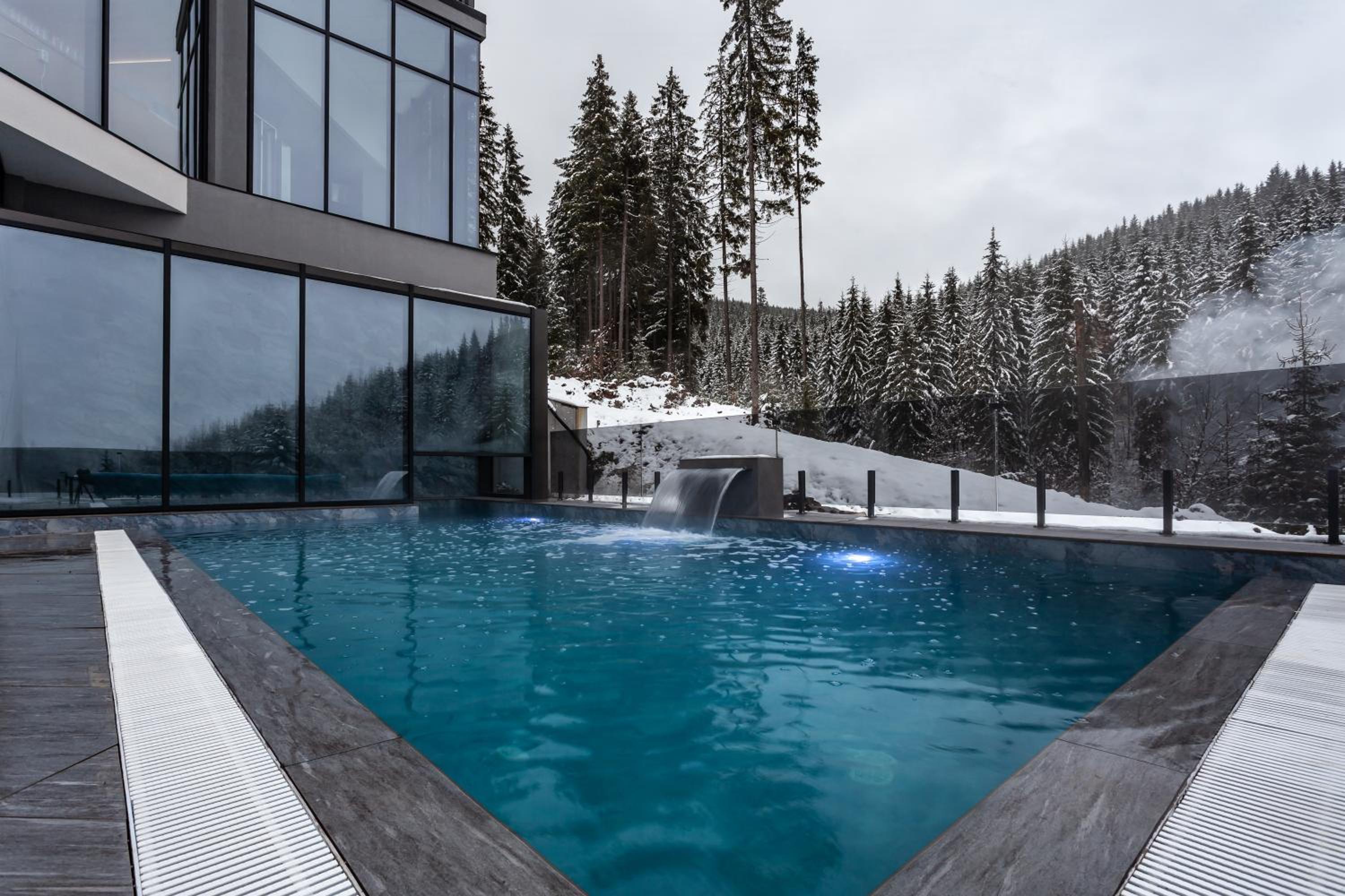 GirskiDelux in Bukovel offers a lavish experience with an outdoor and indoor pool, sauna, hot tub, and hammam. The spa center and karaoke add to the indulgence.
