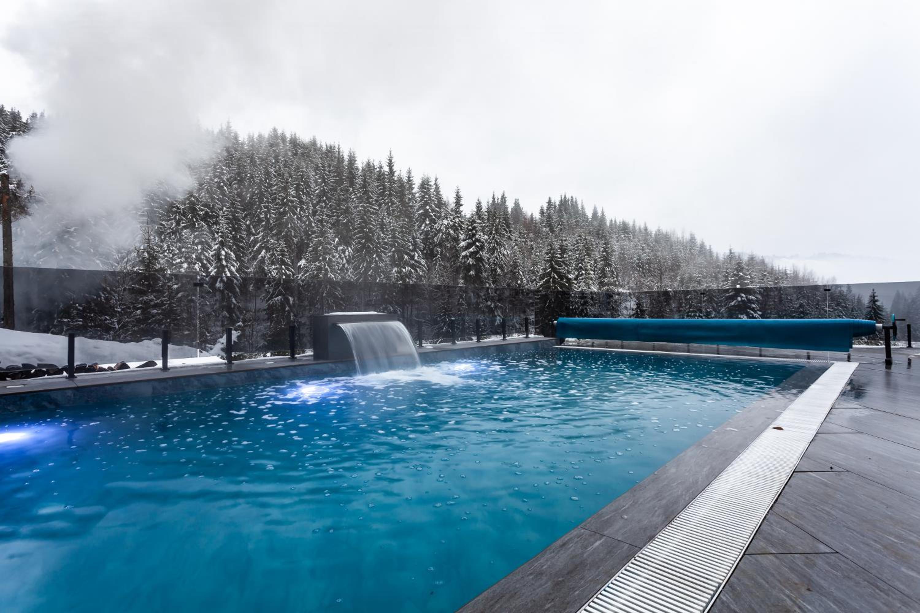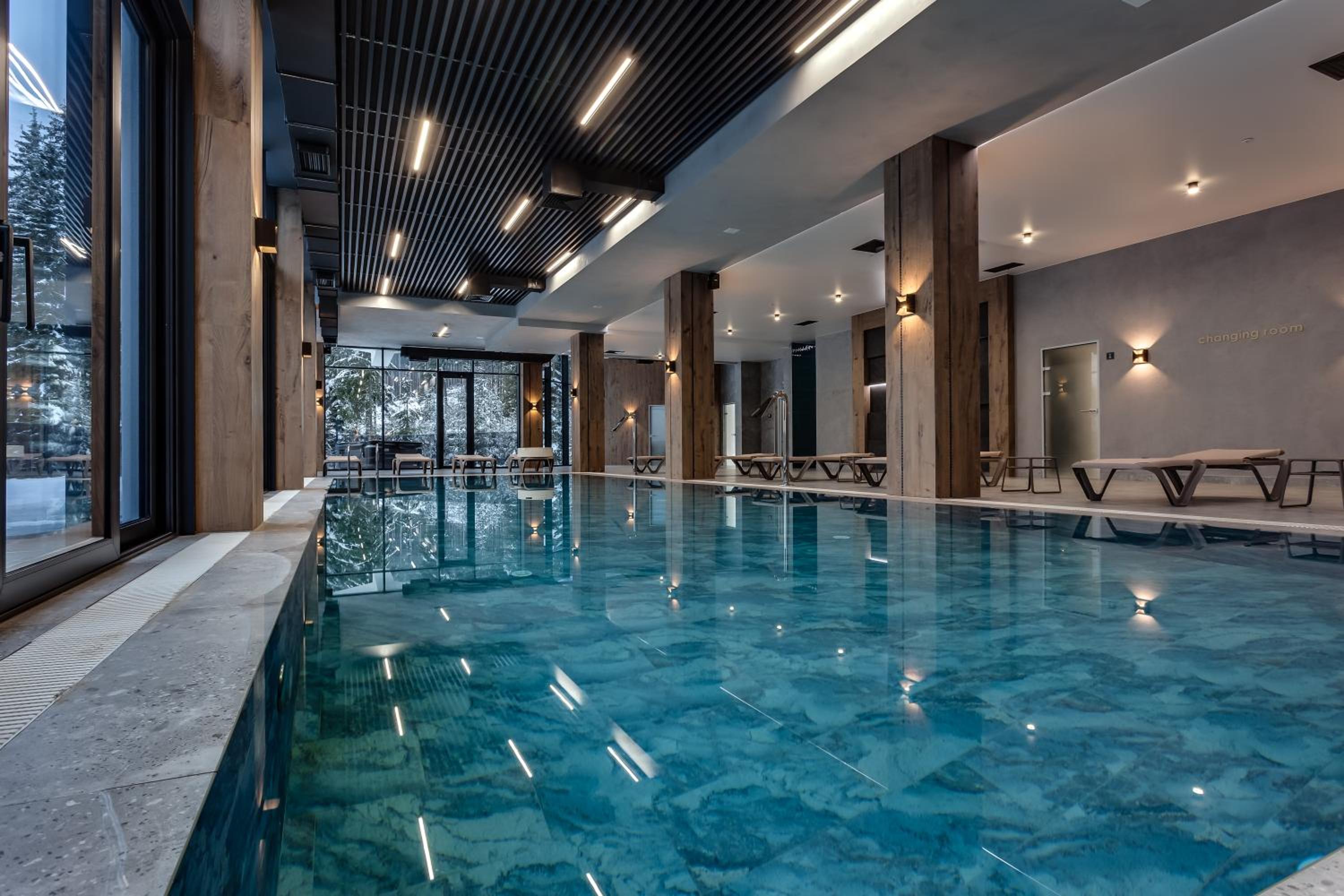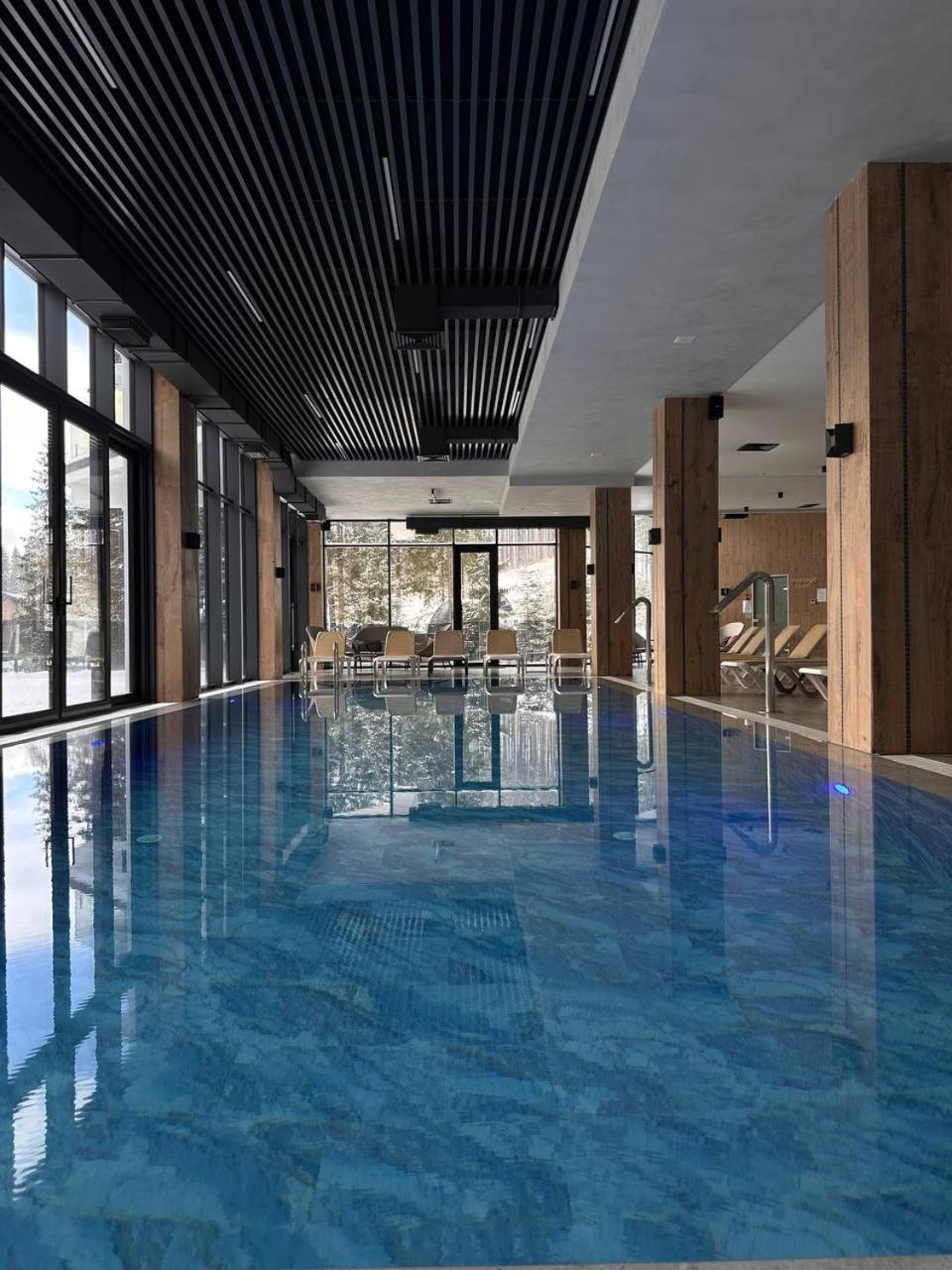 GirskiDelux in Bukovel offers a lavish experience with an outdoor and indoor pool, sauna, hot tub, and hammam. The spa center and karaoke add to the indulgence.