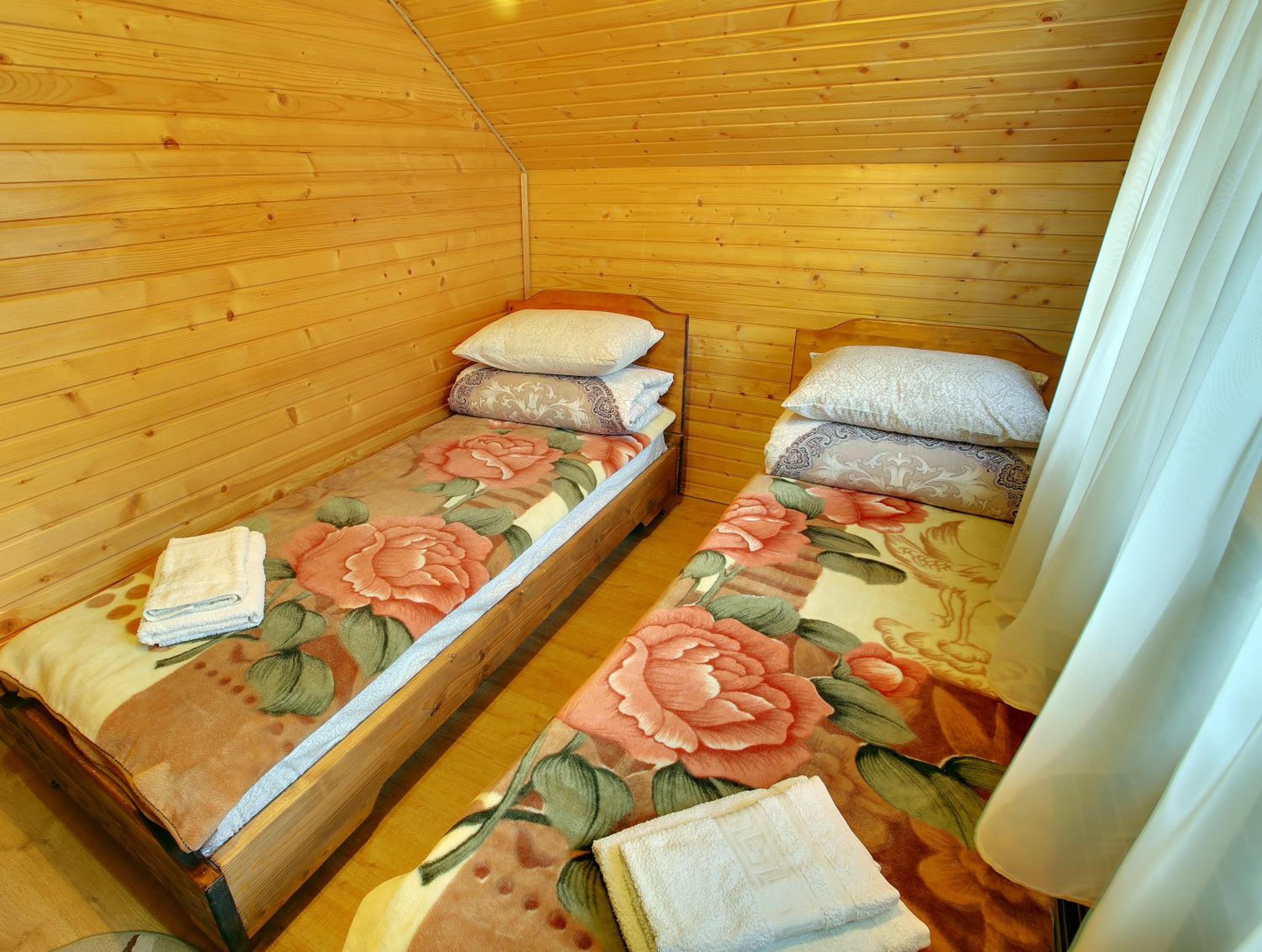 Rooms are cool and made of wood. Bed is big. Bathroom works perfectly. Clean and neat.