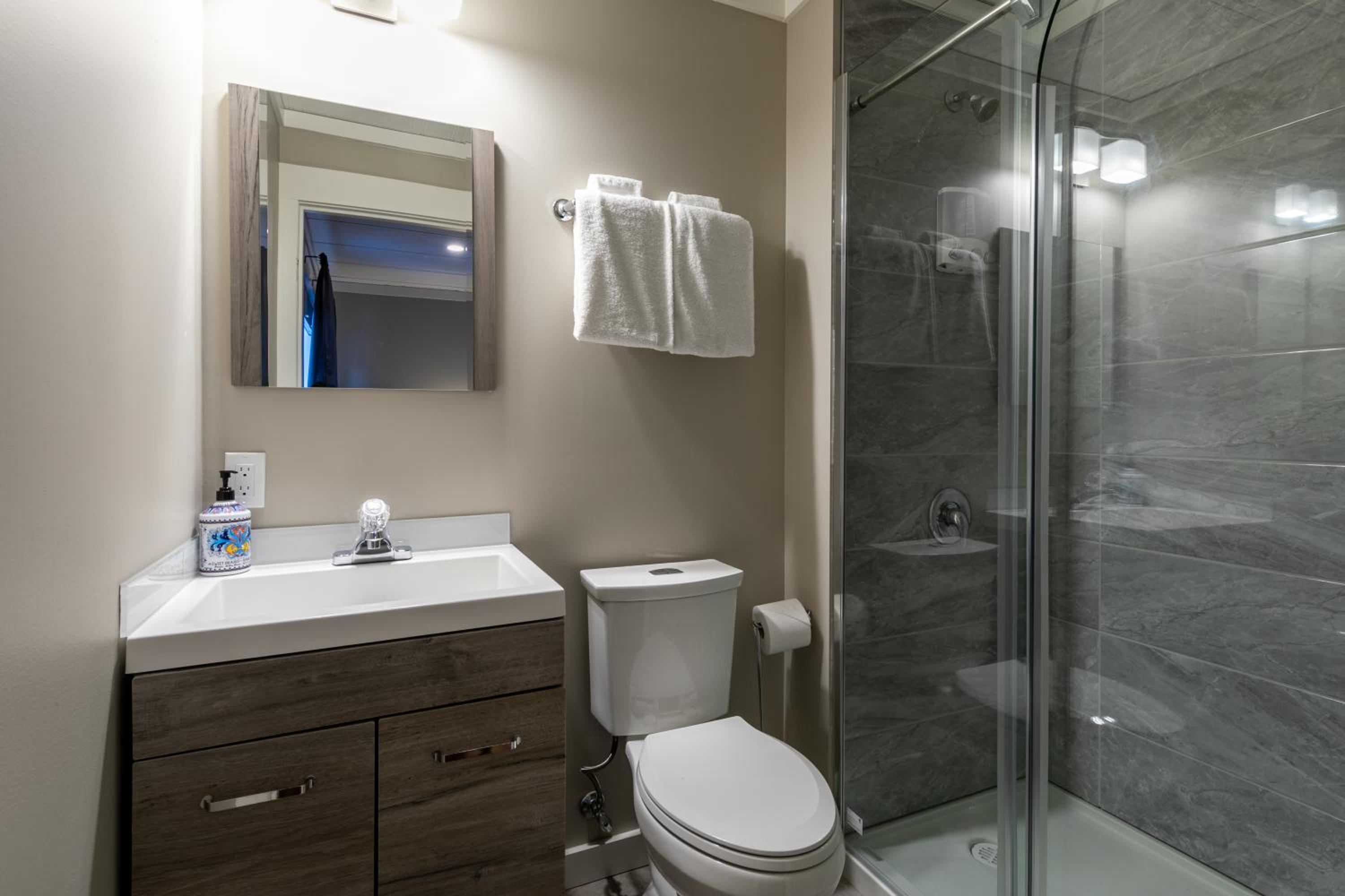 Relax in our well-appointed guest rooms featuring modern amenities such as a coffee machine, plush bedding, and a pristine private bathroom stocked with complimentary toiletries.