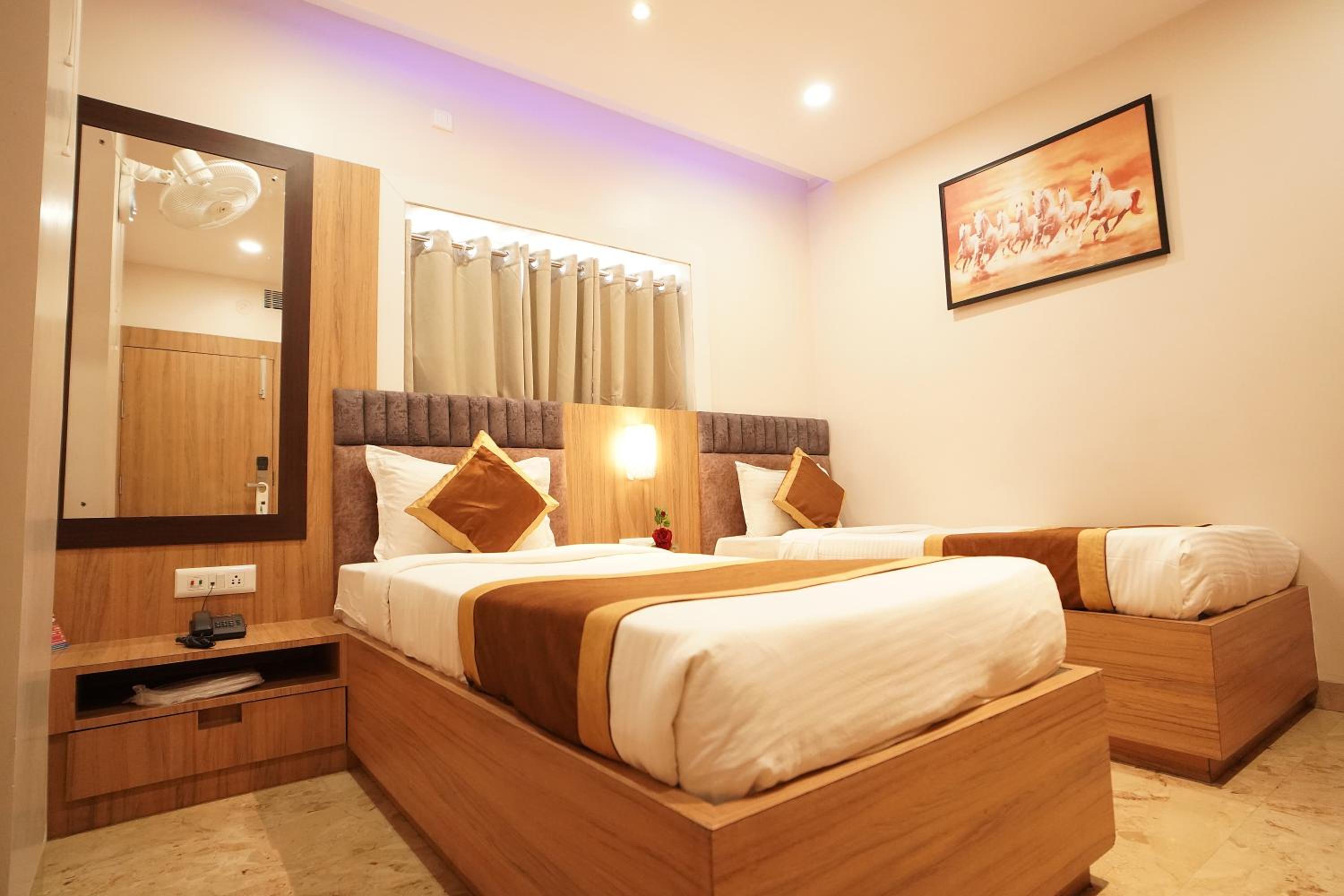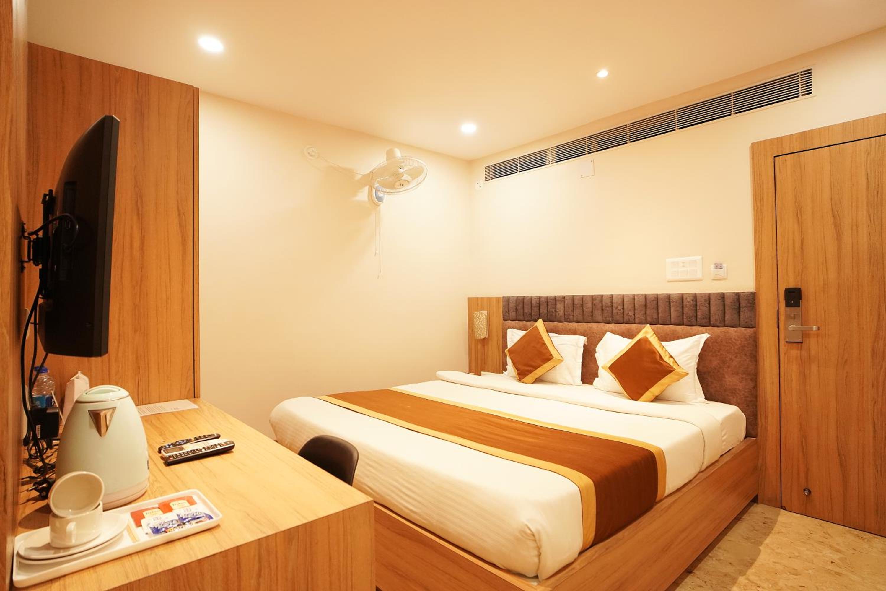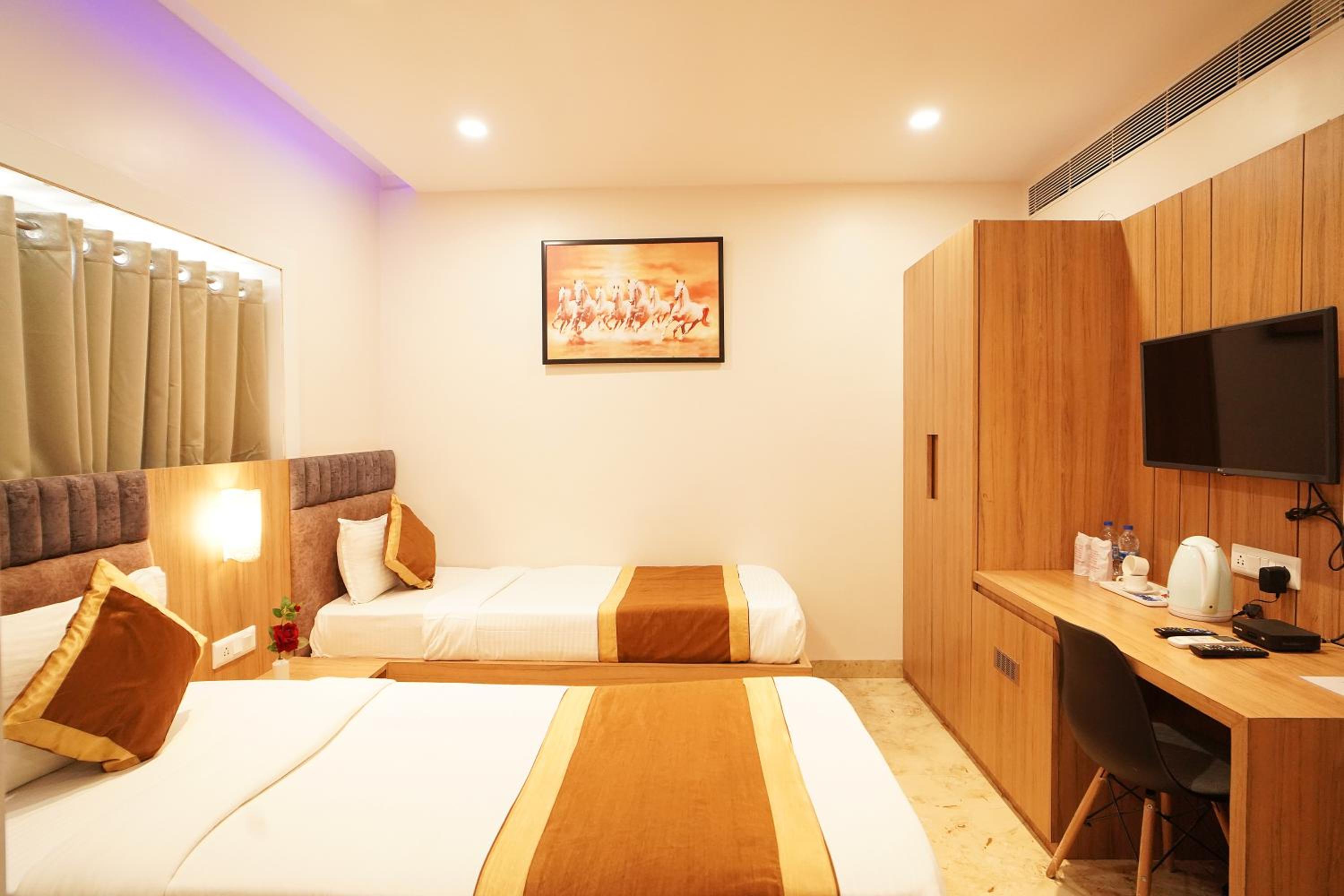 Hotel Ekta International in Deoghar offers 3-star air-conditioned rooms with modern amenities and a private bathroom. Each room features a flat-screen TV, kettle, and free toiletries for a comfortable stay.