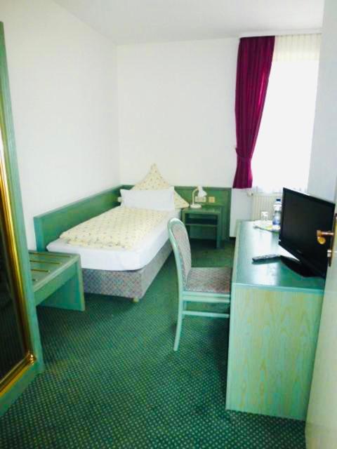 Charming Accommodations: The classic-style rooms at Solmser Hof offer a peaceful ambiance with their green tones and modern amenities, including flat-screen TVs and en-suite bathrooms.
