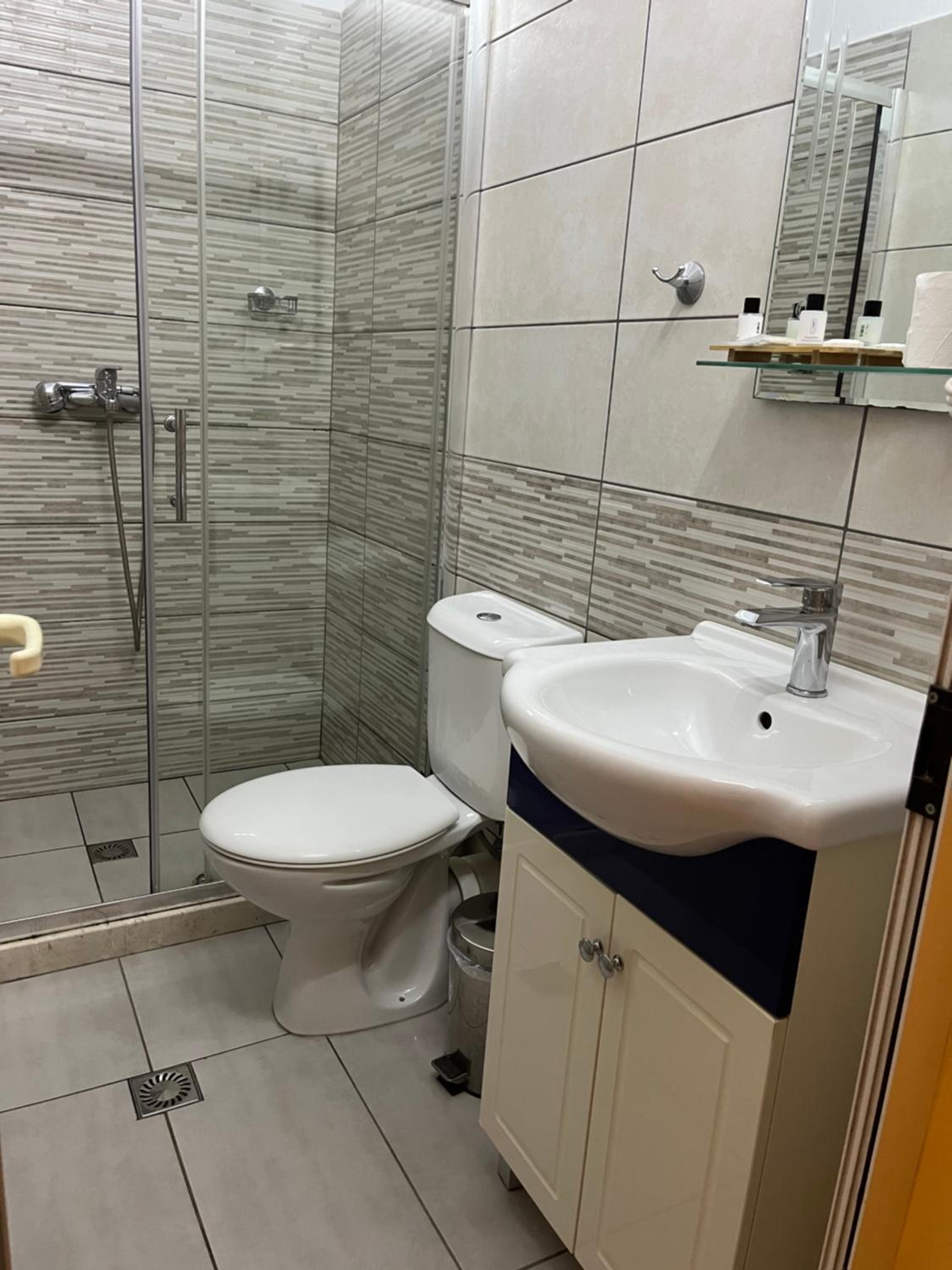 Het ontbijt was goed en hele goede koffie. Vlakbij stap je op Bus nr. 8 en dan ben je voor 40 Lek op het Skandebeg-plein. Prima douche.