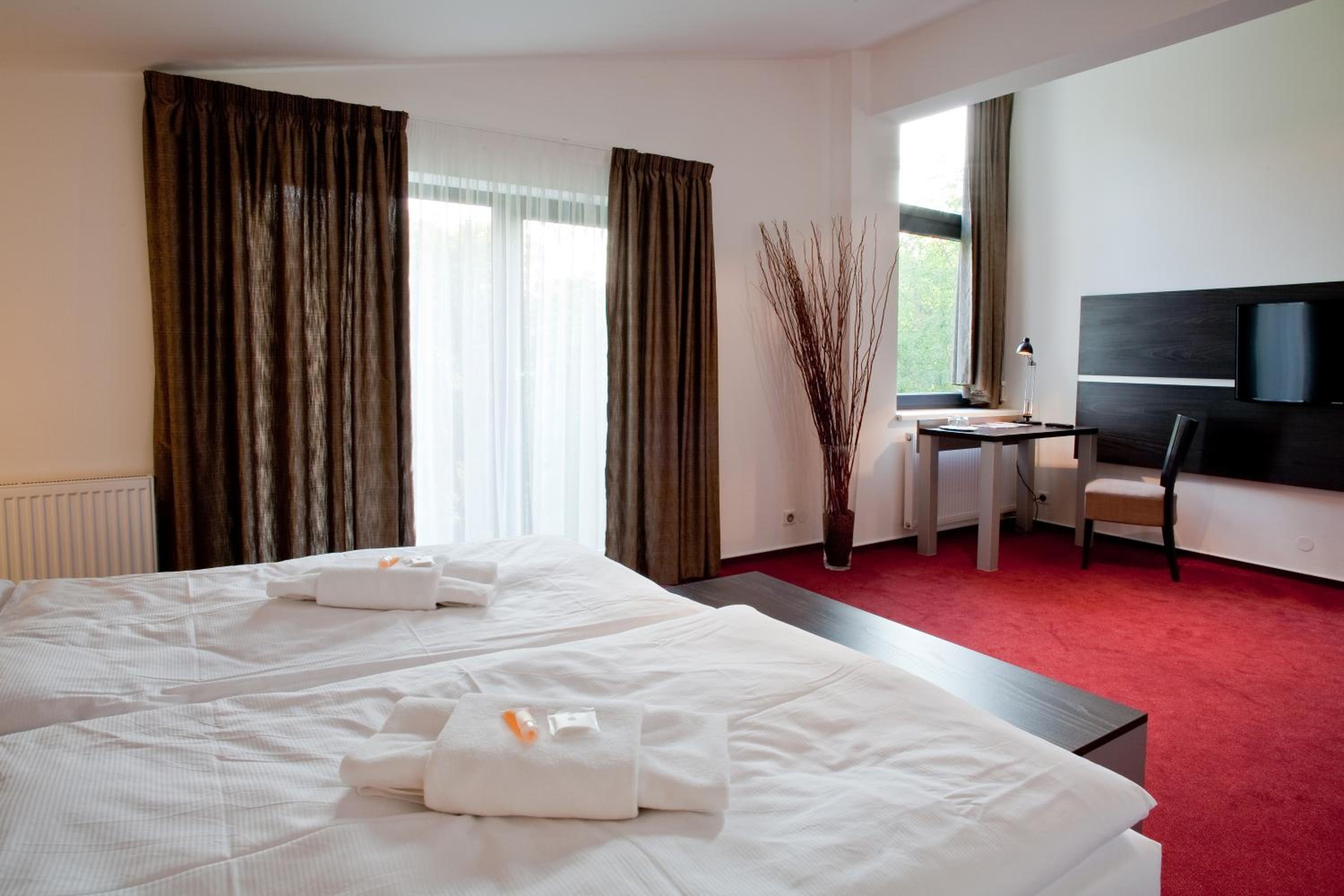 Отель чистый, номера большие, мы получили номер смежный из двух отдельных комнат и общей ванной и туалетом. Нам (2 взрослим и 2 детям) подошел такой вариант, так же может подойти 2 парам знакомых например. Завтрак был хороший, все свежее, кофе вкусный. Расположение отеля в центре города. рядом пруд и боулинг. Есть бесплатная частная парковка.