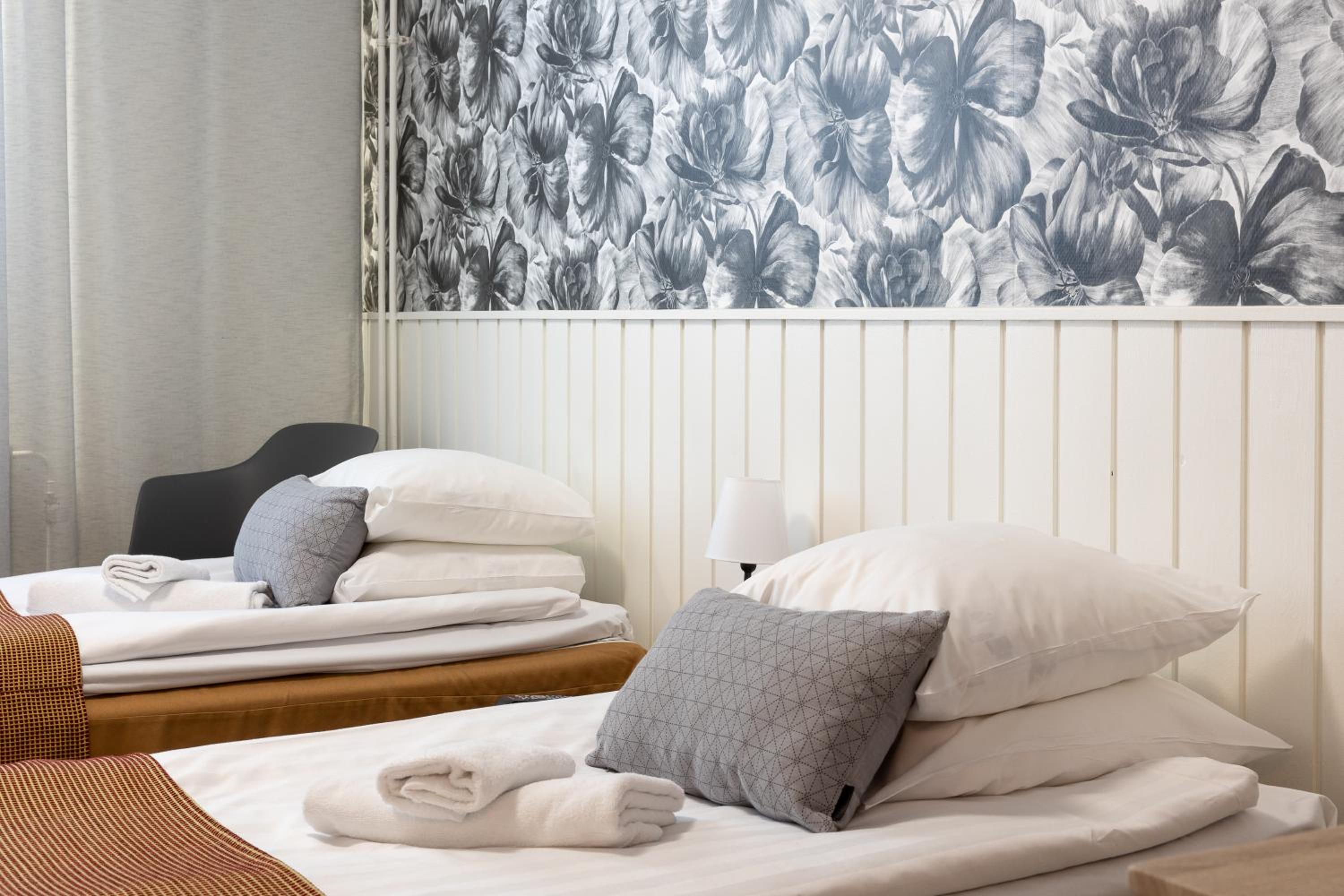 Rauhallinen ympäristö, siistit yhteiset tilat ja huoneet, itsepalvelukeittiö, hyvä aamiainen.