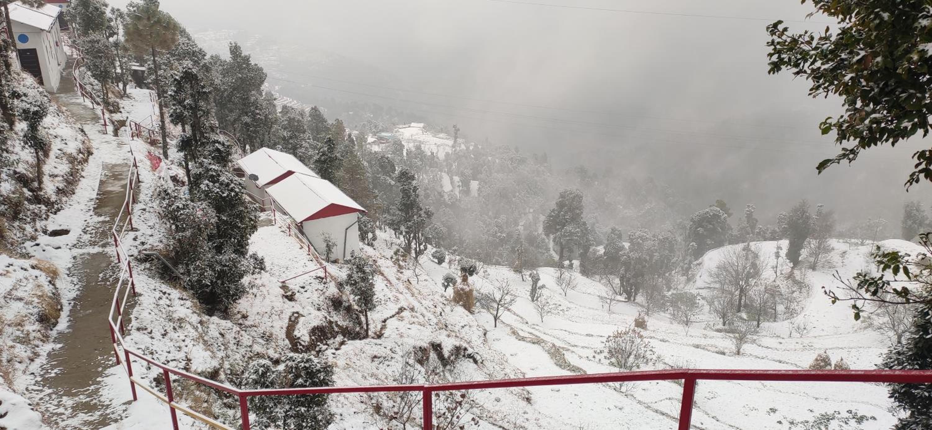 Dev Bhoomi Resort in Kanatal offers stunning views of the mountains and convenient ski-to-door access for a perfect winter getaway.