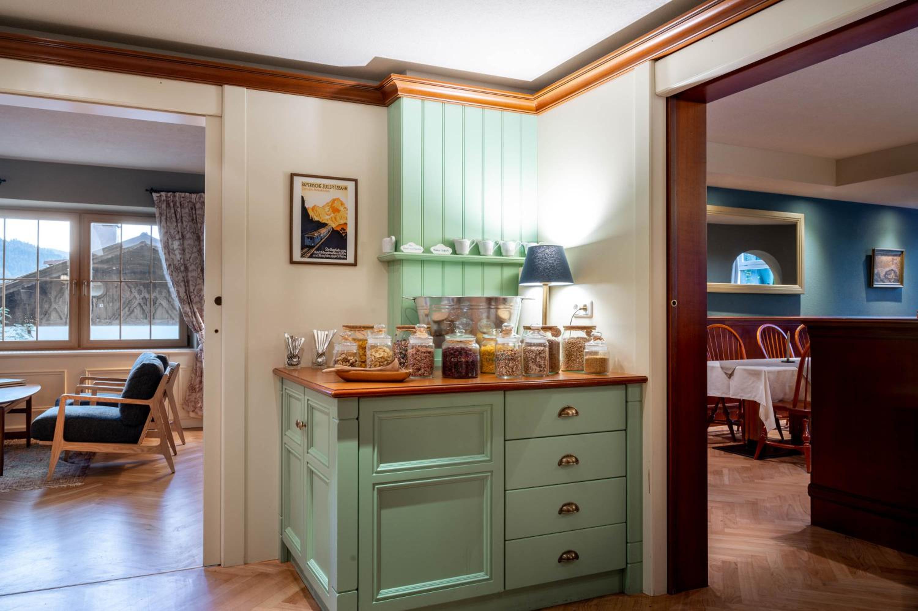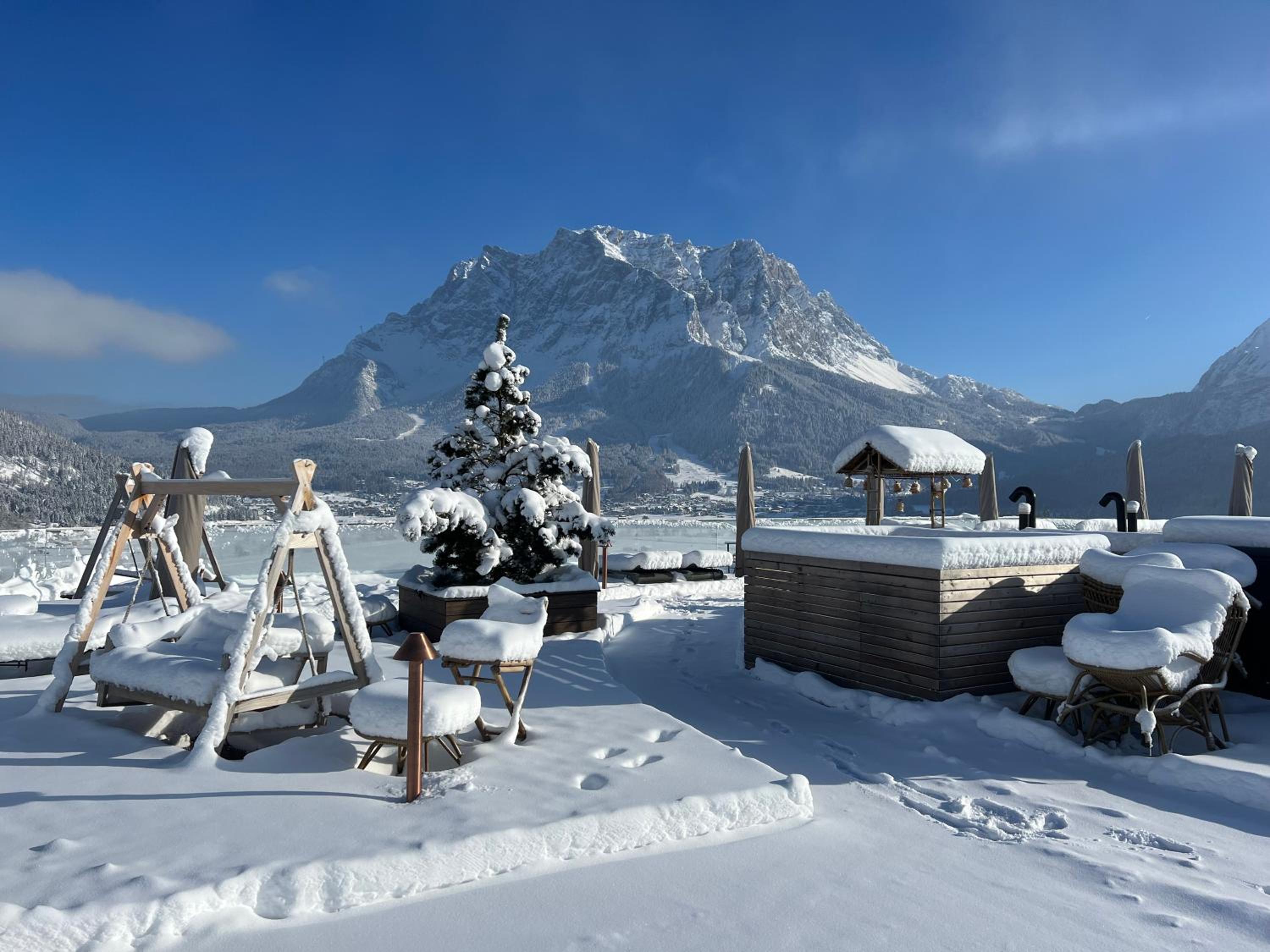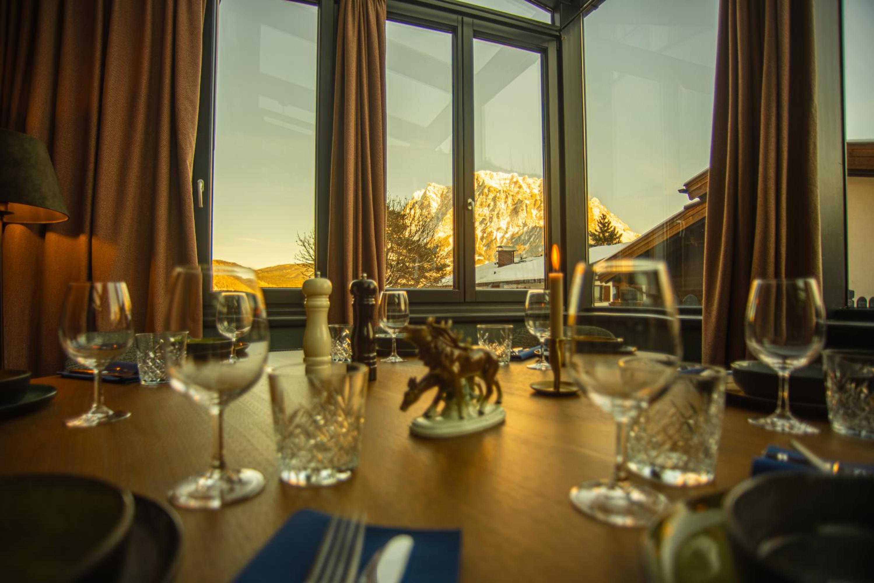 Sehr leckeres Frühstück mit einer veganen Ecke und sogar Hafer-Macchiato. Der Service mit der Hilfsbereitschaft und Empfehlungen hat uns vor allem beim Frühstück sehr gefallen. Die Lage ist super, ruhig aber nah zur Zugspitze etc. Die 2 Saunen und die Dachterrasse inkl. Fernglas waren super. Das Zimmer war angenehm groß und der Ausblick auf die Zugspitze toll.