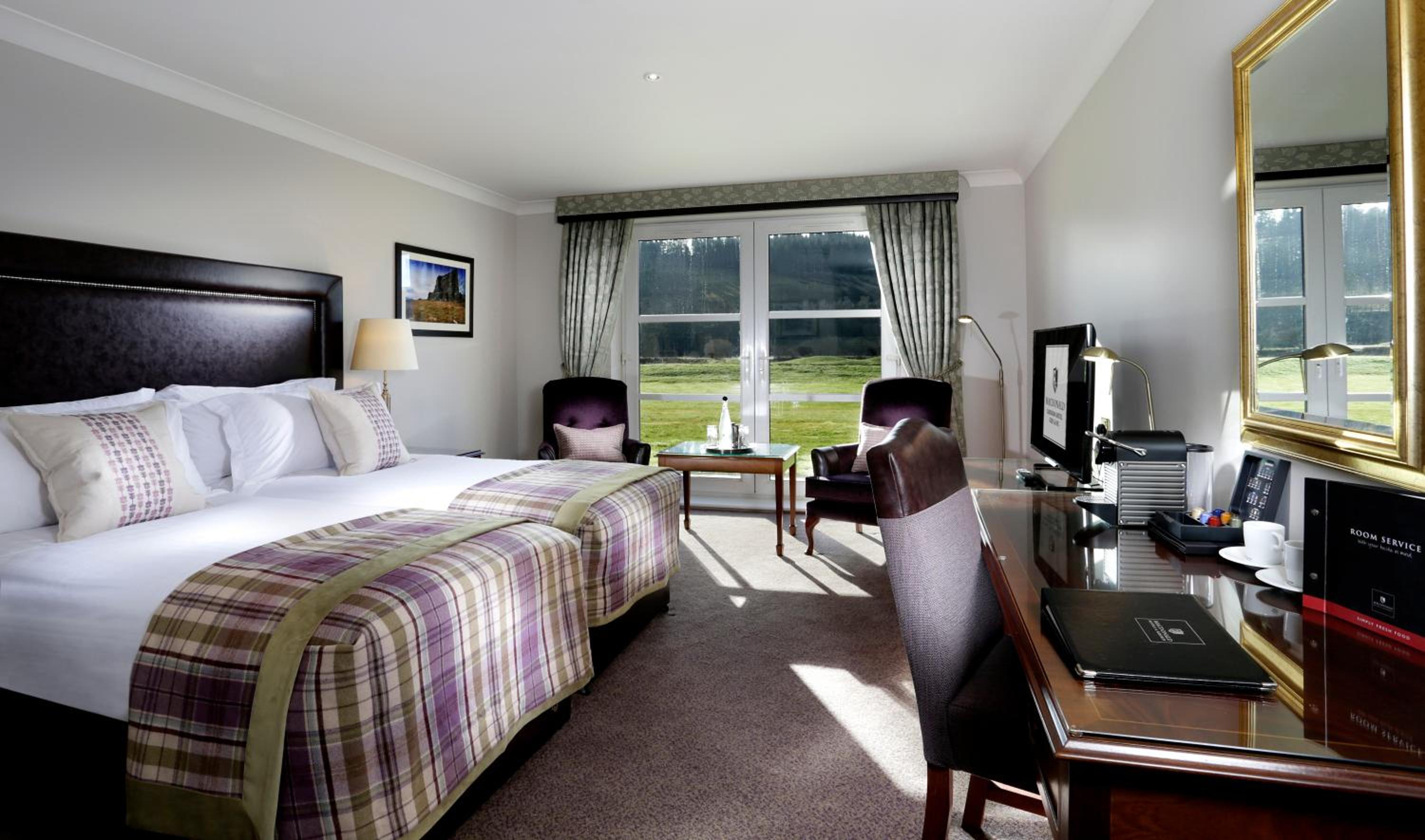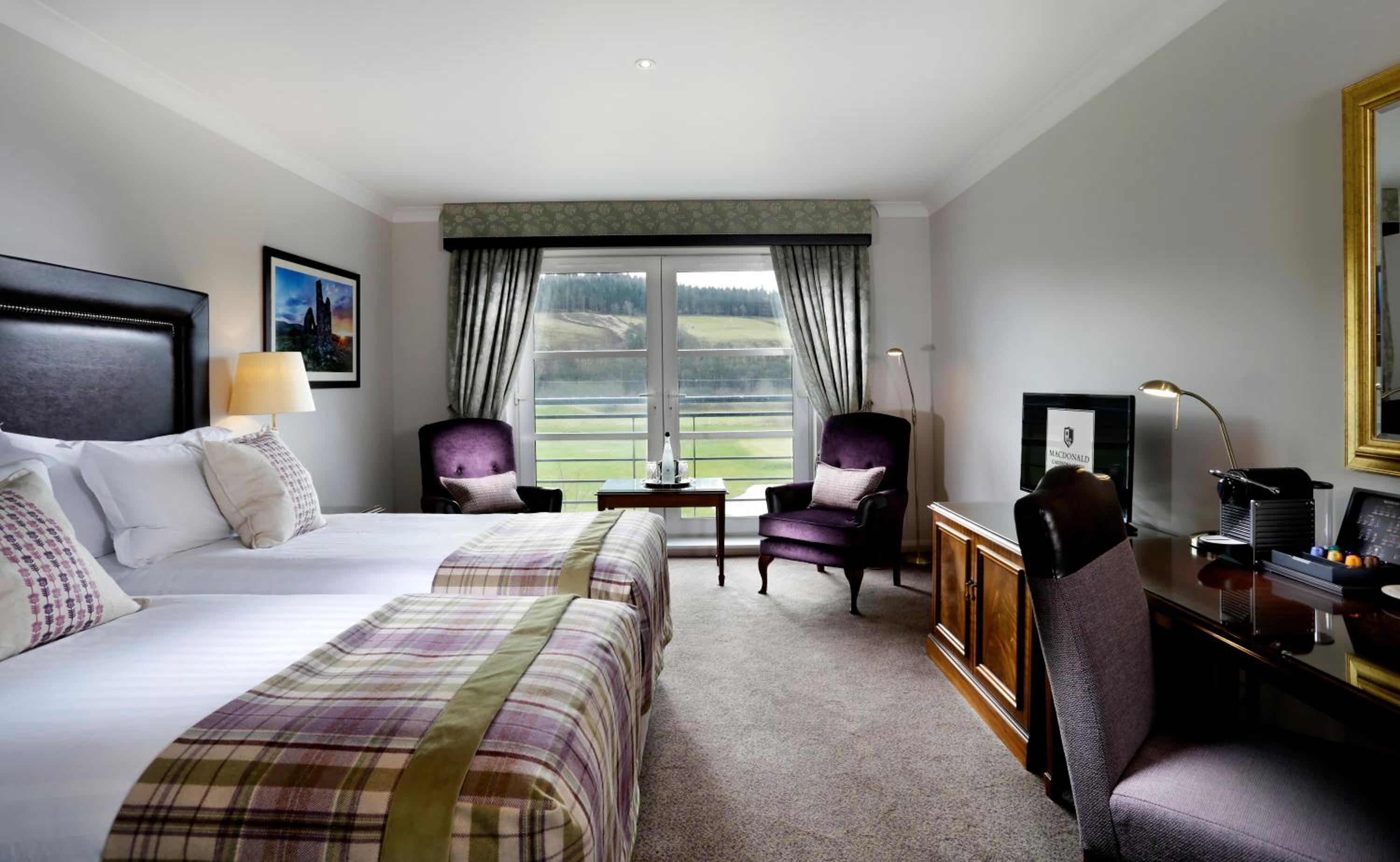 Experience a tranquil stay at the 4-star Macdonald Cardrona Hotel, Golf & Spa, nestled by the River Tweed. Enjoy blackout curtains in every room for a restful sleep and picturesque views of the Border Hills or the golf course.