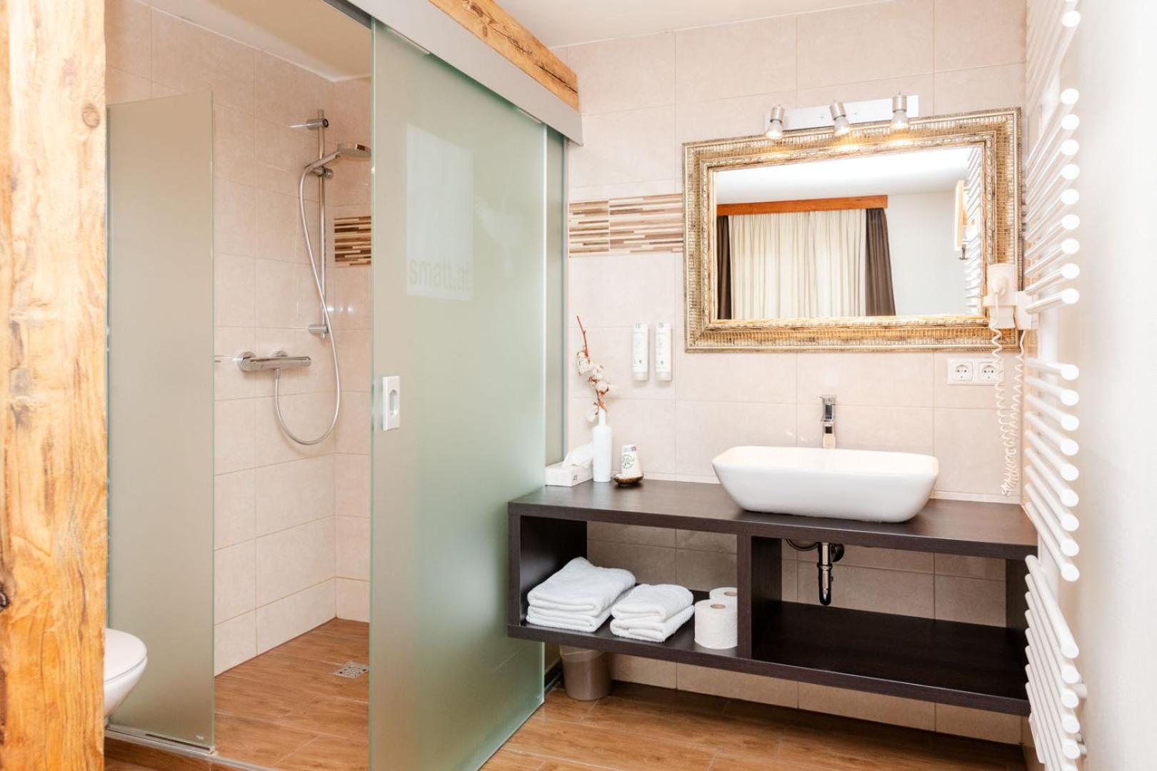 Comfortable Rooms: Individually furnished rooms with modern amenities including flat-screen TV, safe, and stylish bathrooms with complimentary toiletries.