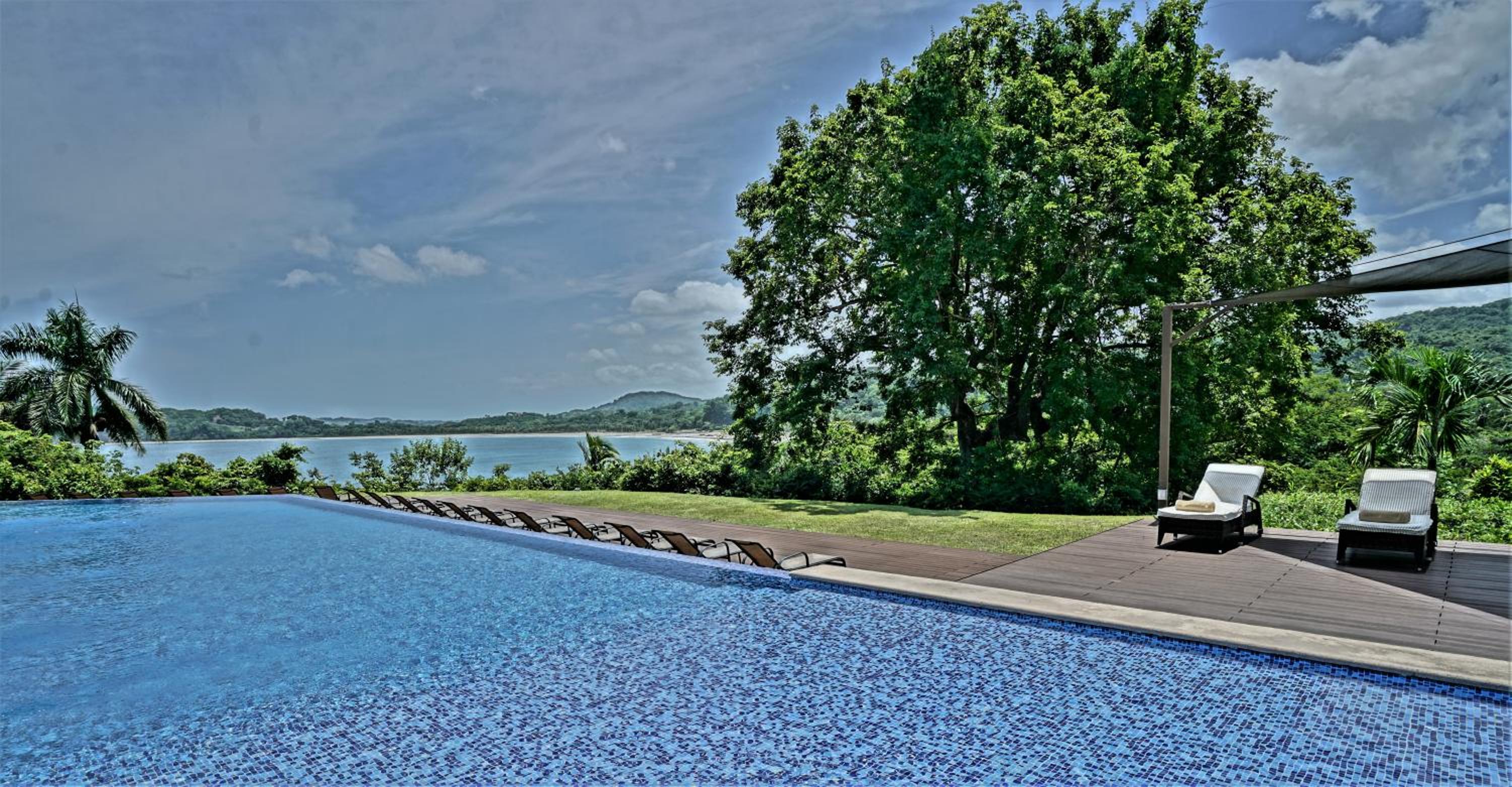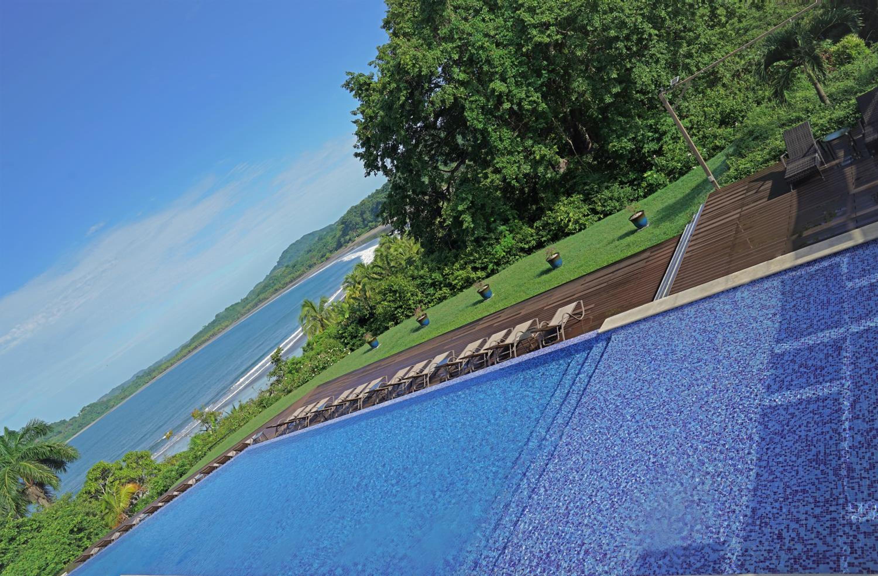 The swimming pool has a great view of the beach and its big.