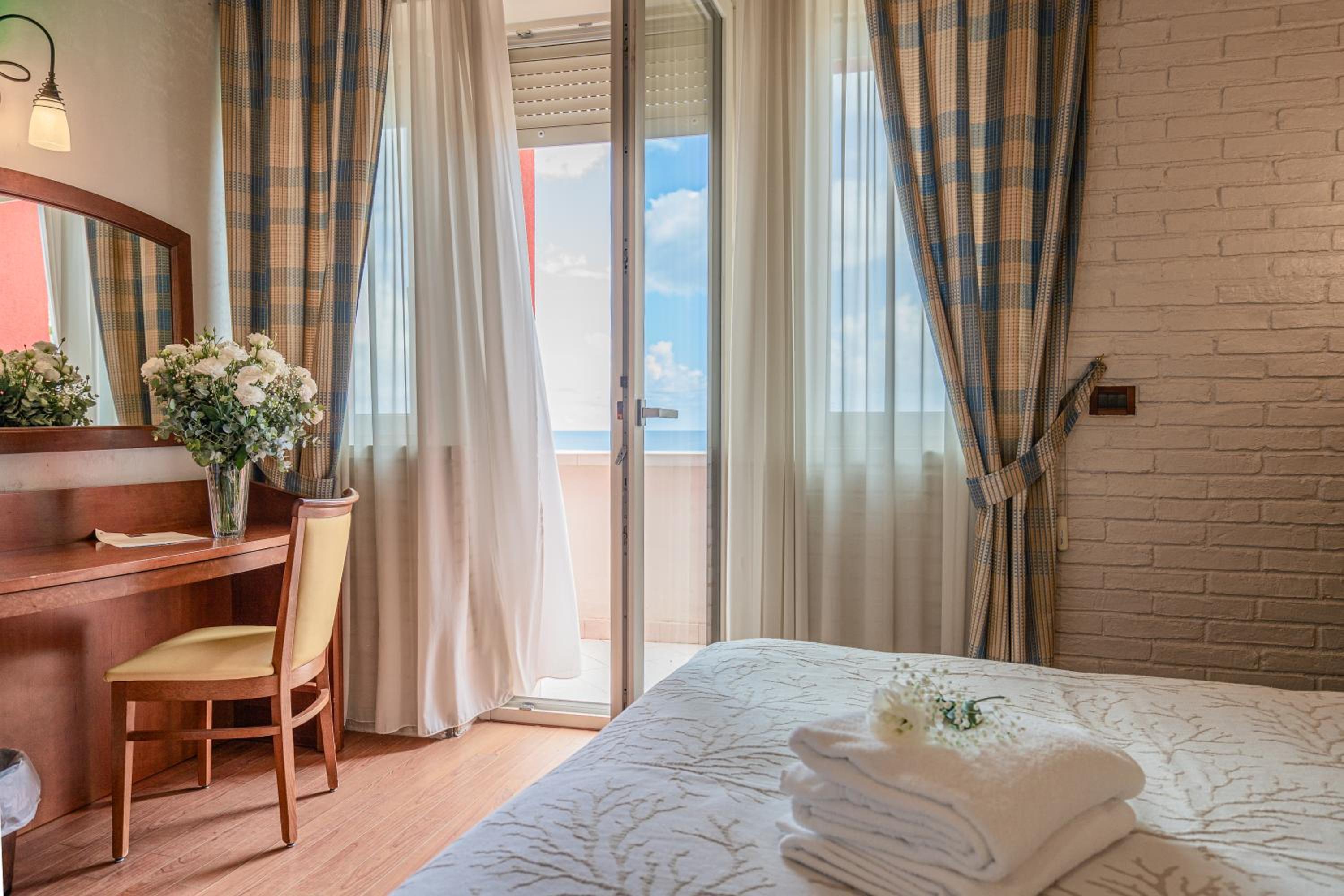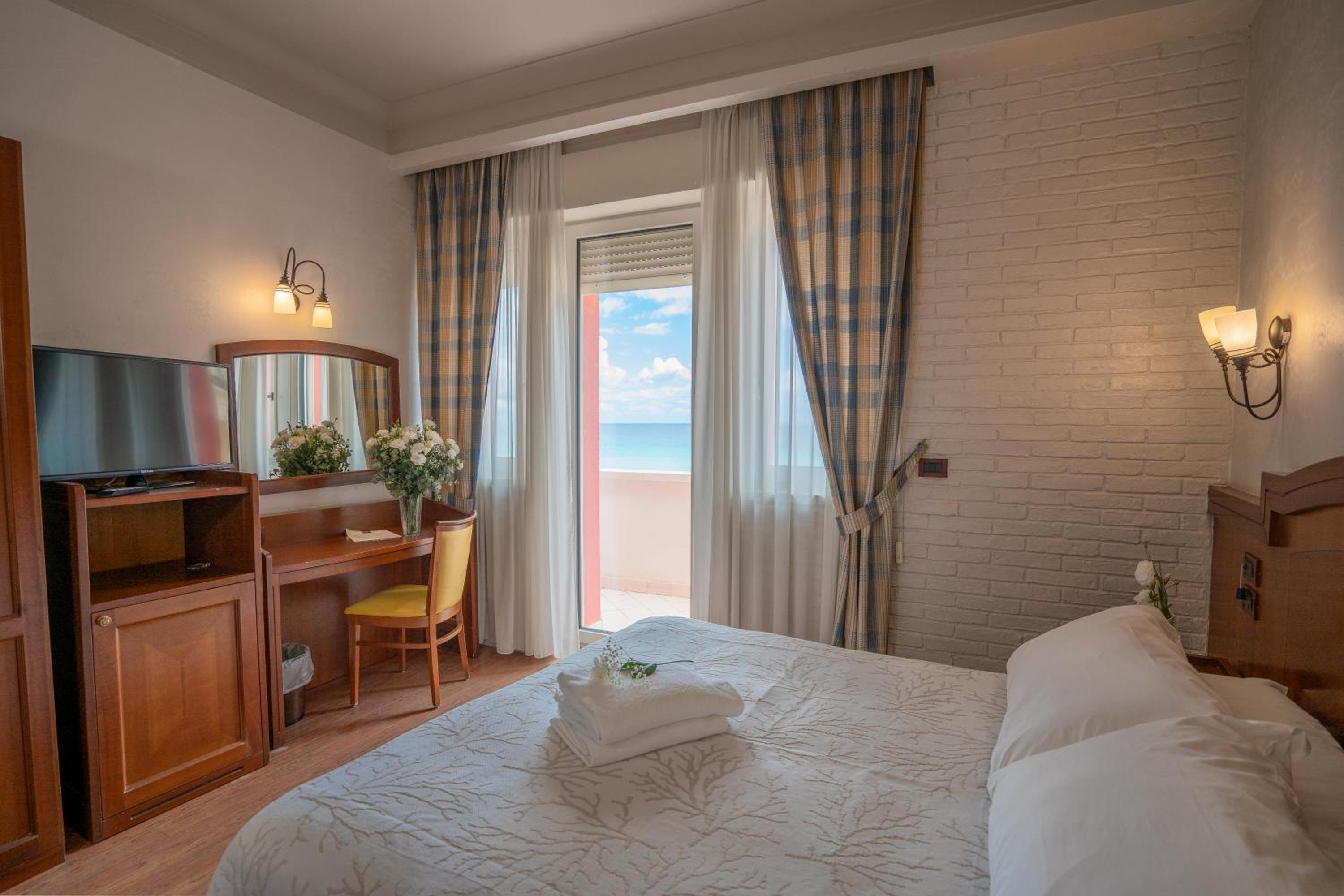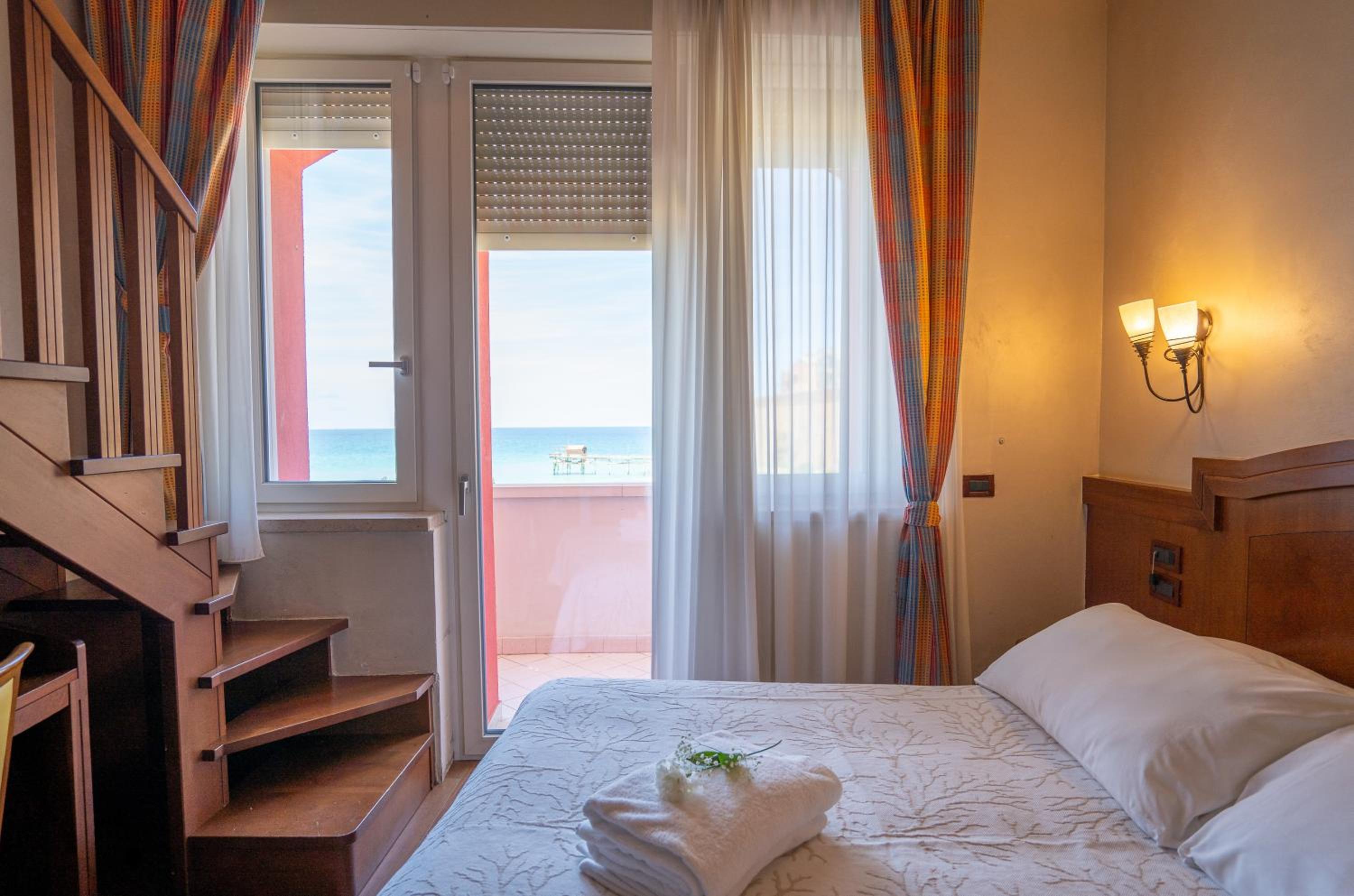 Stanza con vista sul mare molto bella, si sente il rumore del mare che rilassa. La struttura non e’ caotica, anzi, la colazione ha un po di tutto, molto accogliente la sala, non c’è confusione.