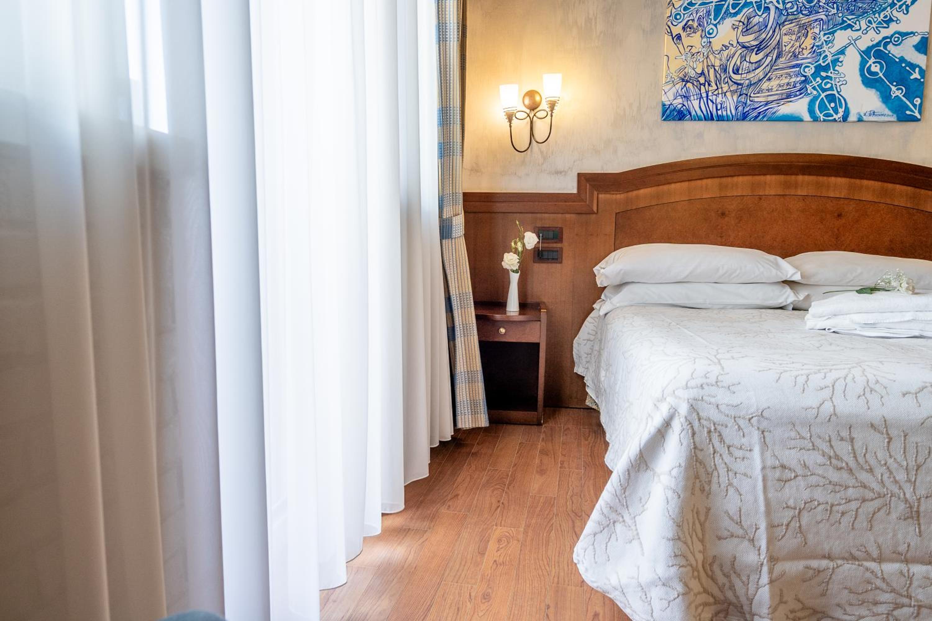 Die Lage des Hotels ist sowohl zum Strand als auch zum alten und neuen Zentrum und zum Hafen und Bahnhof optimal. Das Frühstück ist typisch italienisch und hat auch eine Auswahl von Wurst- und Käsesorten. Es wird auch Müsli und Obst angeboten. Das Personal ist allgemein sehr hilfsbereit. Der Strand ist ungefähr 5 Minuten entfernt und war sehr sauber. Hinweis zur Parkplatzsituation: Das Hotel selbst hat die Möglichekeit zum Be- und Enladen des Autos. Geparkt werden kann auf einem nahegelegenen Parkplatz (Piazza Sant'Antonio) in den "blauen" Zonen. Das kostet 5€ von 08:30 - 24:00 und ist an Parkuhren zu bezahlen.
