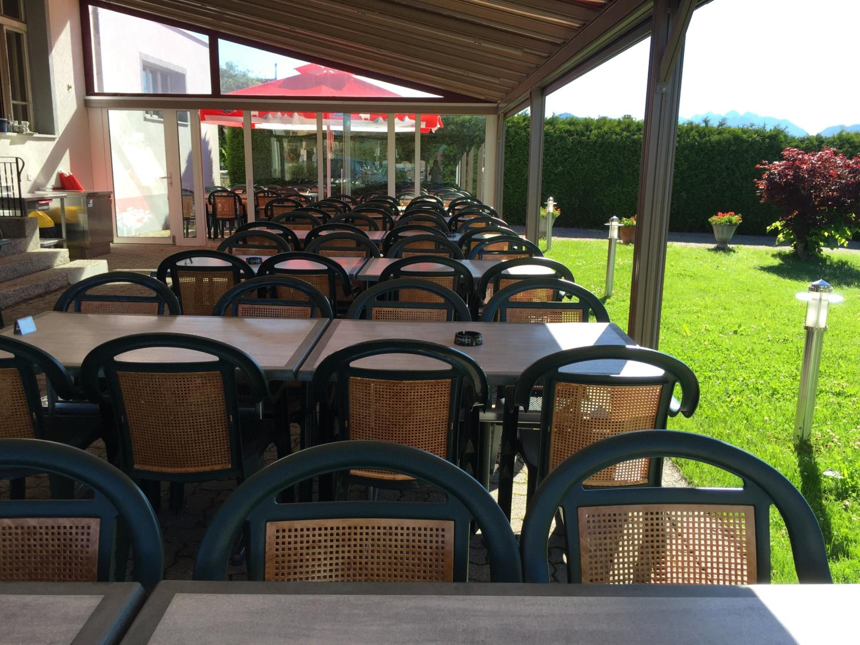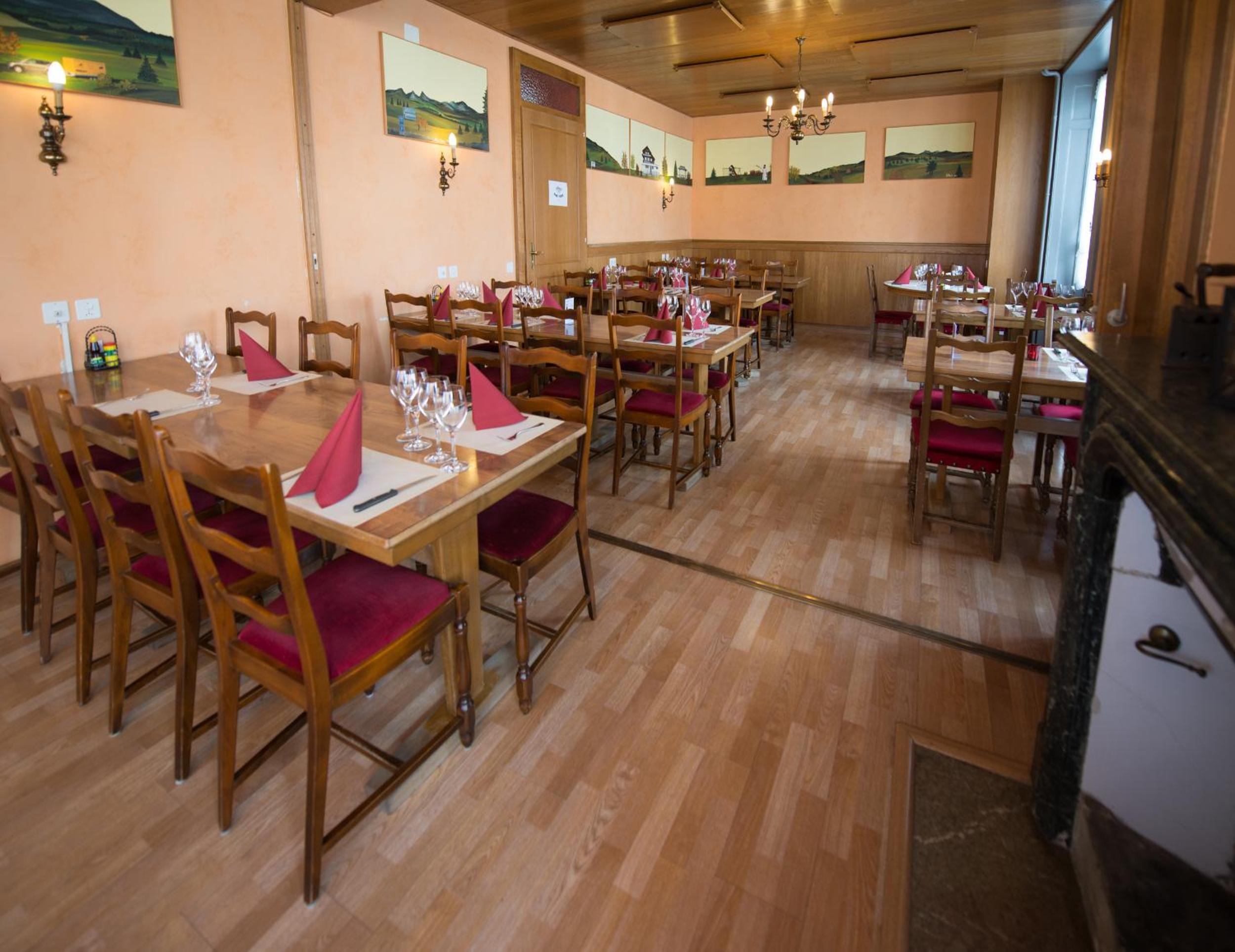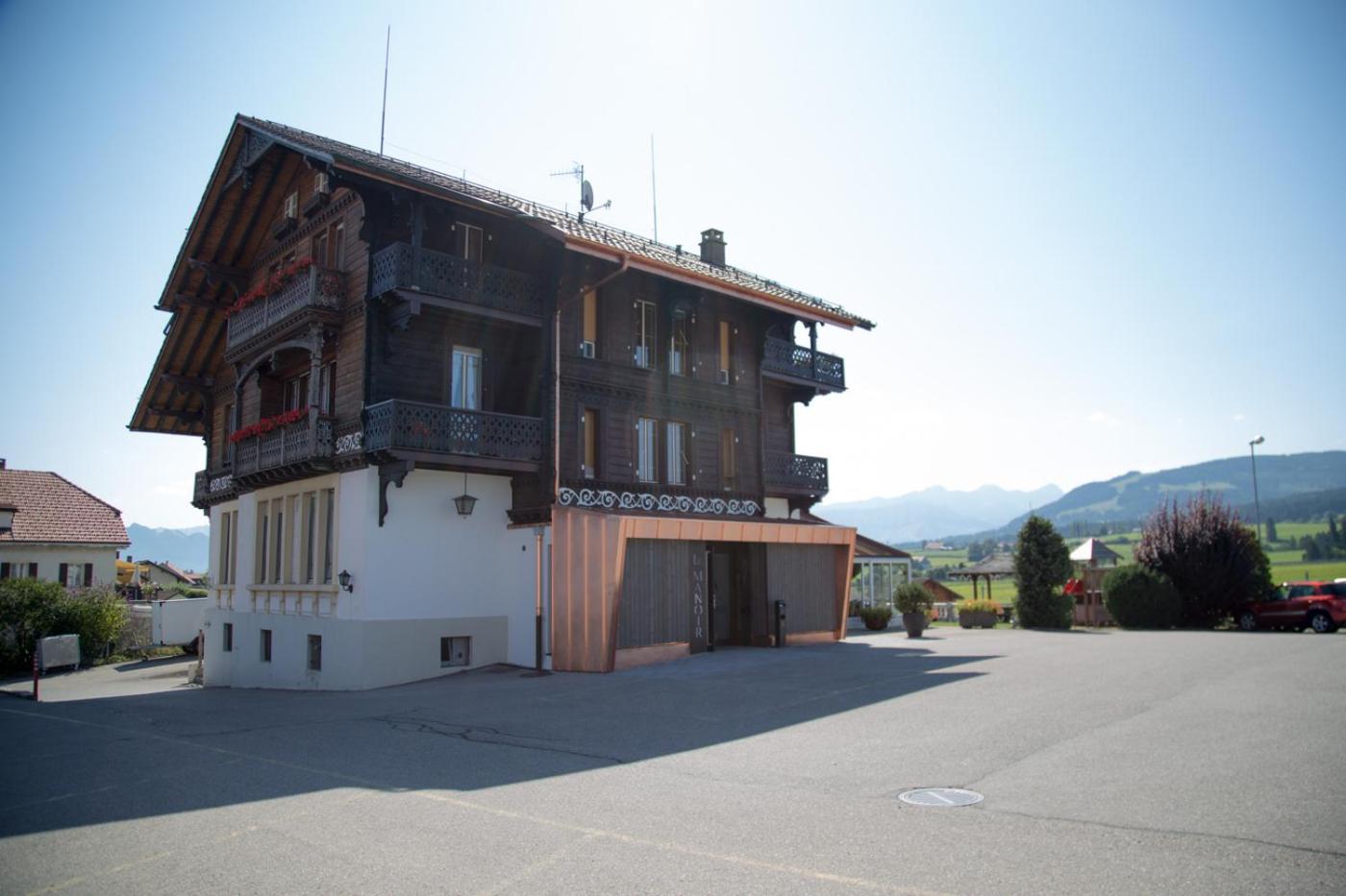 Enjoy breathtaking views of the surrounding countryside from the terrace of Hôtel - Restaurant Le Manoir while indulging in delicious Swiss cuisine and regional specialties at the on-site restaurant.