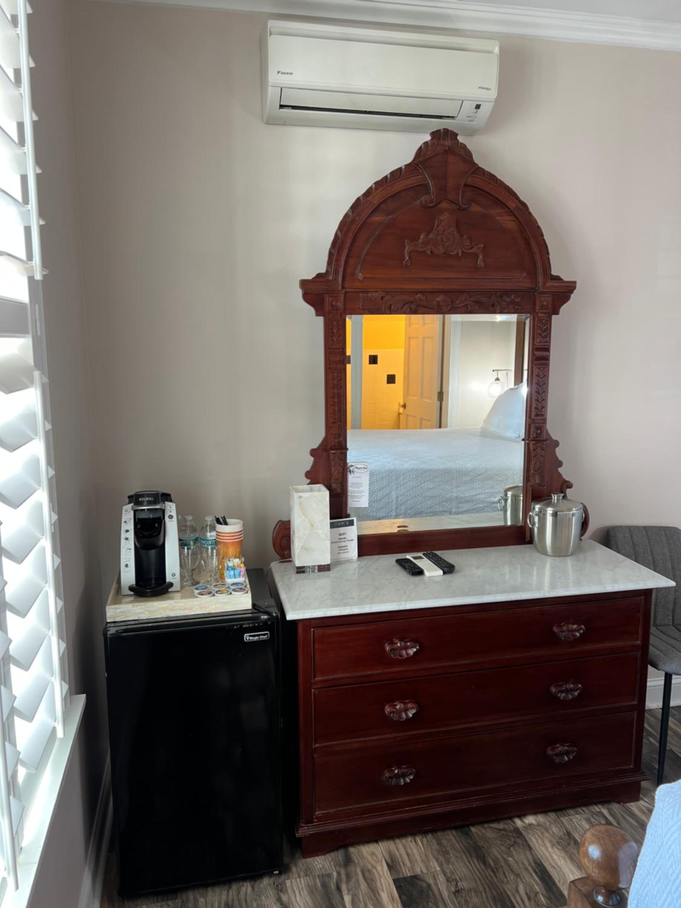 Staff was friendly, knowledgeable and helpful. Food was good and menu choices good. Good location - walking distance to shops and the beach. Room was clean and liked the small amenities like complimentary bottled water in room.