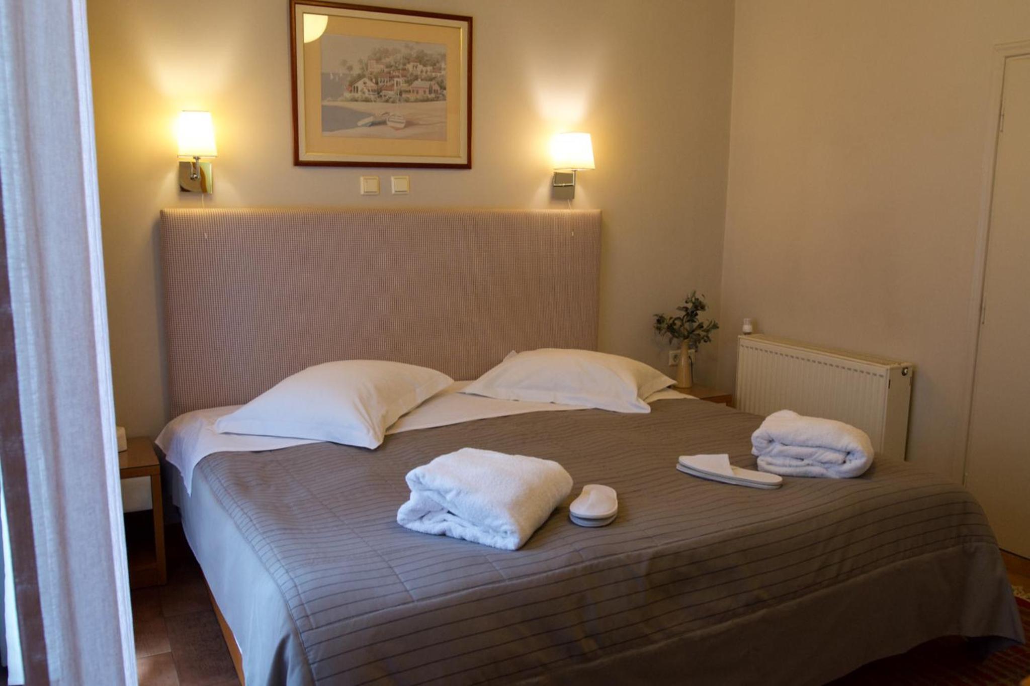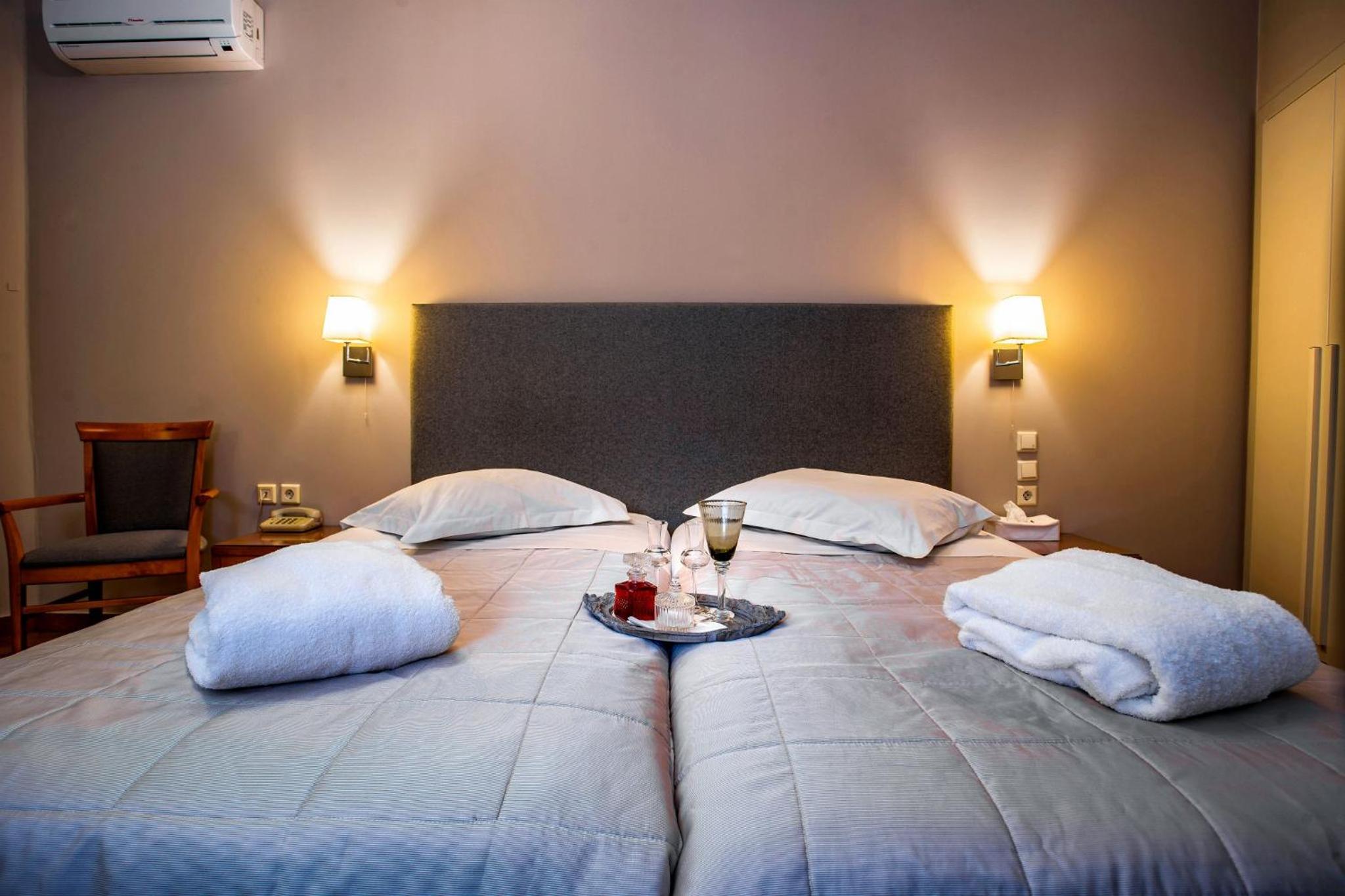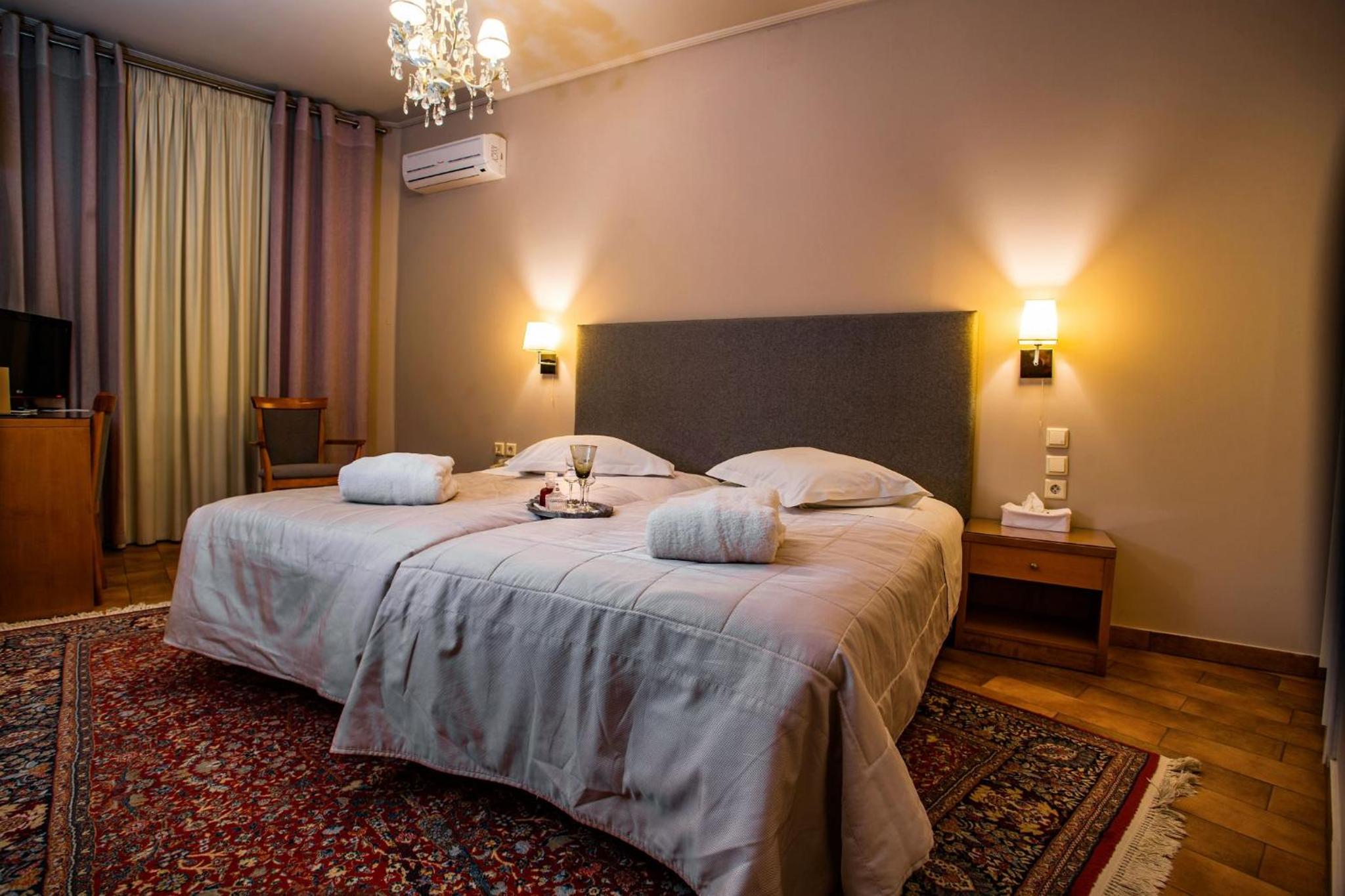 Esperia Boutique Hotel in Agrinio offers elegant rooms with modern amenities, including a flat-screen TV and a coffee machine. Indulge in comfort with provided bathrobes and slippers for a relaxing stay.