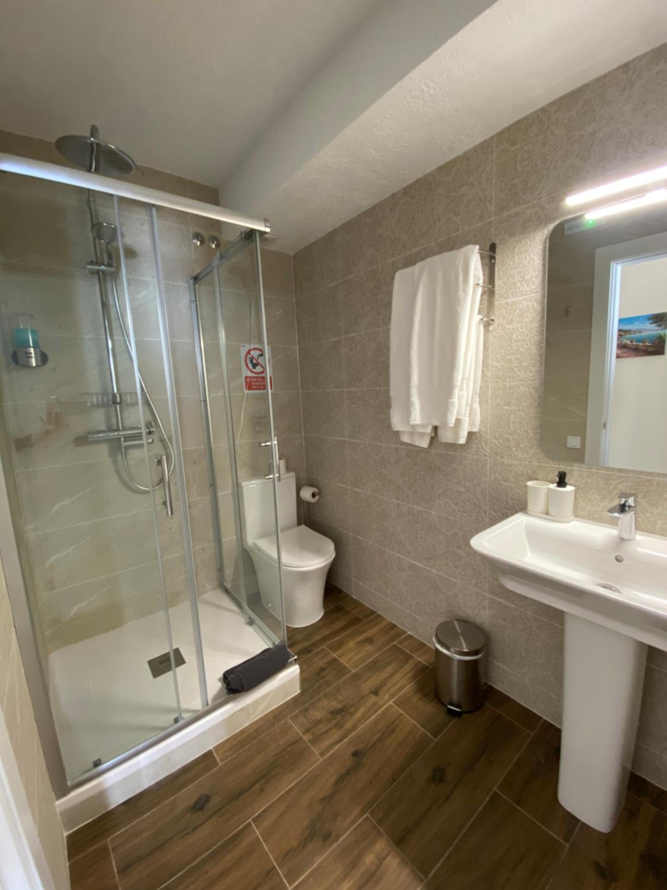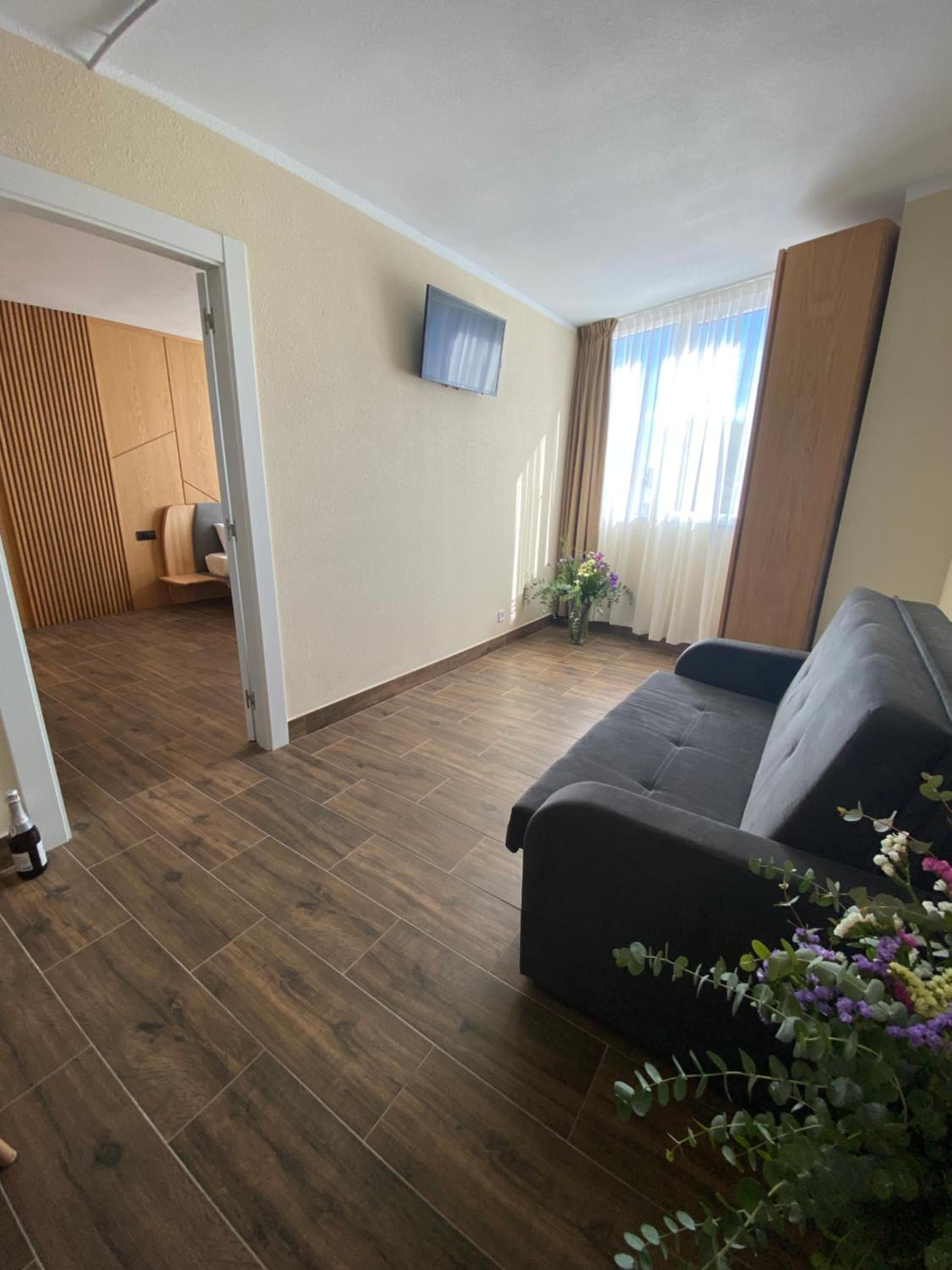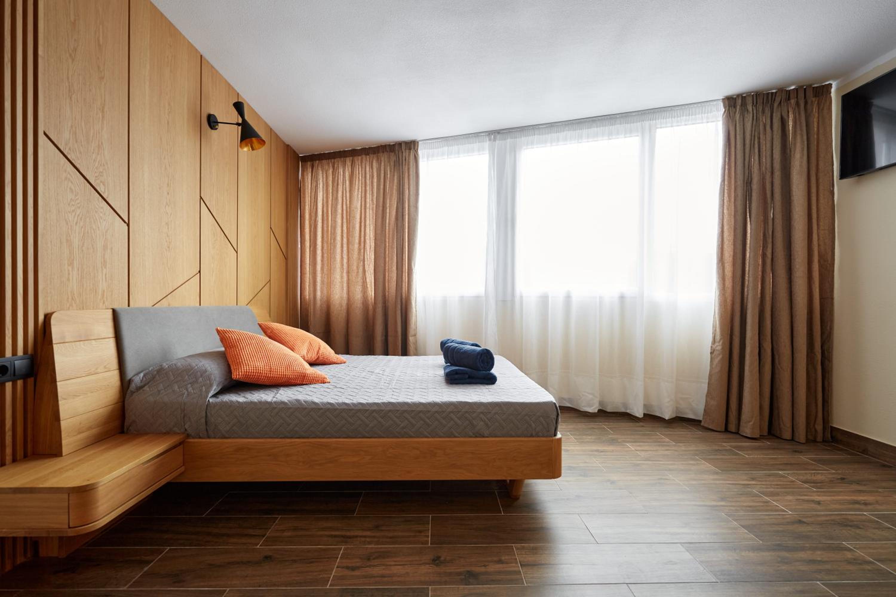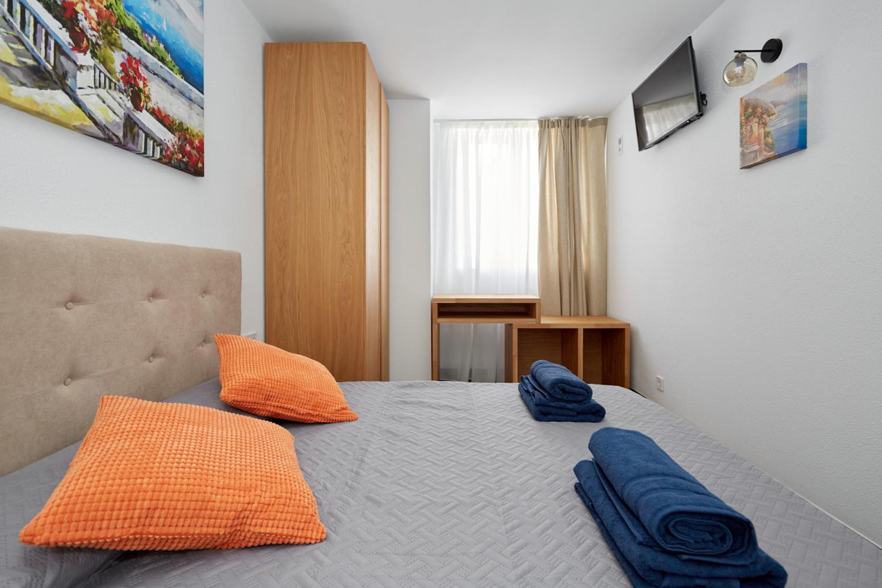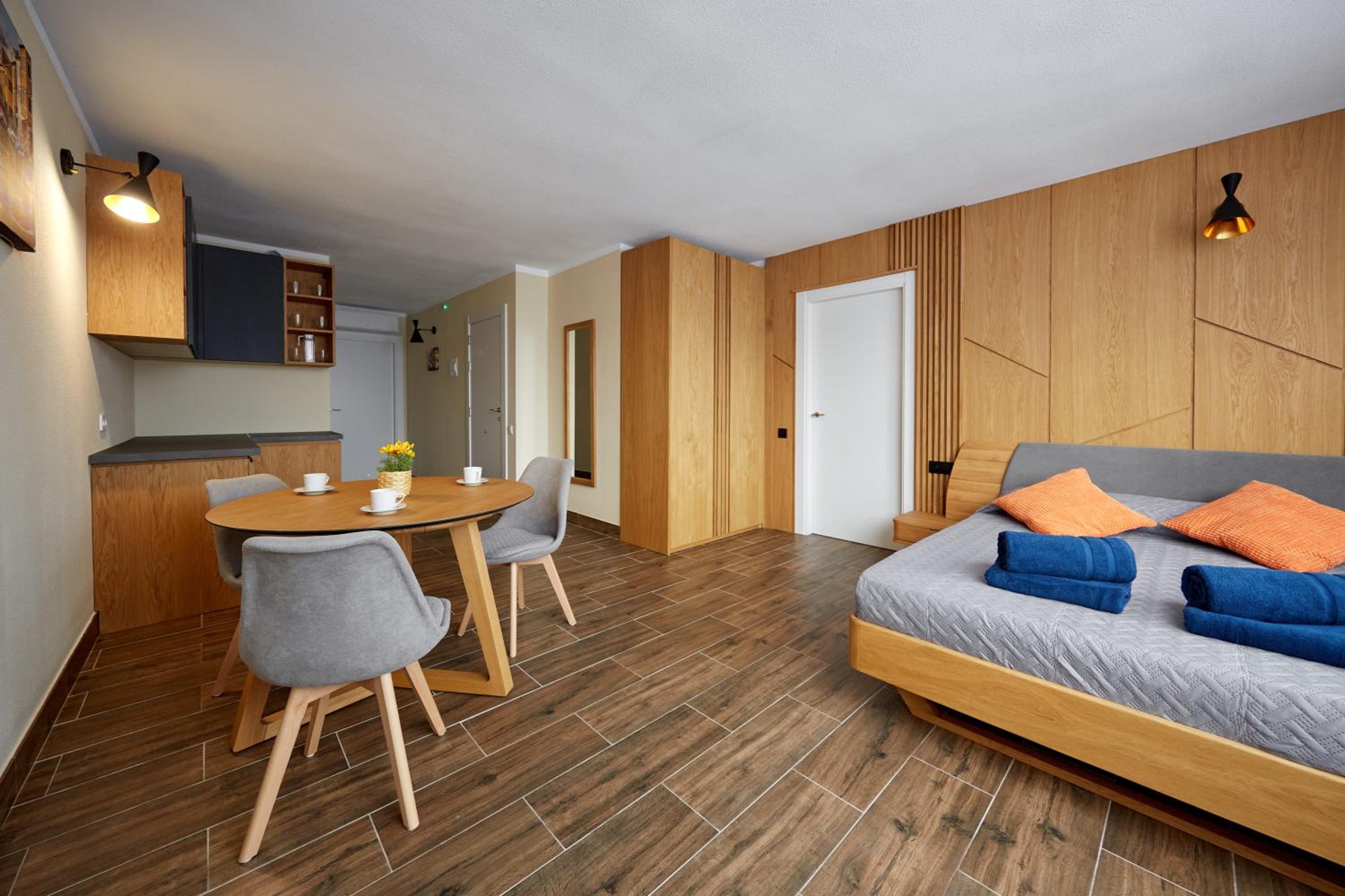 Bardzo czysto, łazienka perfekcyjnie czysta, żel pod prysznic i szampon pod prysznicem. Wygodne łóżka, cicho. W pokoju mini lodówka talerze, sztućce i kubki, płyn do mycia naczyn i gąbka. W holu do dyspozycji czajnik oraz mikrofalówka.