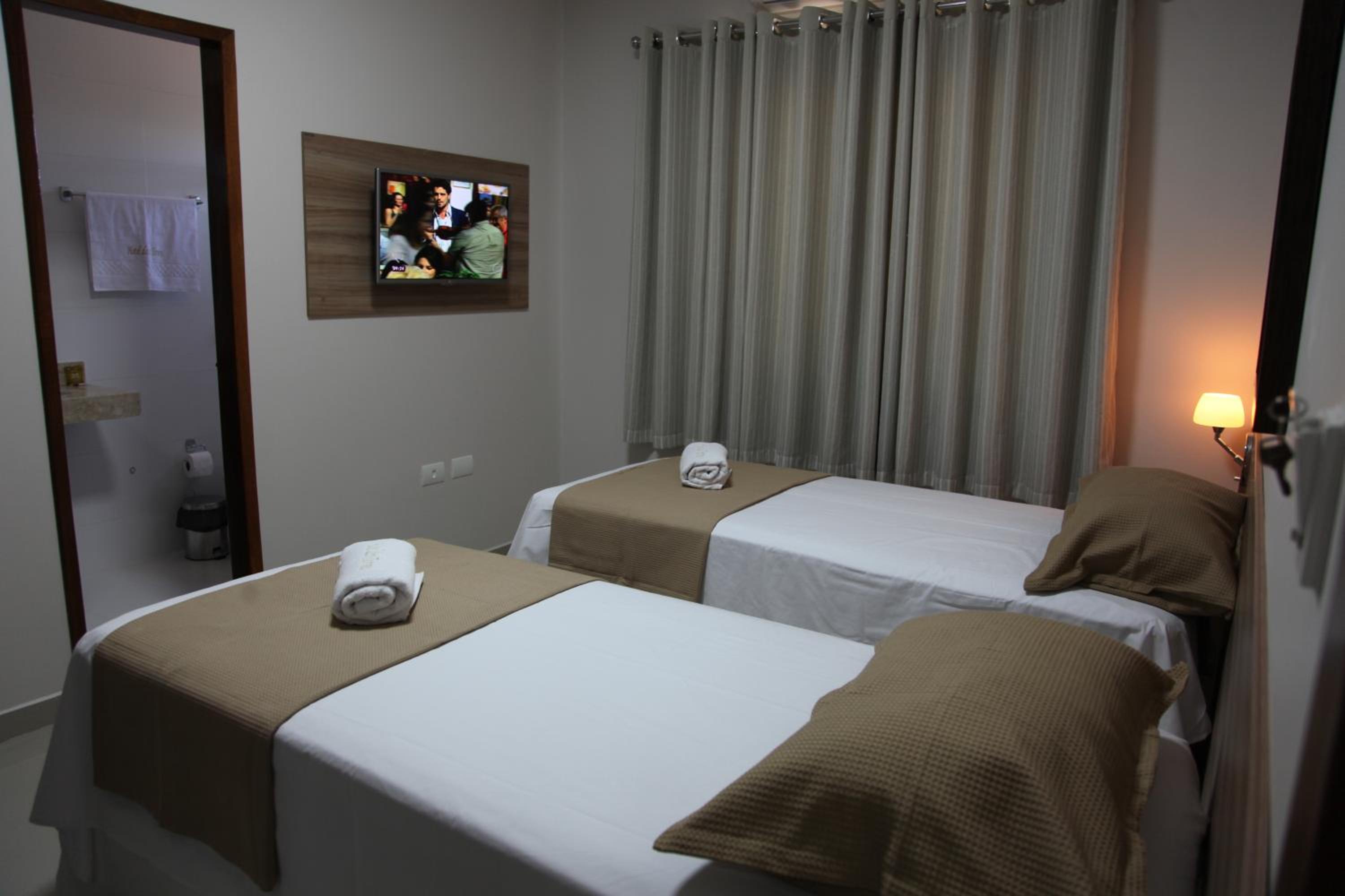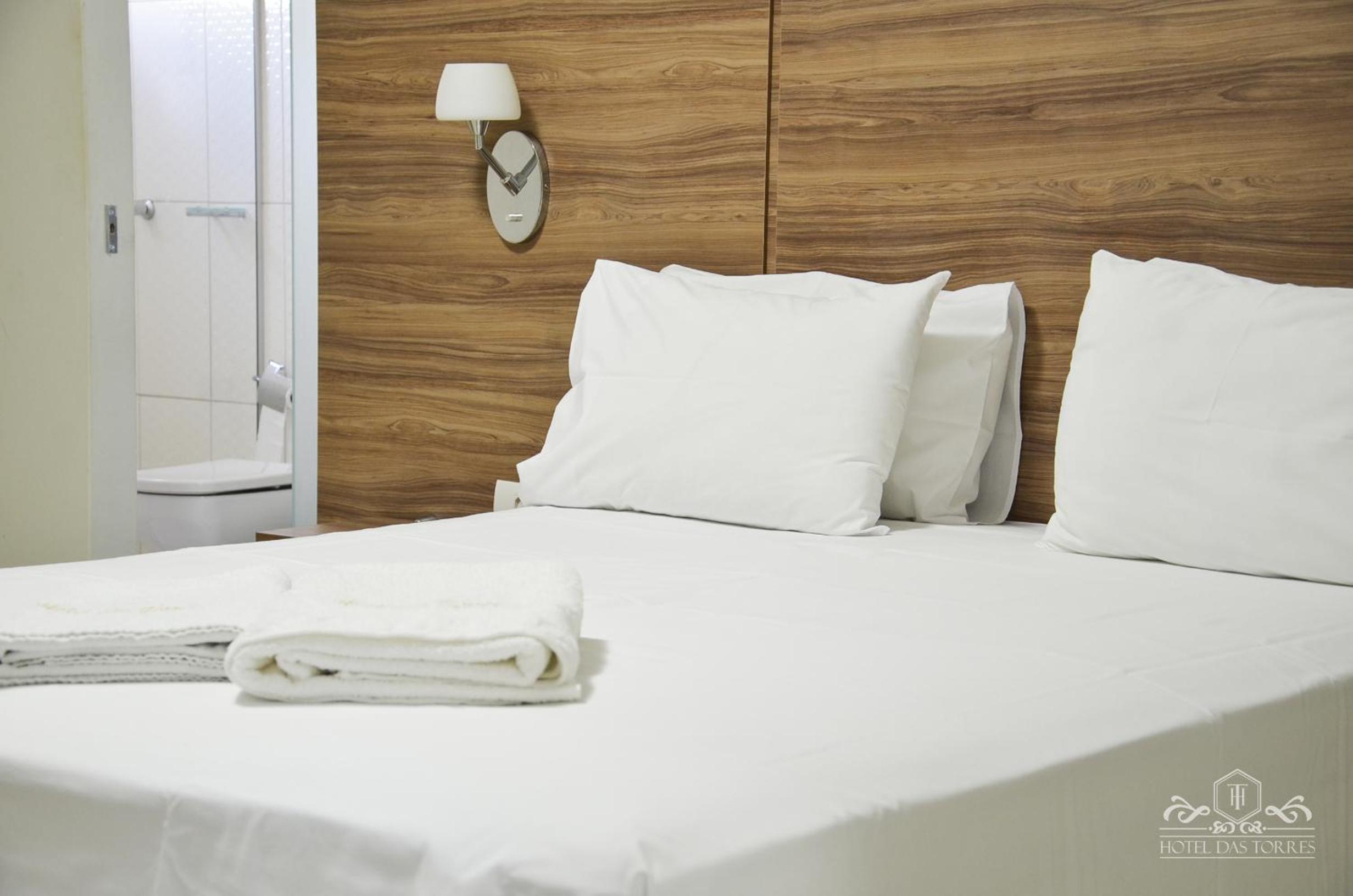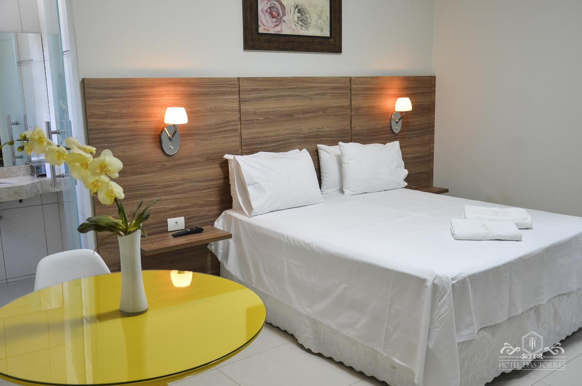 Each room at Hotel das Torres is thoughtfully equipped with a desk, flat-screen TV, and a private bathroom. The cozy accommodations also provide guests with fresh bed linen, towels, air conditioning, and a wardrobe for convenience.