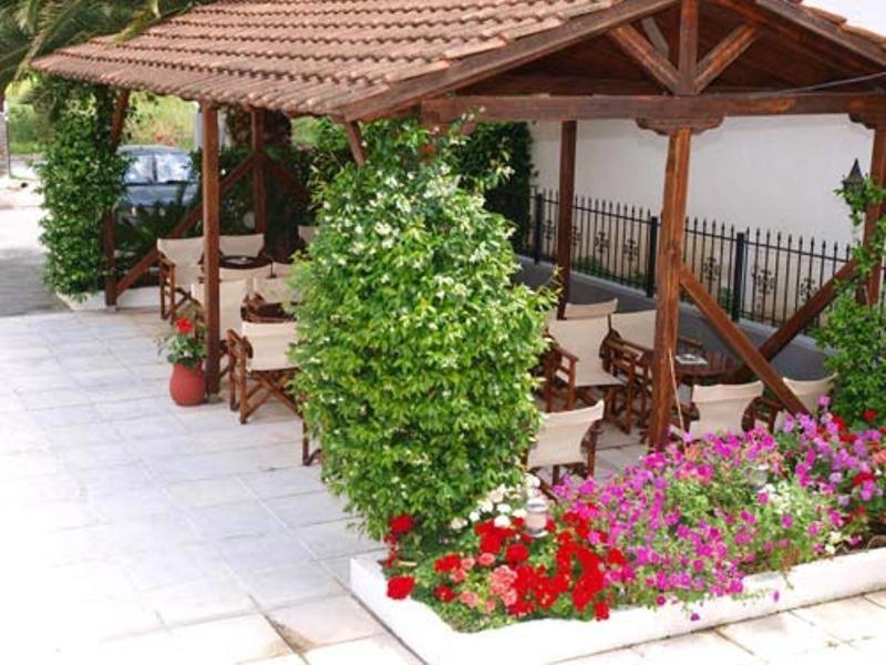 Relaxing Garden Atmosphere: Enjoy the serene fragrant garden with a snack bar at Hotel Markos, just steps away from the sandy beach.