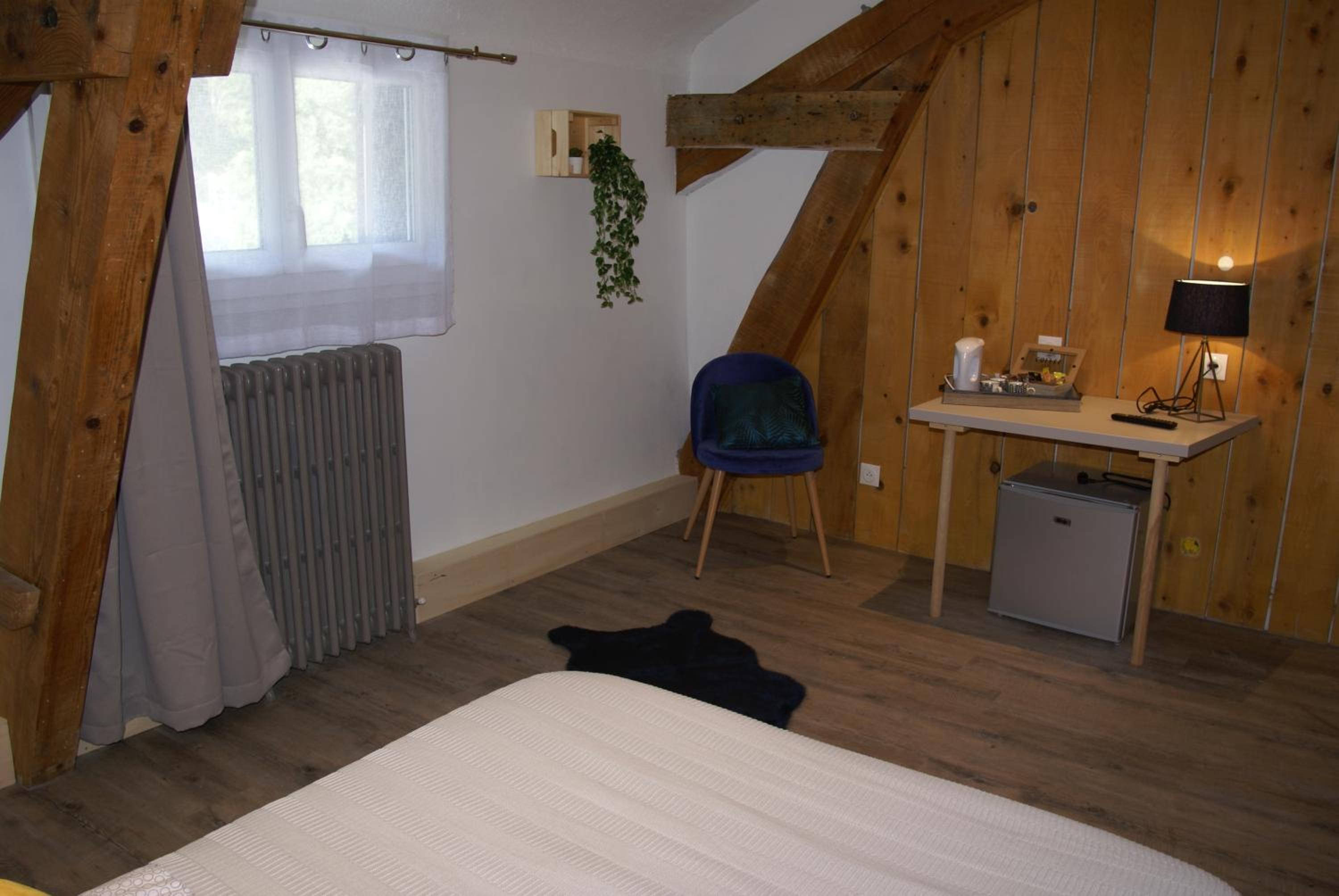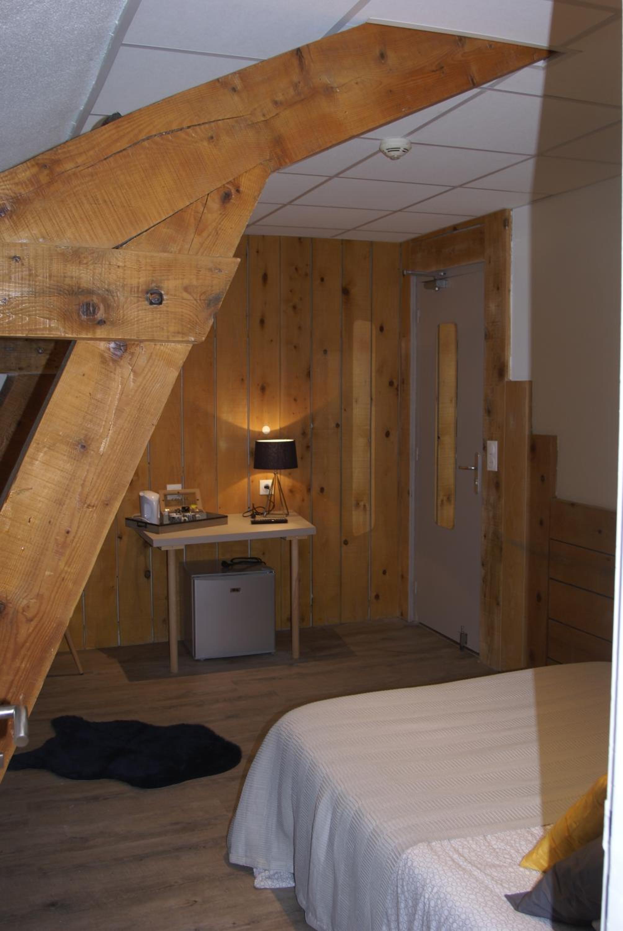 Enjoy the rustic charm of exposed wooden beams and wood-panelled walls in rooms equipped with a flat-screen TV, fridge, hairdryer, and complimentary toiletries for a comfortable stay.
