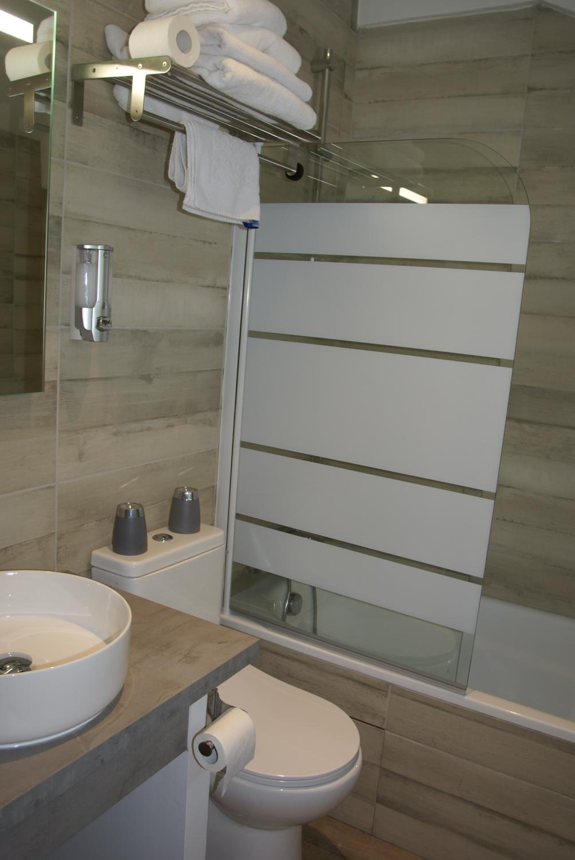 La habitación amplia con un baño muy cómodo y funcional.