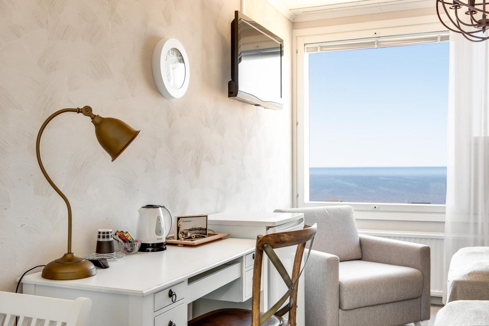 Päärakennuksen huoneissa ei ilmastointia, mutta pieni pöytätuuletin löytyy. Ikkunan ja huoneen oven avaamalla sai pienen ristivedon , ja yöksi viilentynyt ilma auttoi saamaan unen päästä kiinni myös hellekautena. Kylppärin saumat kaipaavat tehopuhdistusta.