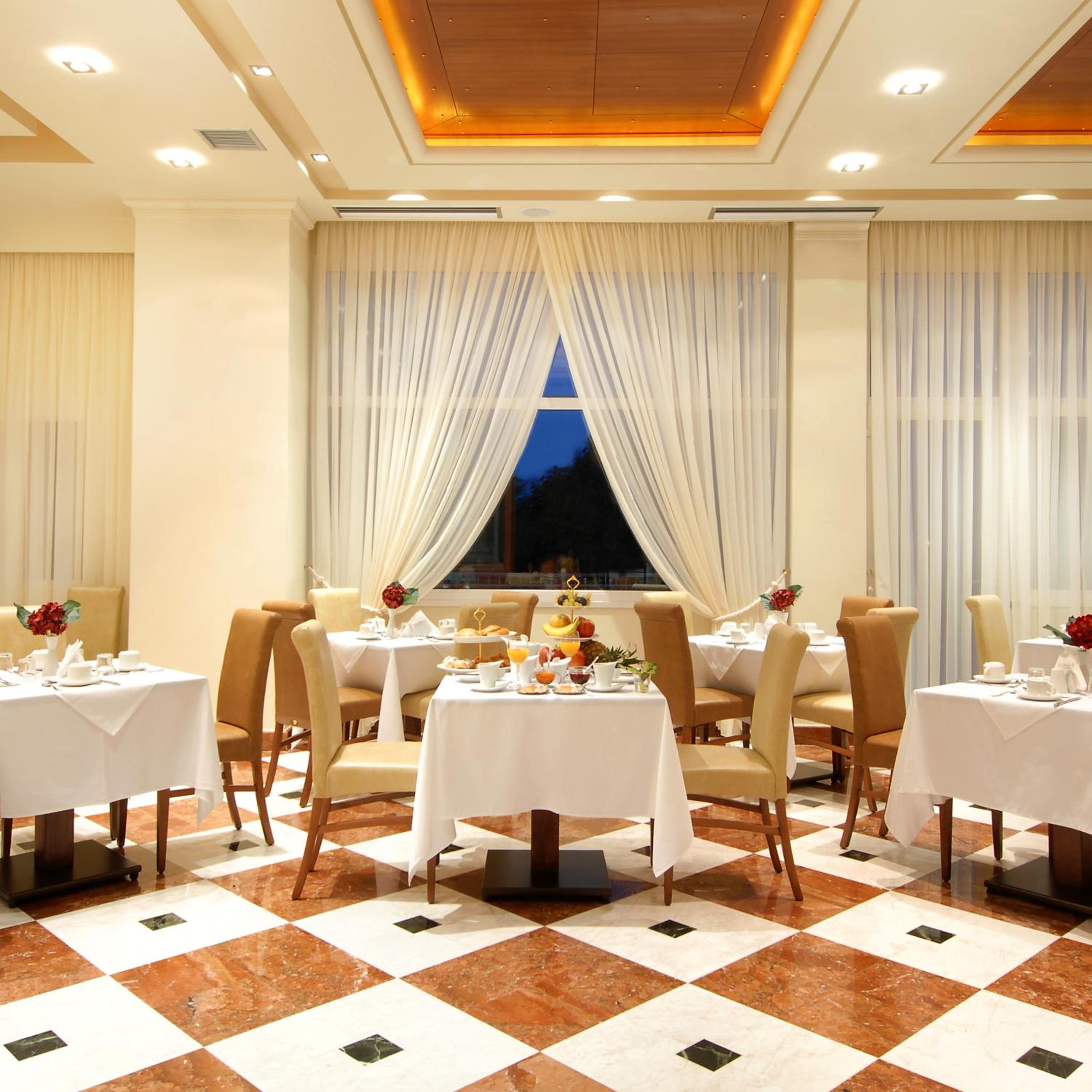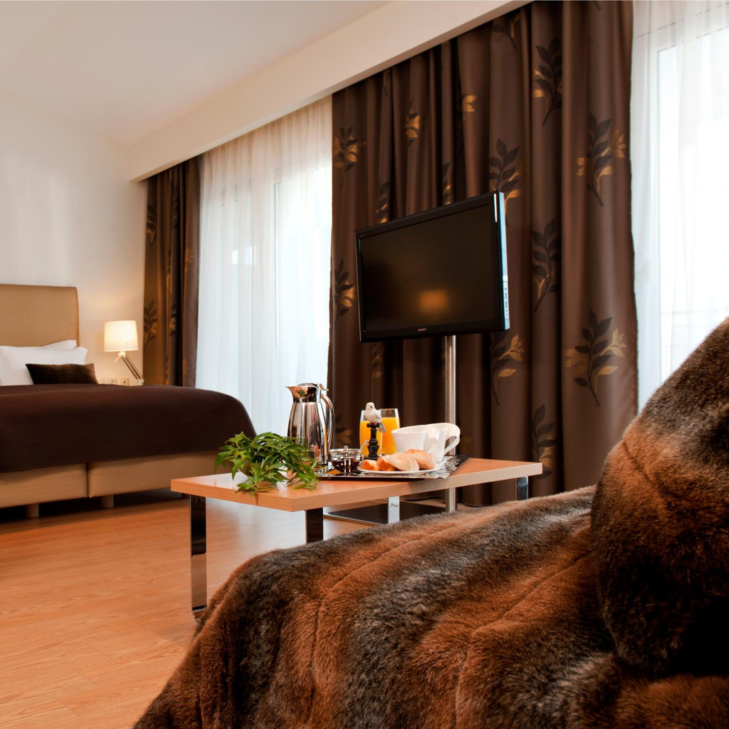 Experience comfort in spacious rooms adorned in earthly tones, seamlessly blending classical style with modern amenities. Each room features a balcony, satellite TV, minibar, fridge, and plush beds with COCO-MAT feather duvets.