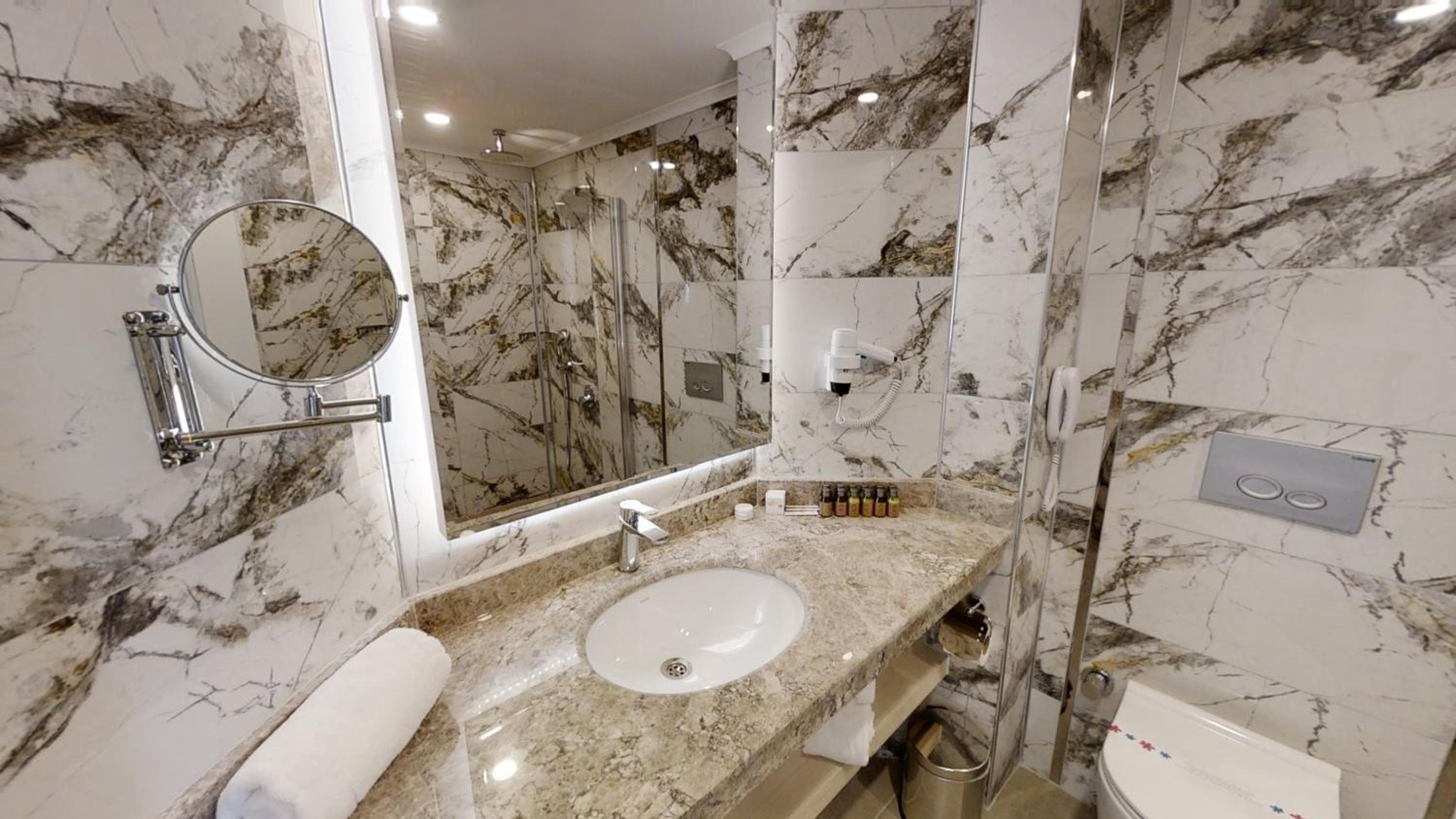 Feel at home with our reception staff fluent in German, Russian, English, and Turkish, available 24/7 to assist you. With amenities like a balcony with pool views and a flat-screen TV, your comfort is our priority.