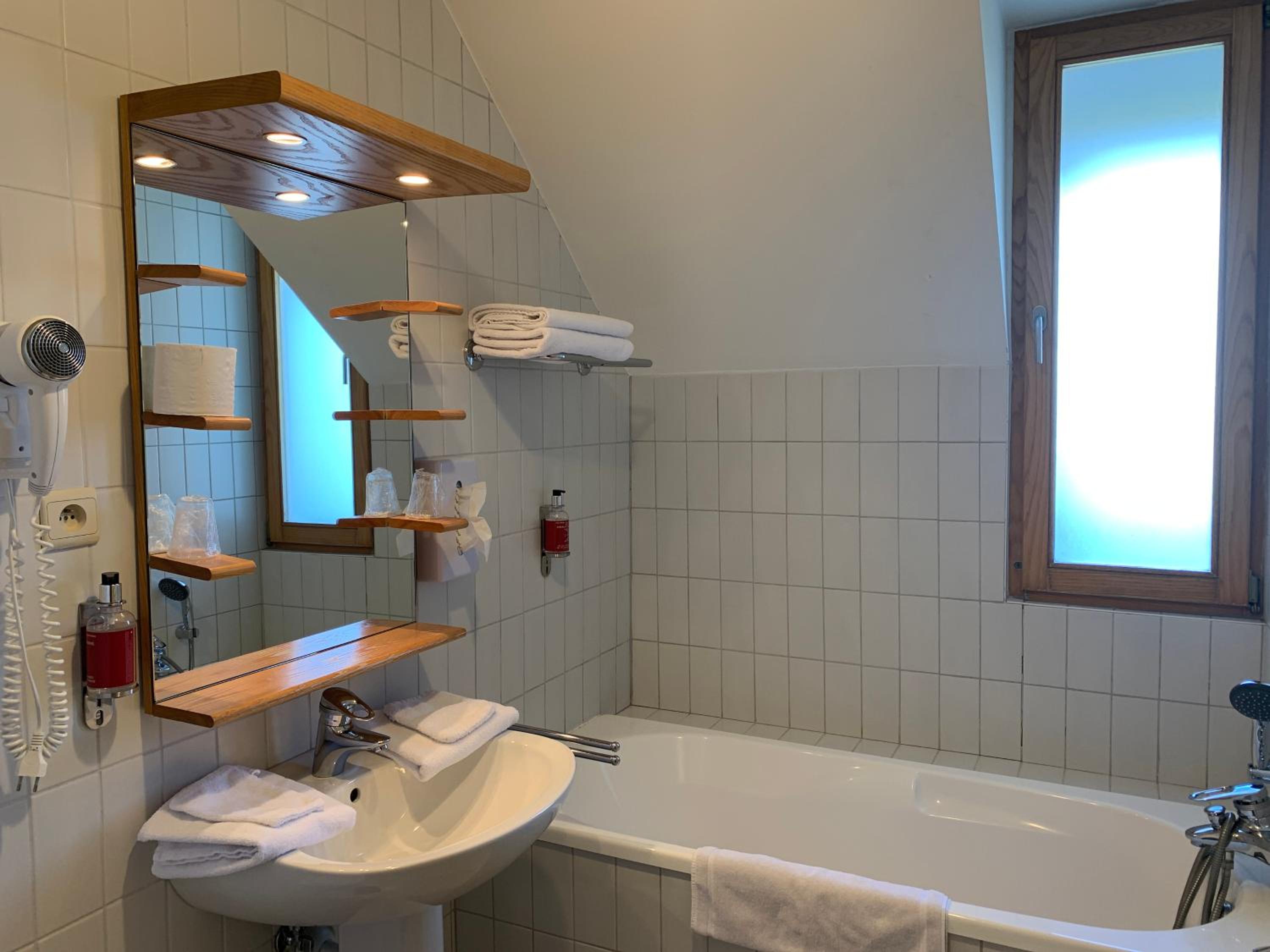La salle de bain , très propre , est un peu vétuste . Un petit coup de pinceau à proximité de la fenêtre et hop , c'est reparti .