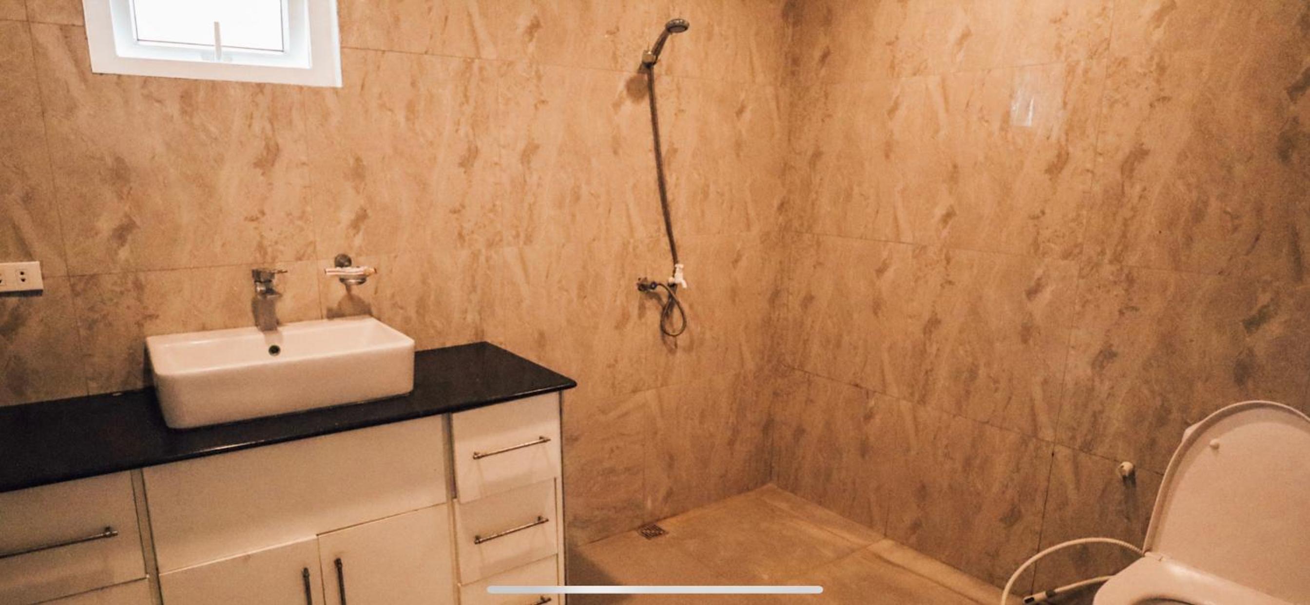 The bathroom was atrocious. The shower was through a rubber hose barely clinging to the wall. The sink tap was only dripping water.