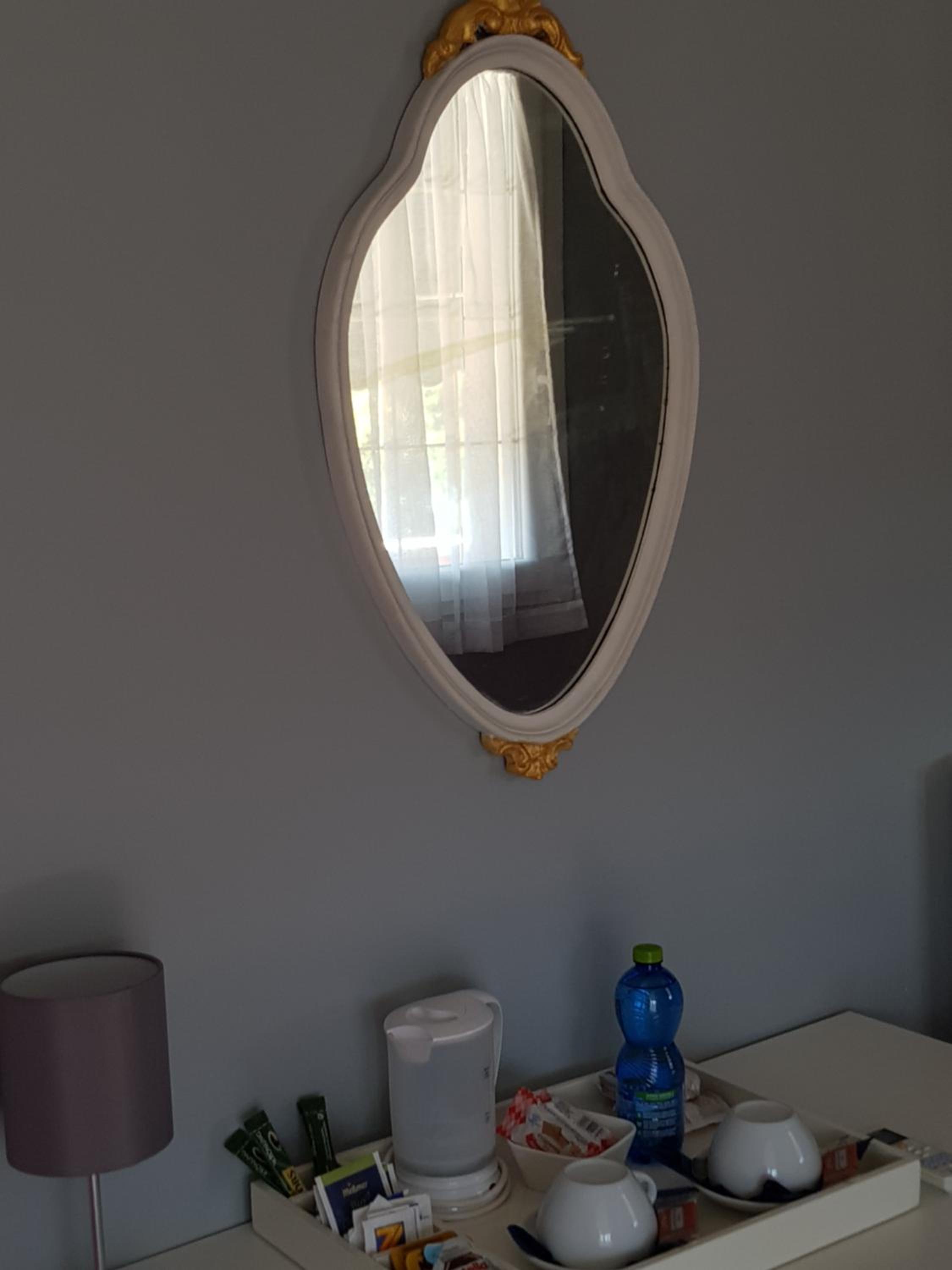 Chambre sombre et avec peu de place car très encombrée par des meubles anciens. Petite douche.
