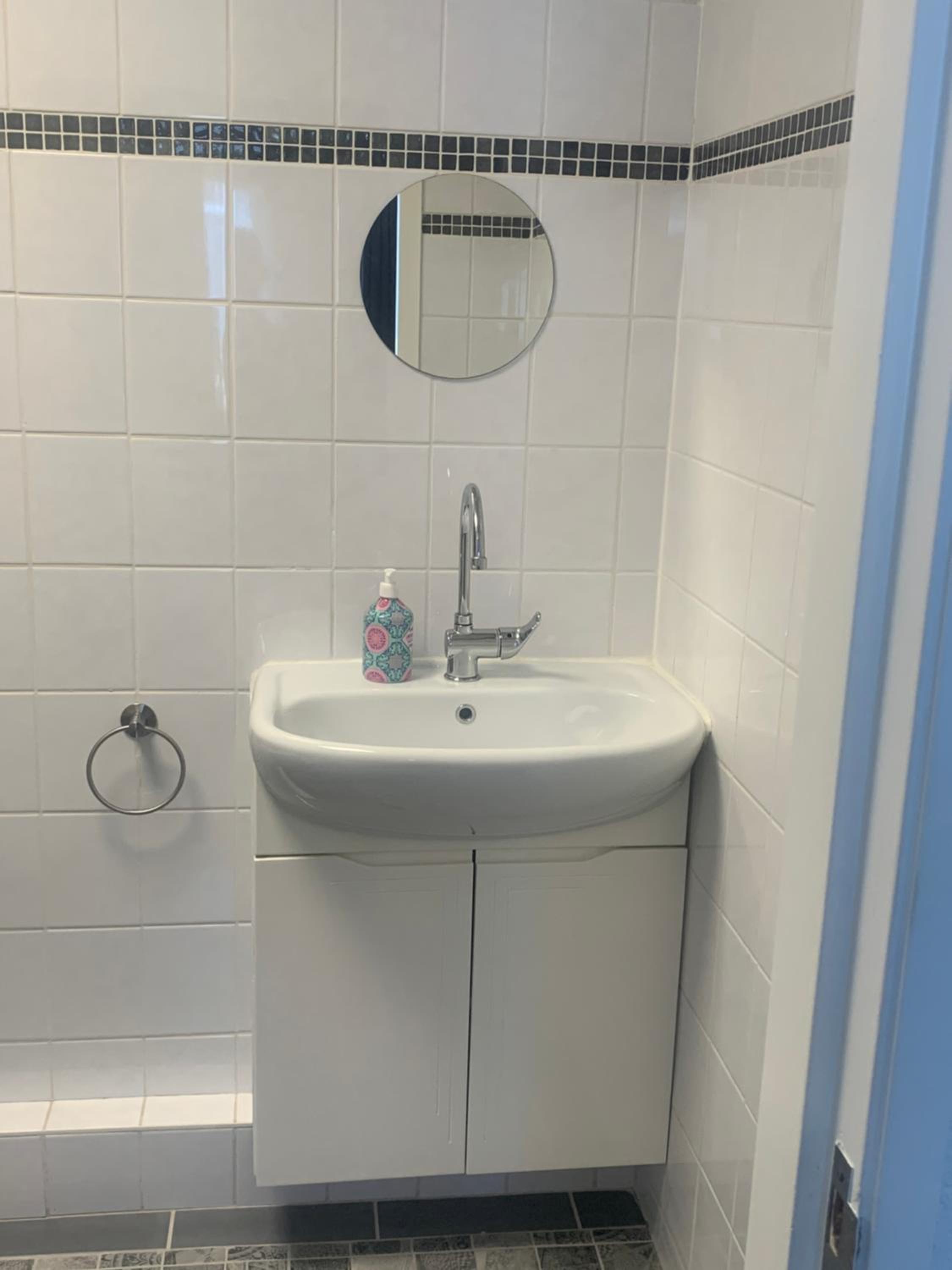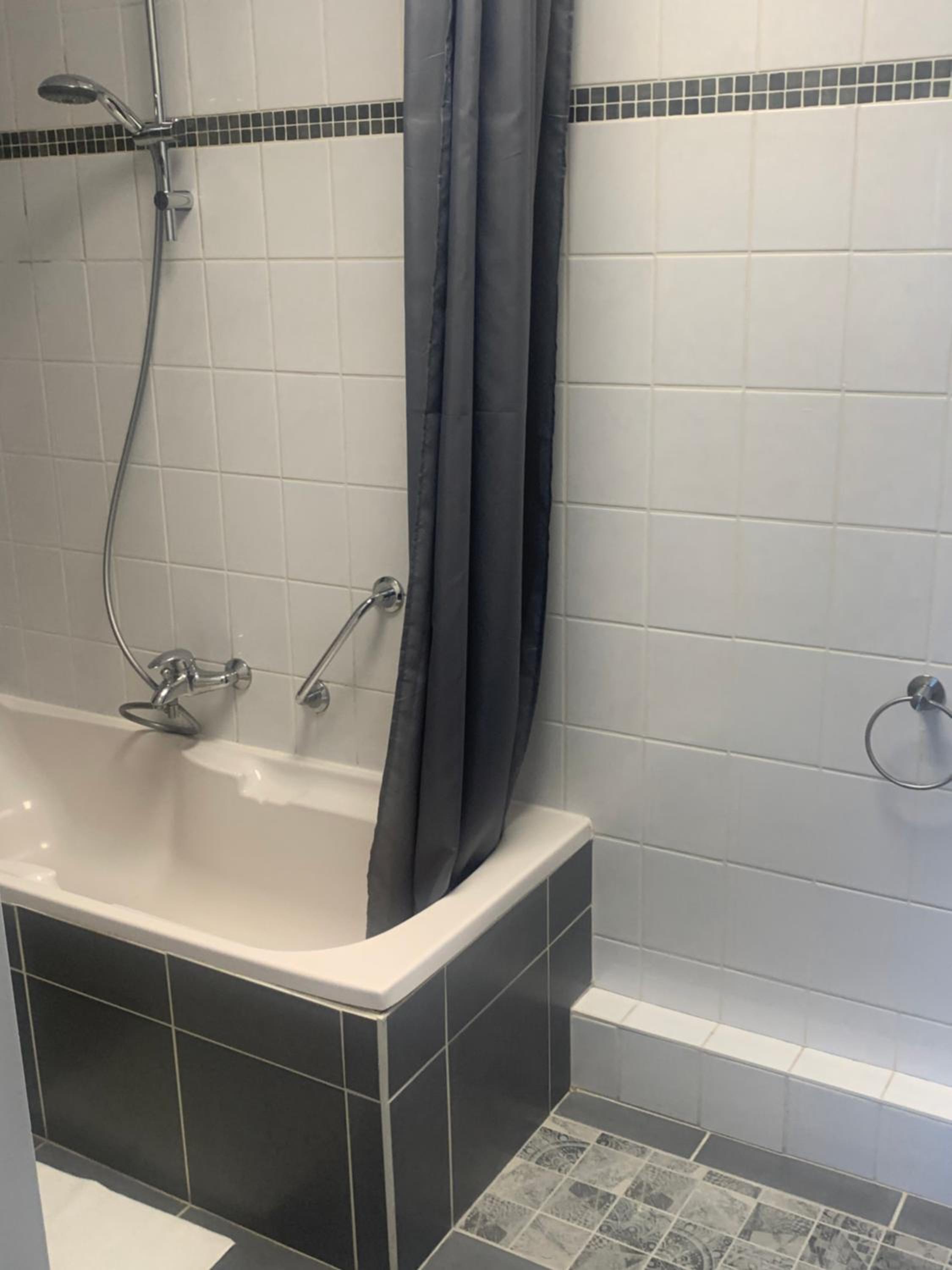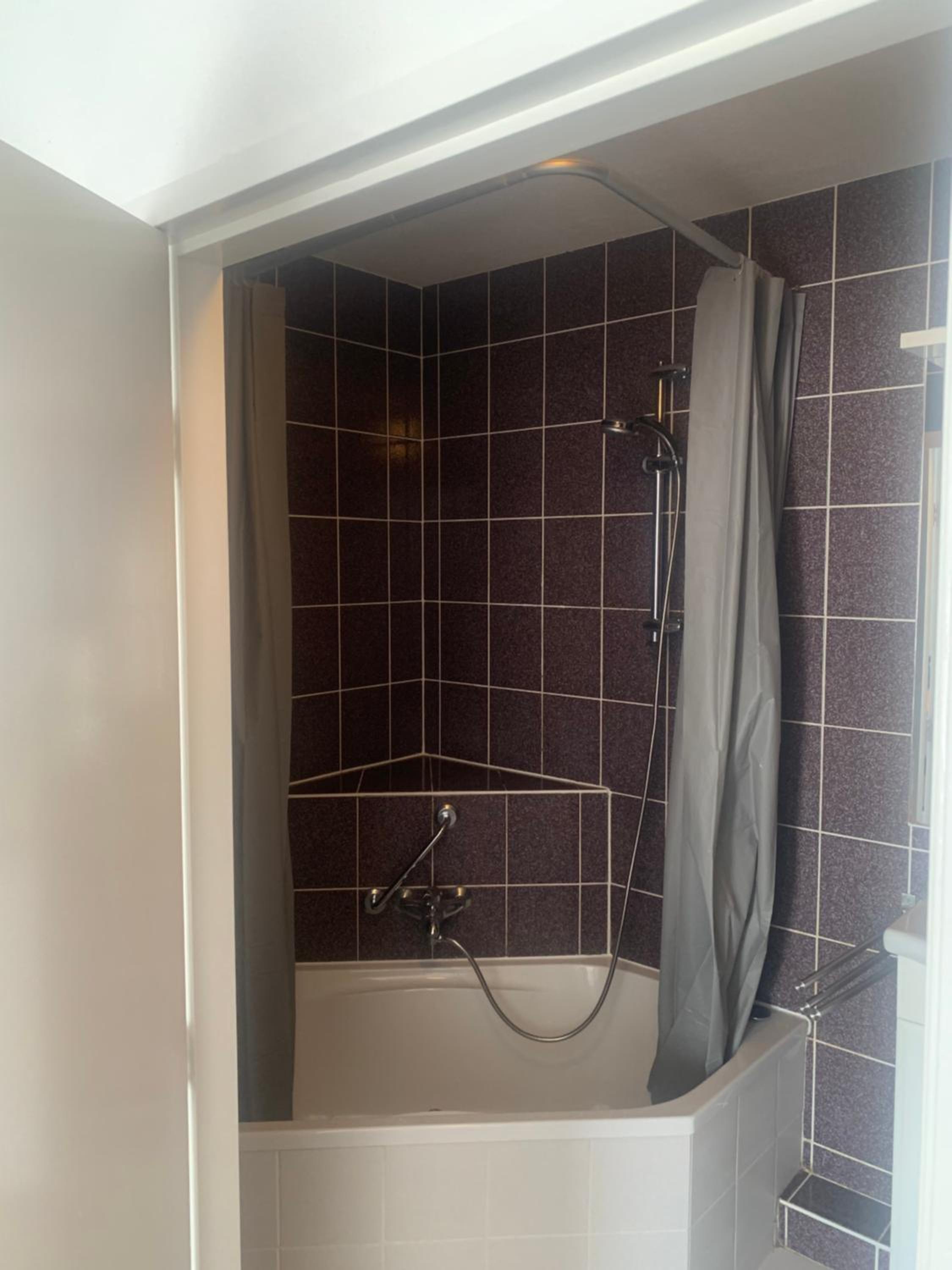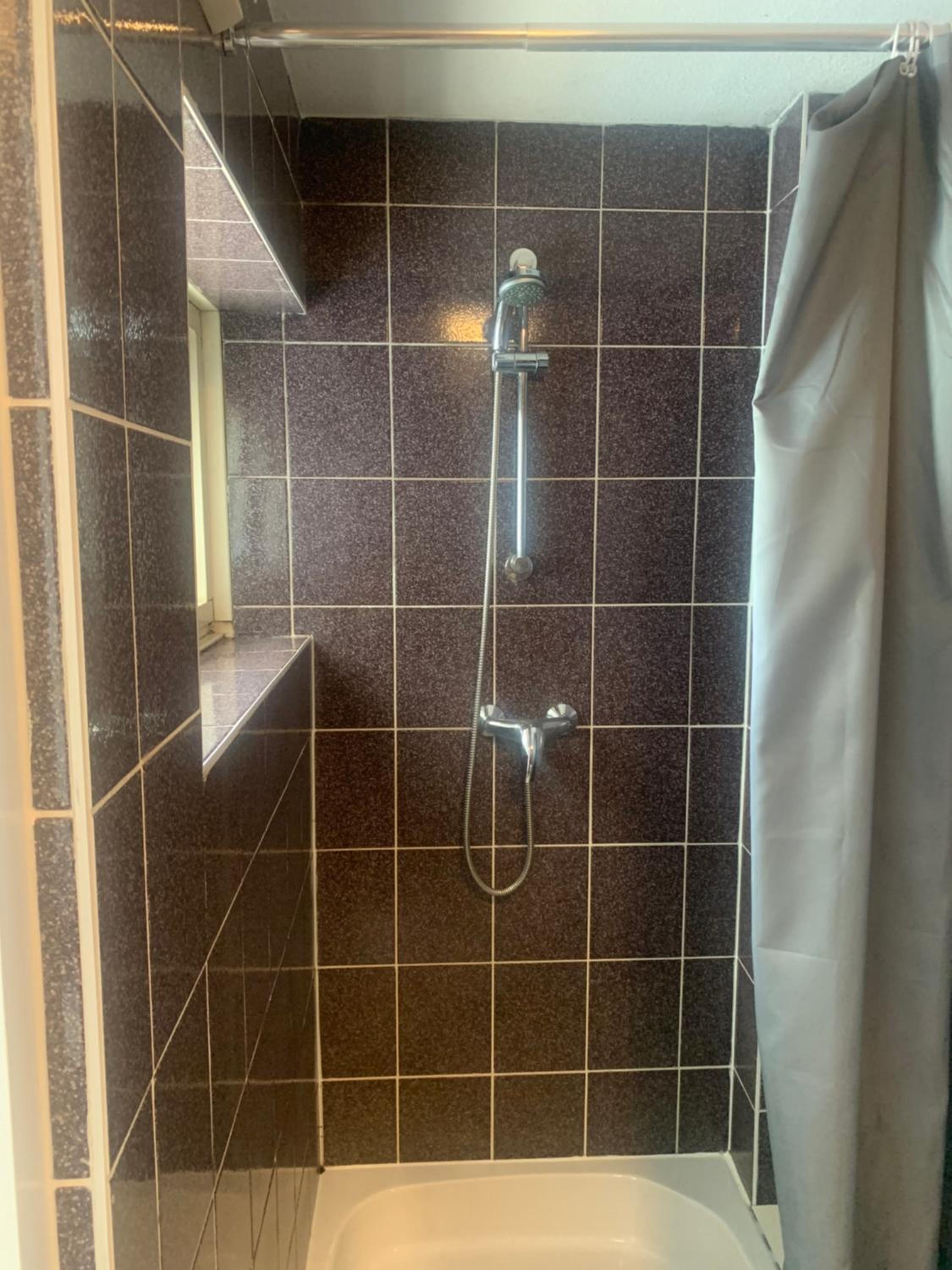 Schimmel op het plafond van de badkamer. Douchekop moest vastgehouden worden. Zeepdispenser was leeg.