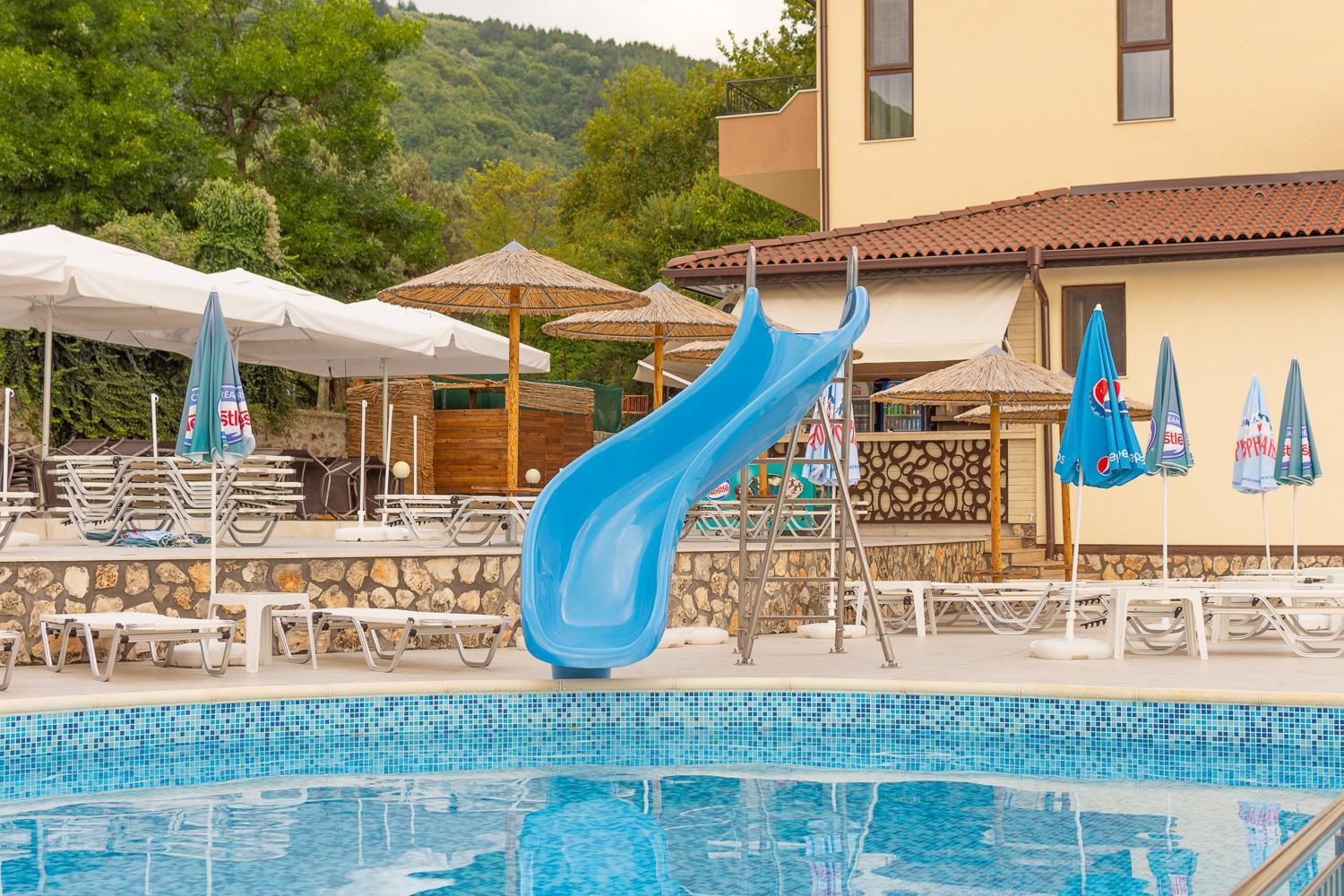 Добър и чист басейн с водна пързалка. Хубав ресторант и удобна хубава стая с голям балкон. Удобно легло и просторна баня. Приятна закуска но нищо особено.