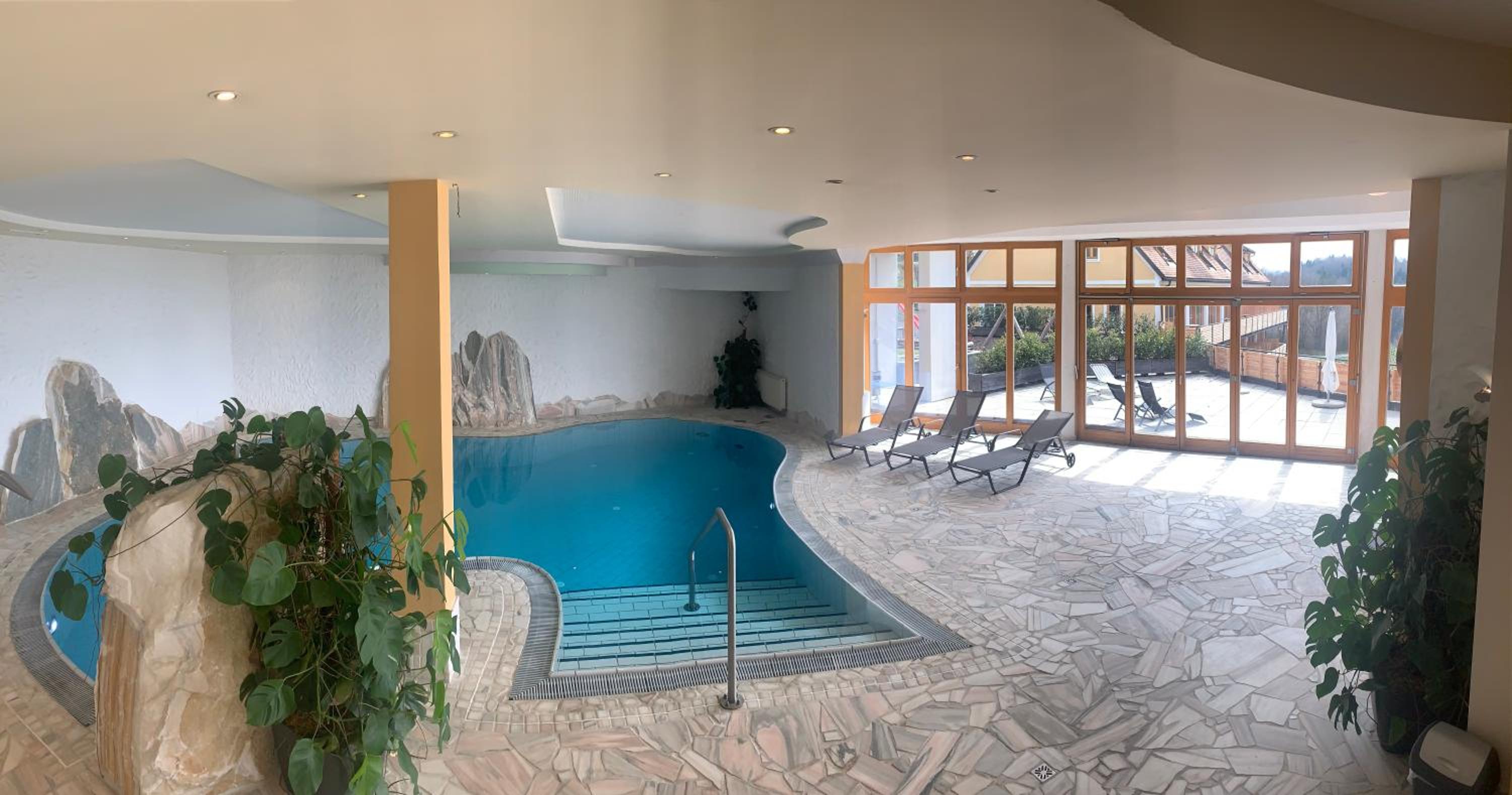Badelandschsft und Sauna war 2022 noch voll funktionsfähig (Dampfbad, Infrarotkabine, Wasserspiele im Becken)