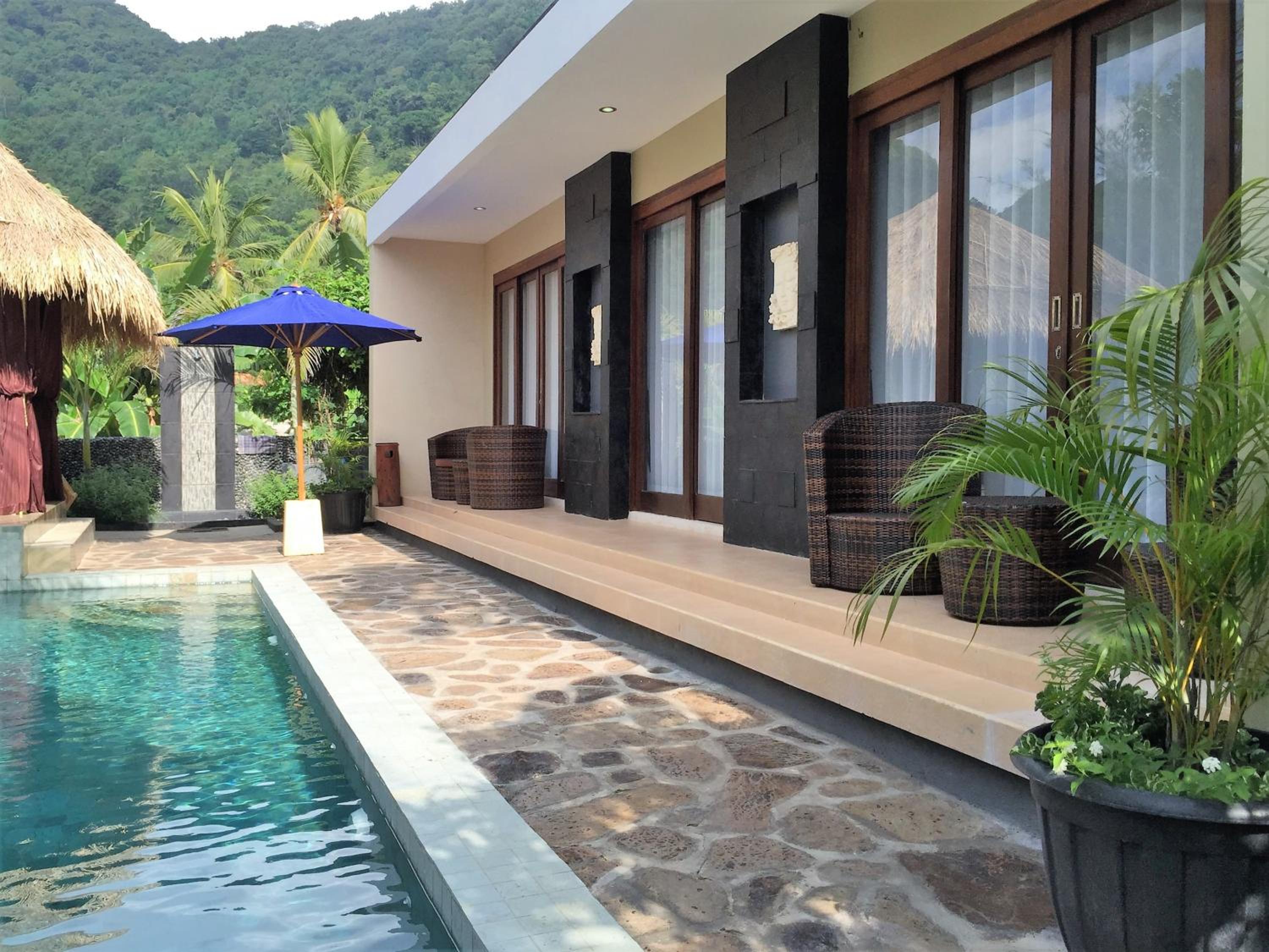 Large room and bathroom, comply bed and pillows, with nice sized pool. Staff helped us fix our bike when the battery ran flat. 5 min Walking distance to nearest beach for turtle snorkelling. There are lots of local stalls offering fish dishes, just come prepared with google translate.