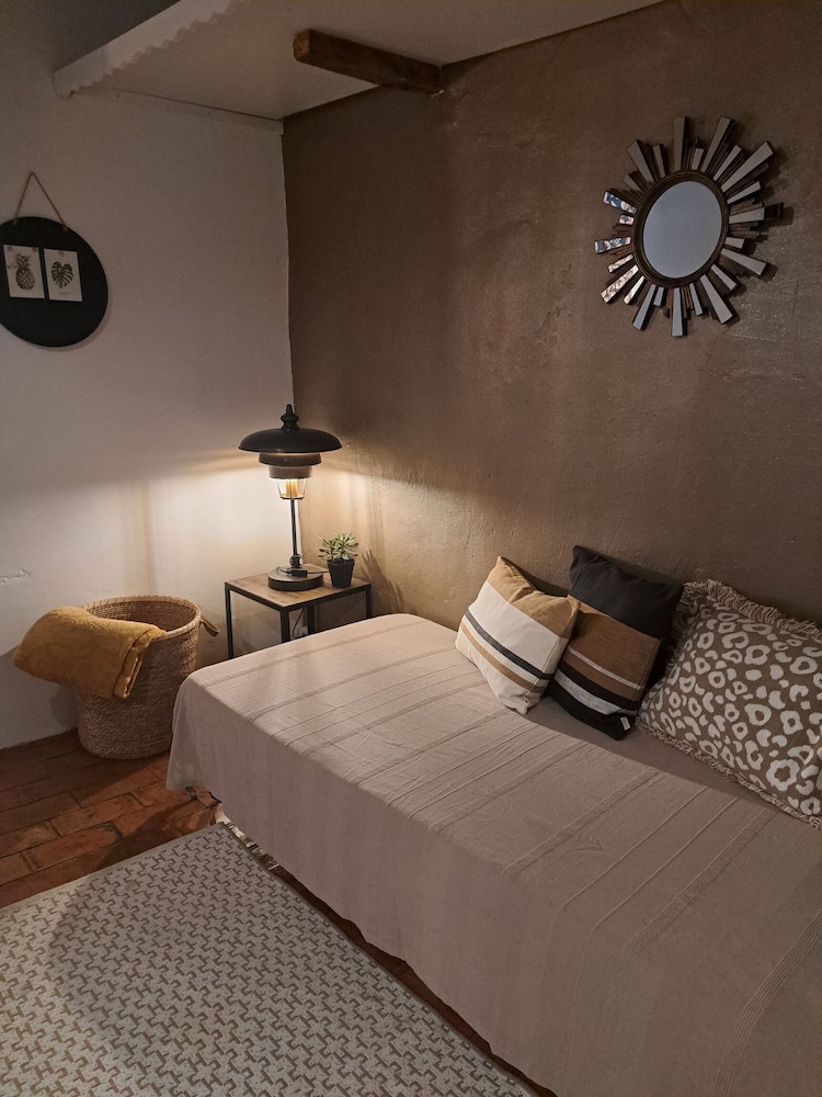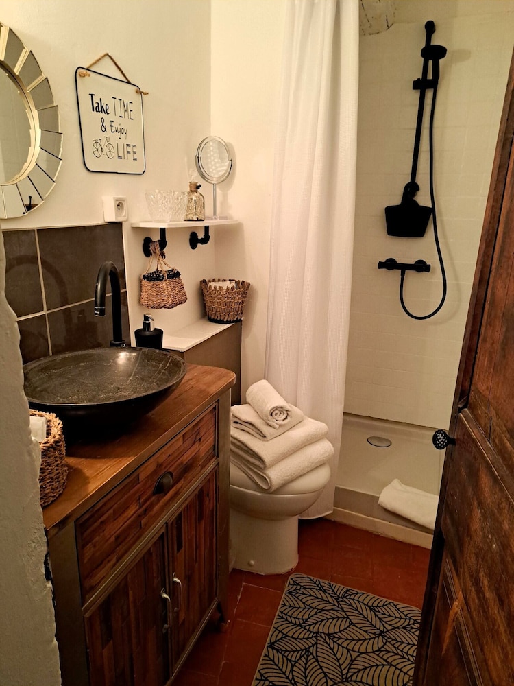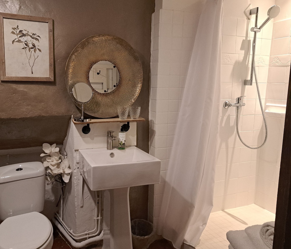 Chambre très peu fonctionnelle car sol en pente, lit sur une estrade dangereuse et salle de bains minuscule avec les toilettes dedans. Dommage car le lieu est charmant.