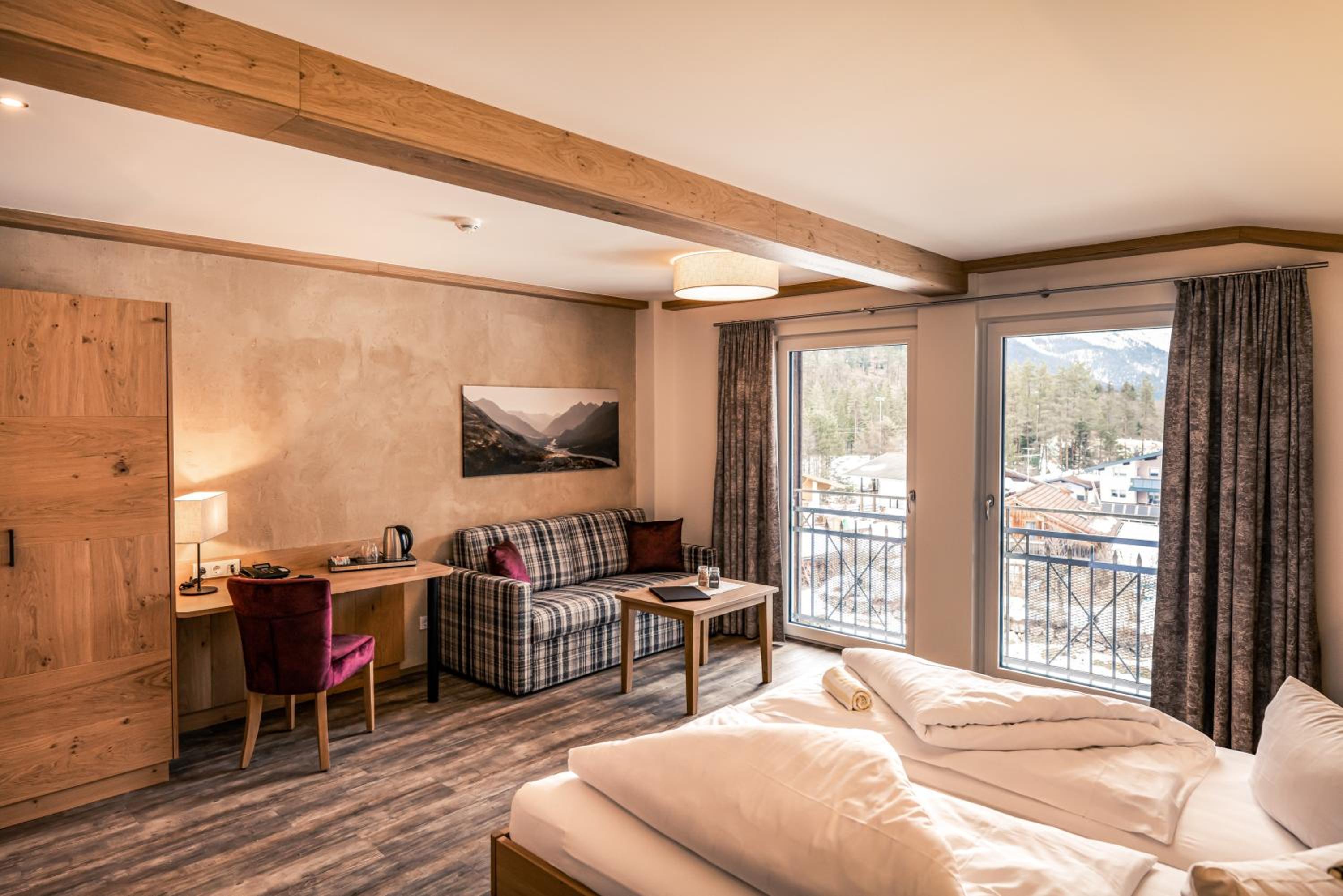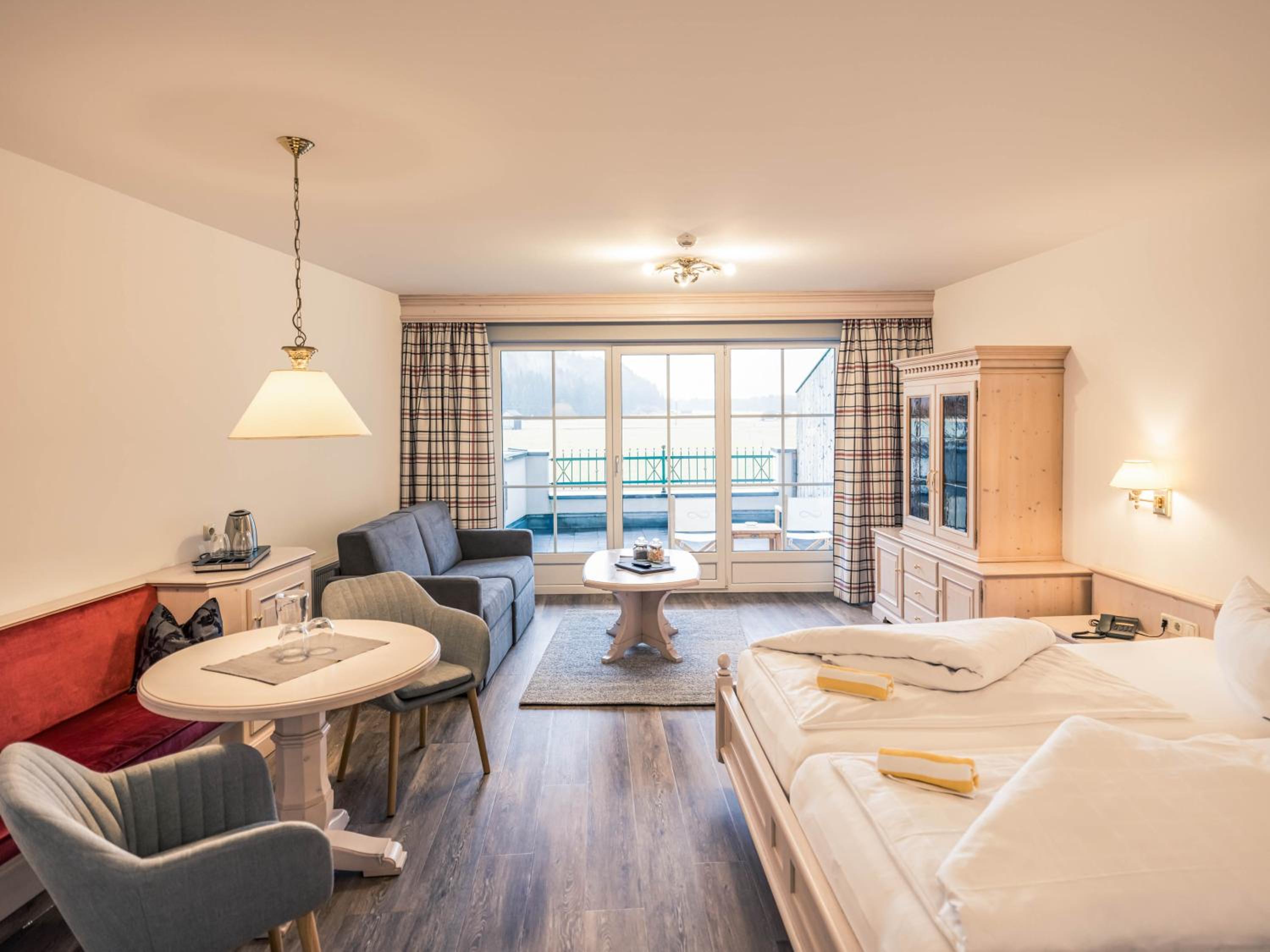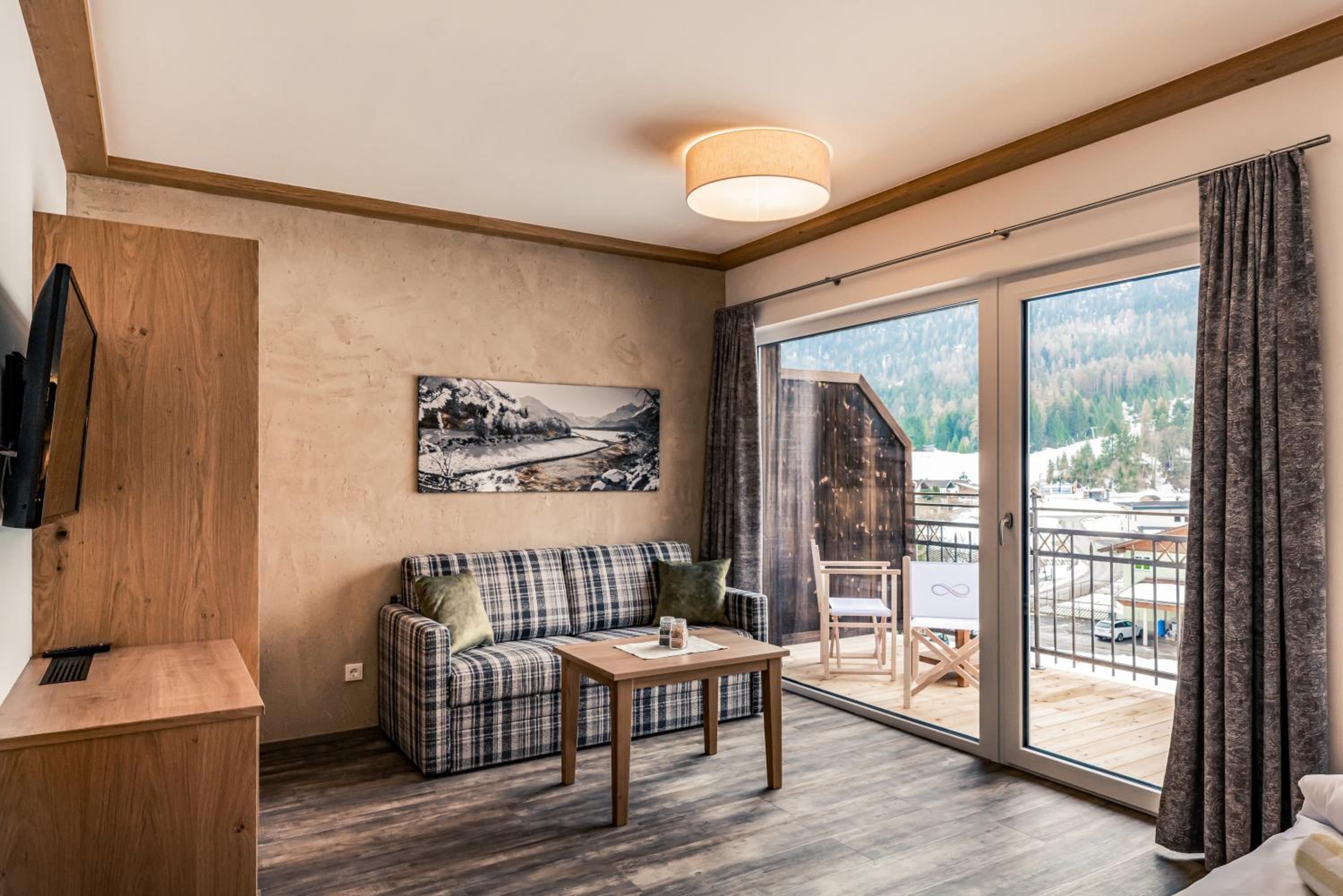 Großes Zimmer mit Balkon und Ausblick auf die Berge.