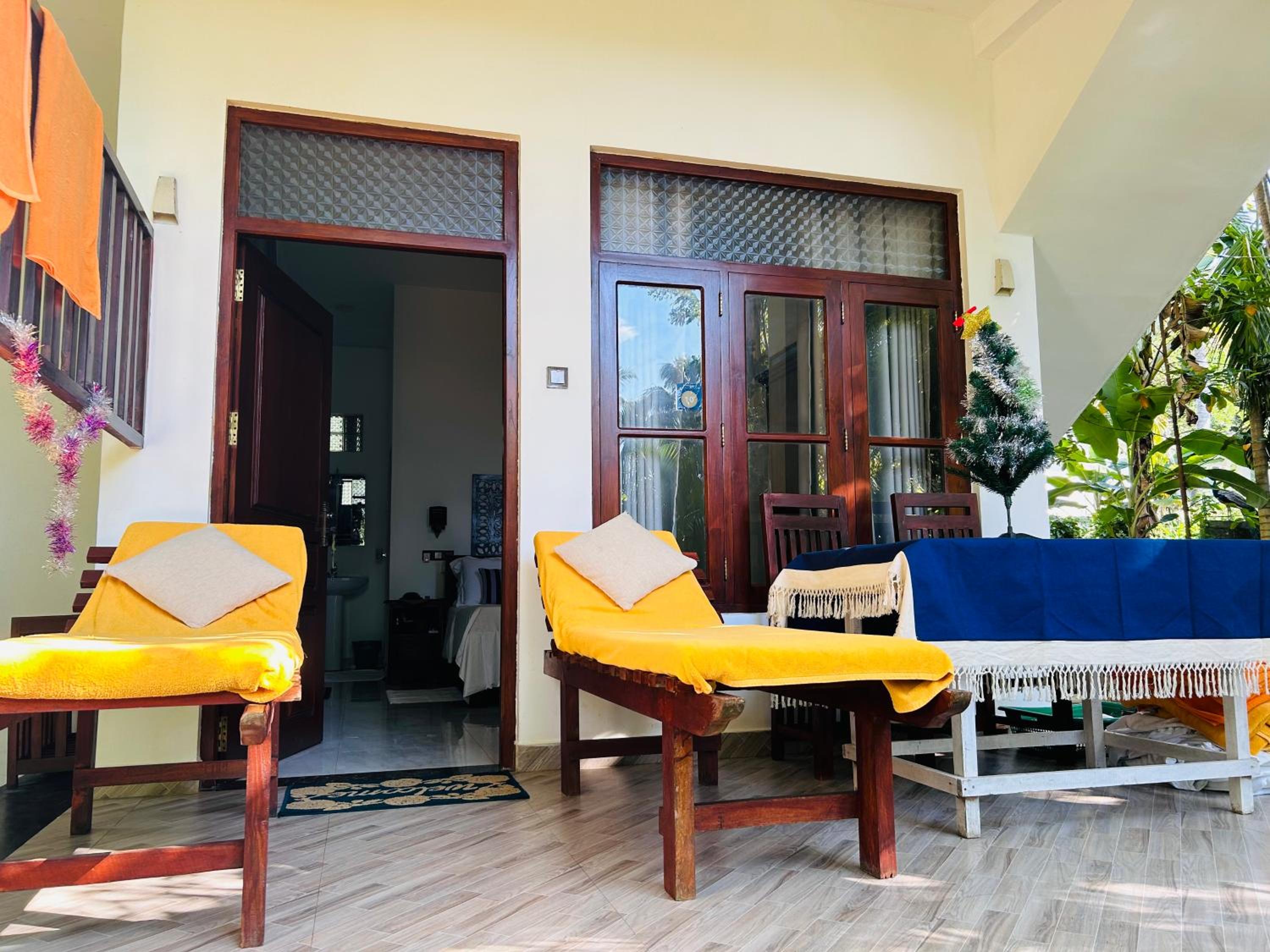 Замечательная вилла с очень приятными хозяевами. Есть веранда с лежаками и видом на чудесный сад, на ней же проходит завтрак, который включен в проживание. Есть все необходимое для проживания, все очень чисто, без насекомых. До пляжа пару минут ходьбы
